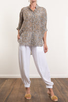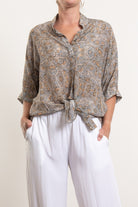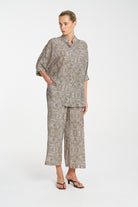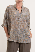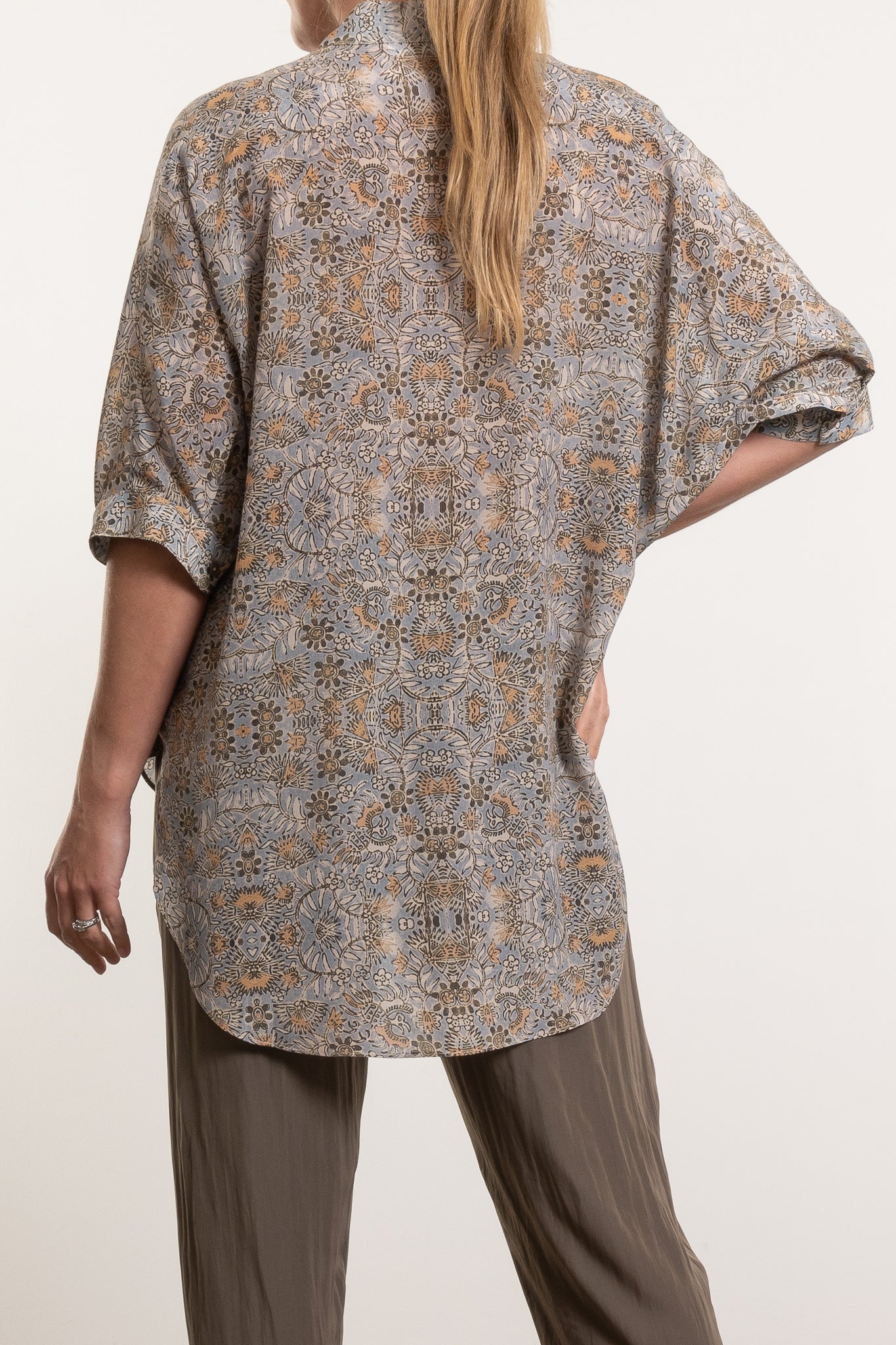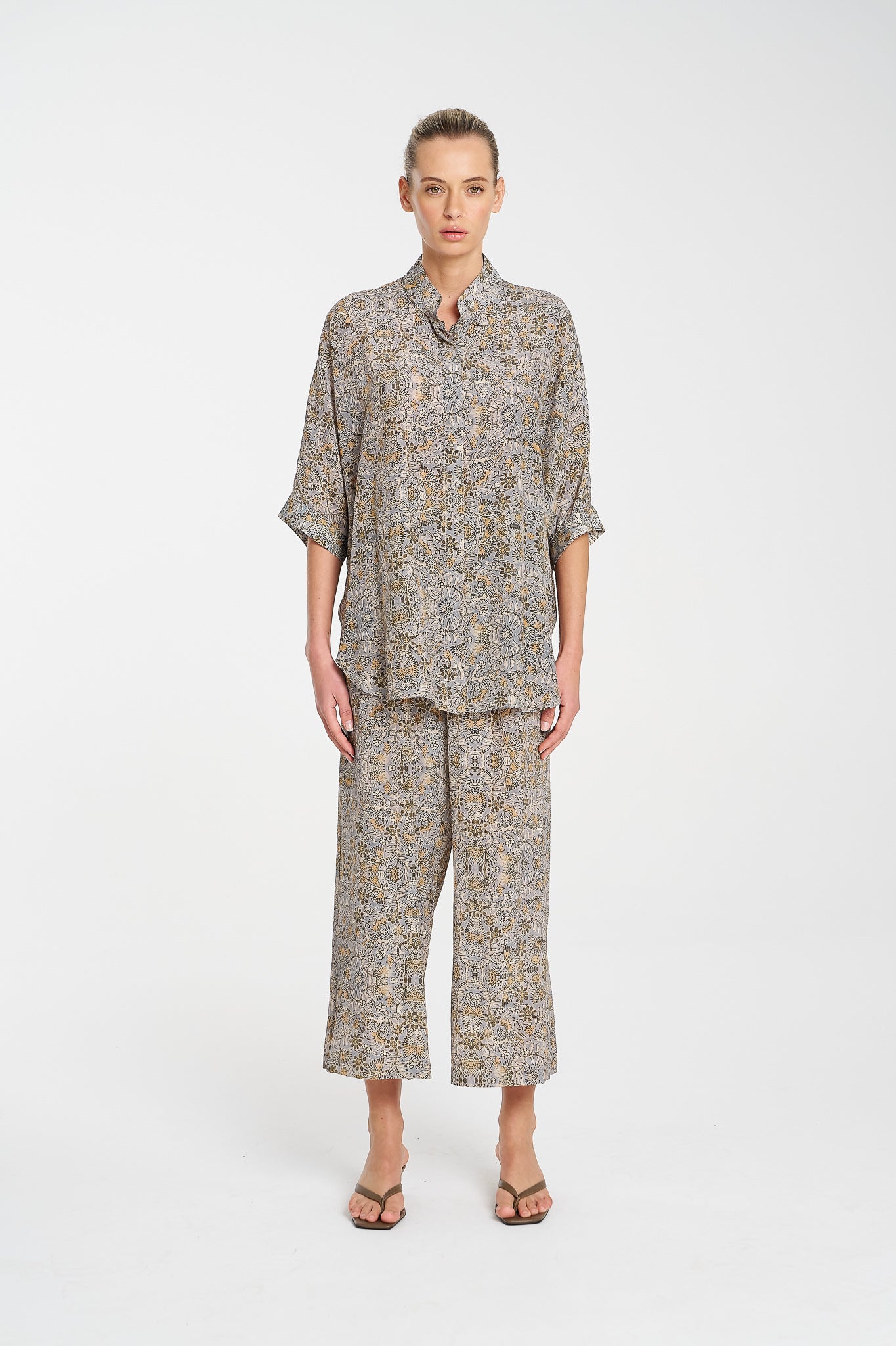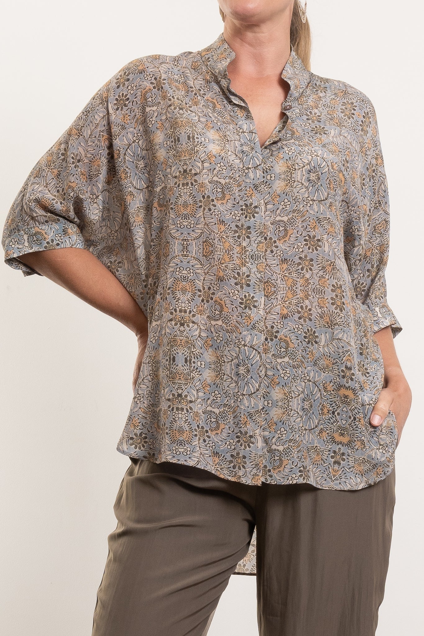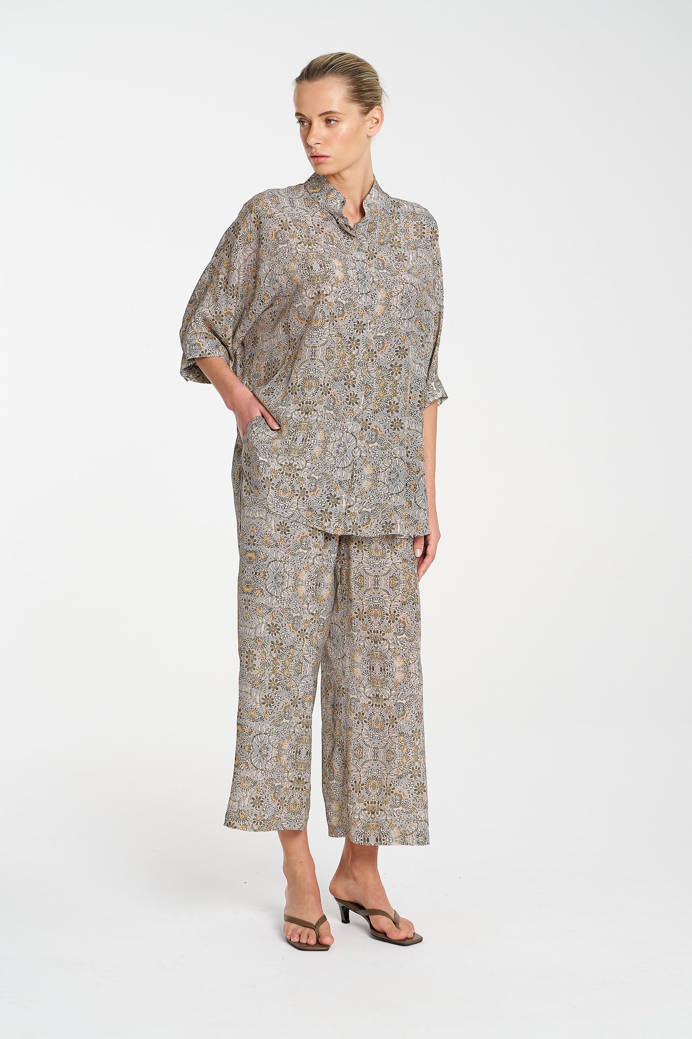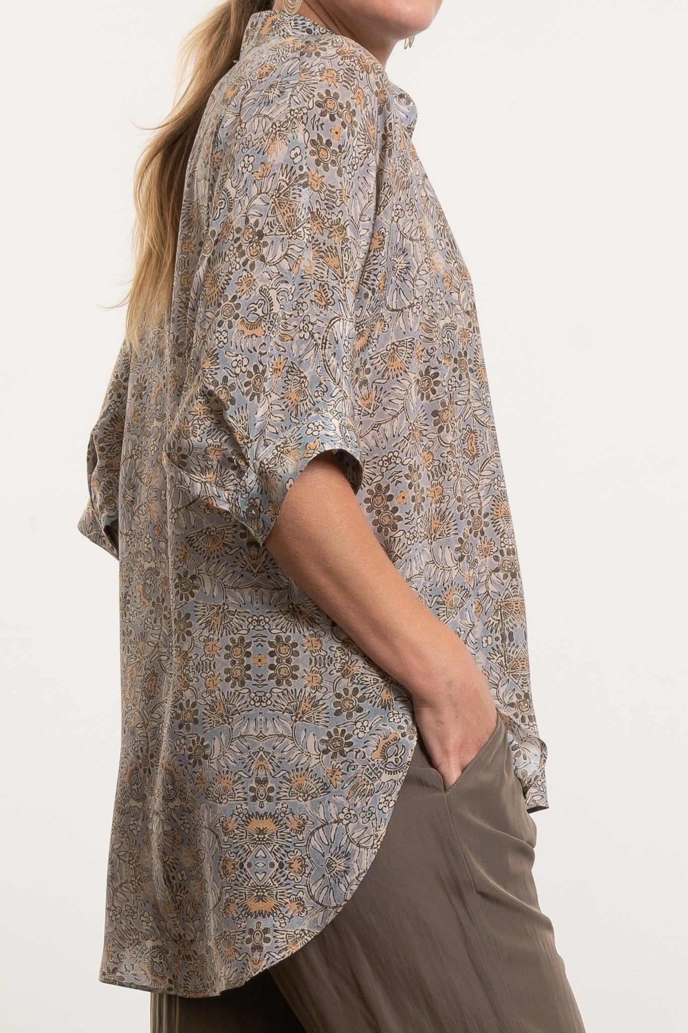 Crafted from Mela Purdie’s mid-weight, soft-washed Silk Crepe de Chine, the Villa Overshirt showcases the elevated Spinifex Print — a subtle mix of earthy tones that blend beautifully with any capsule wardrobe. Designed for a relaxed fit, it features a stand collar, concealed placket and gently curved hemline for easy movement. Dress it up with tailored pants for dinner or wear it loose over slimline separates for understated summer ease.