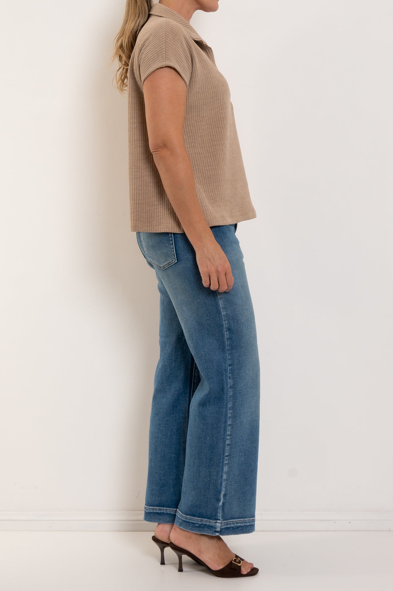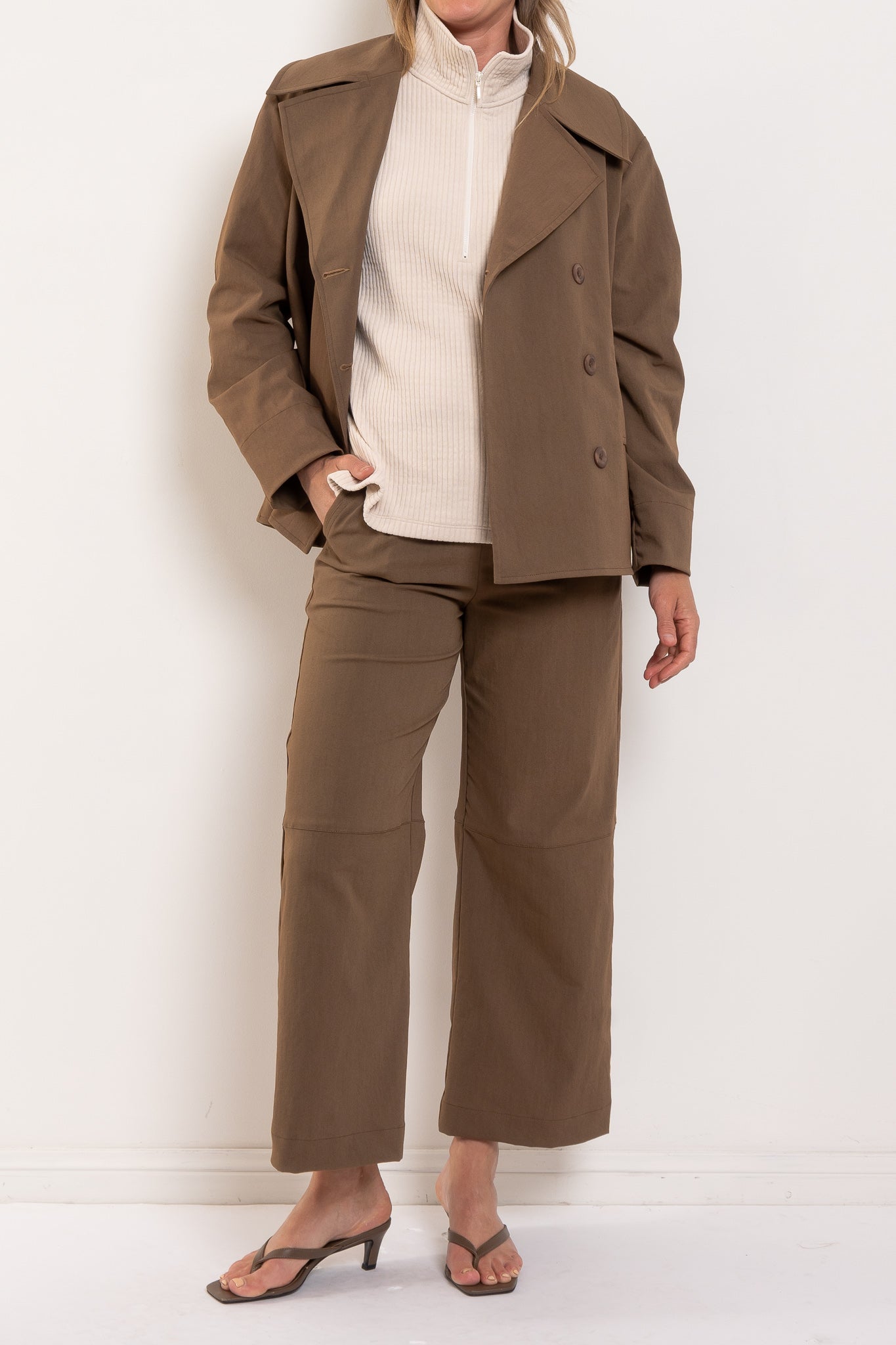 - Mid length silhouette that sits beautifully over pants and skirts