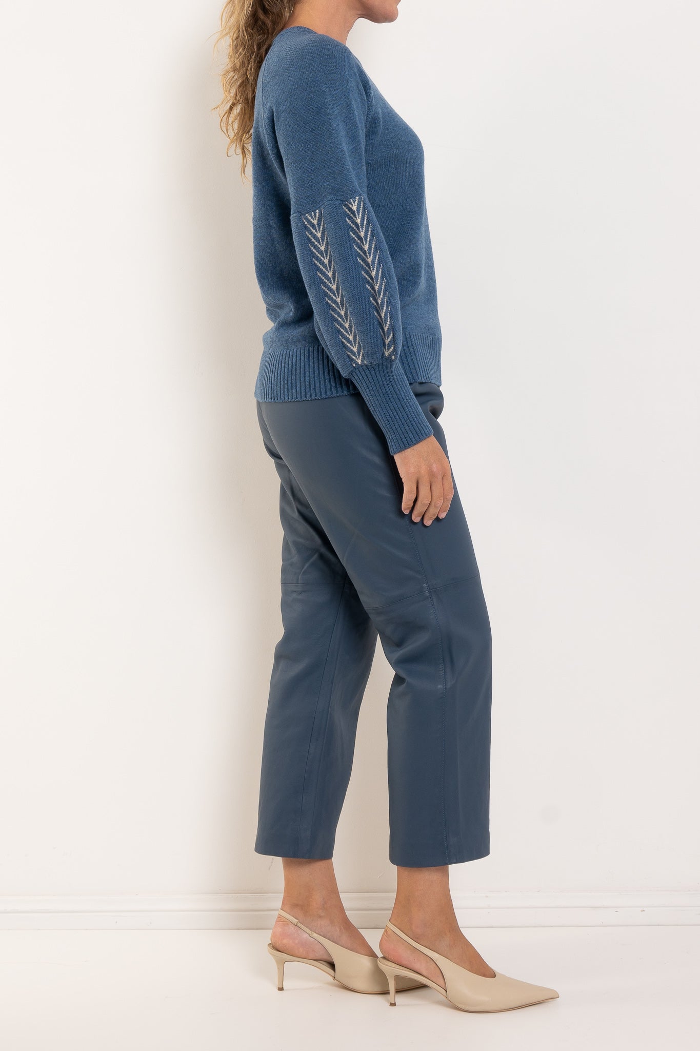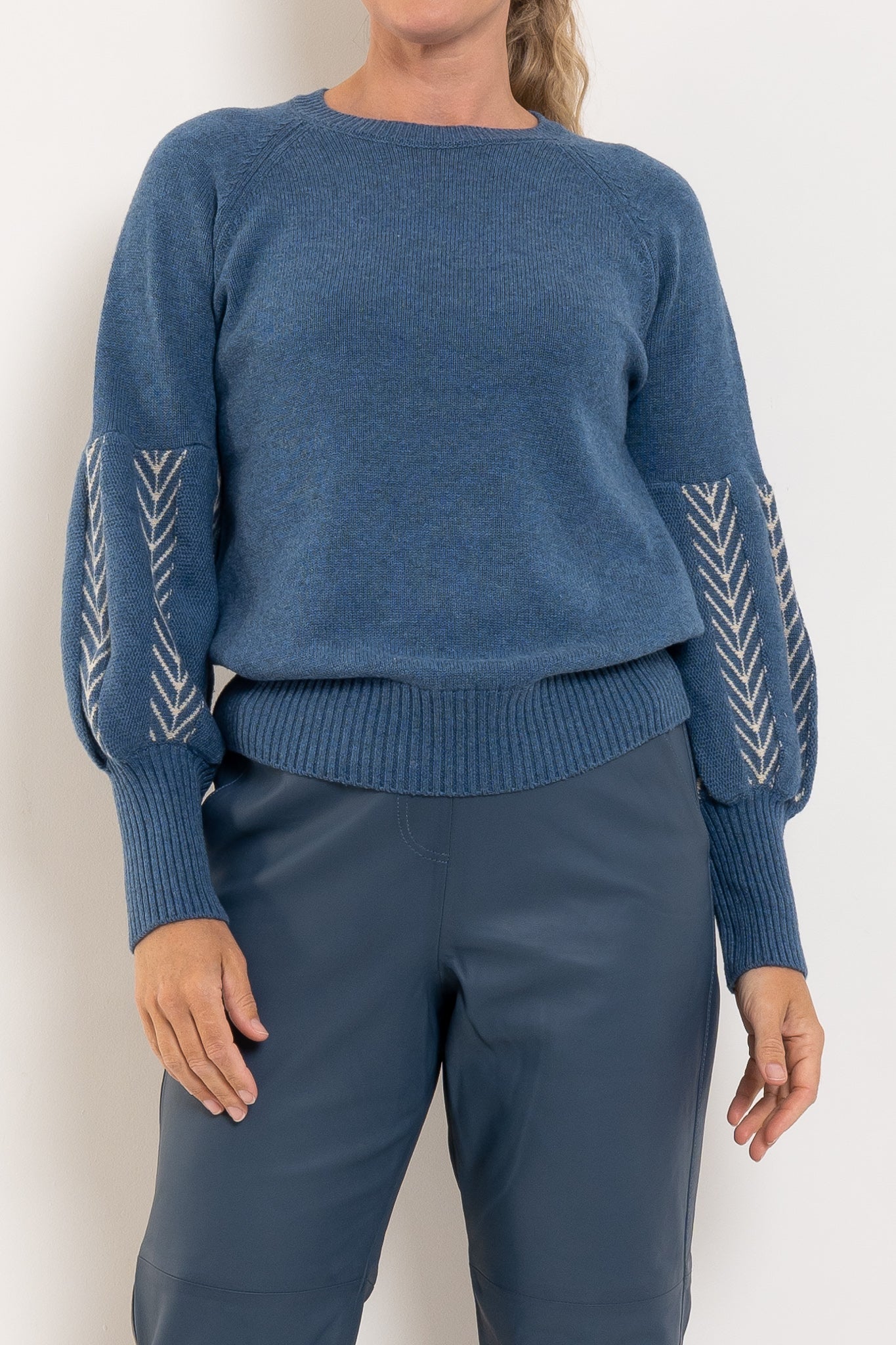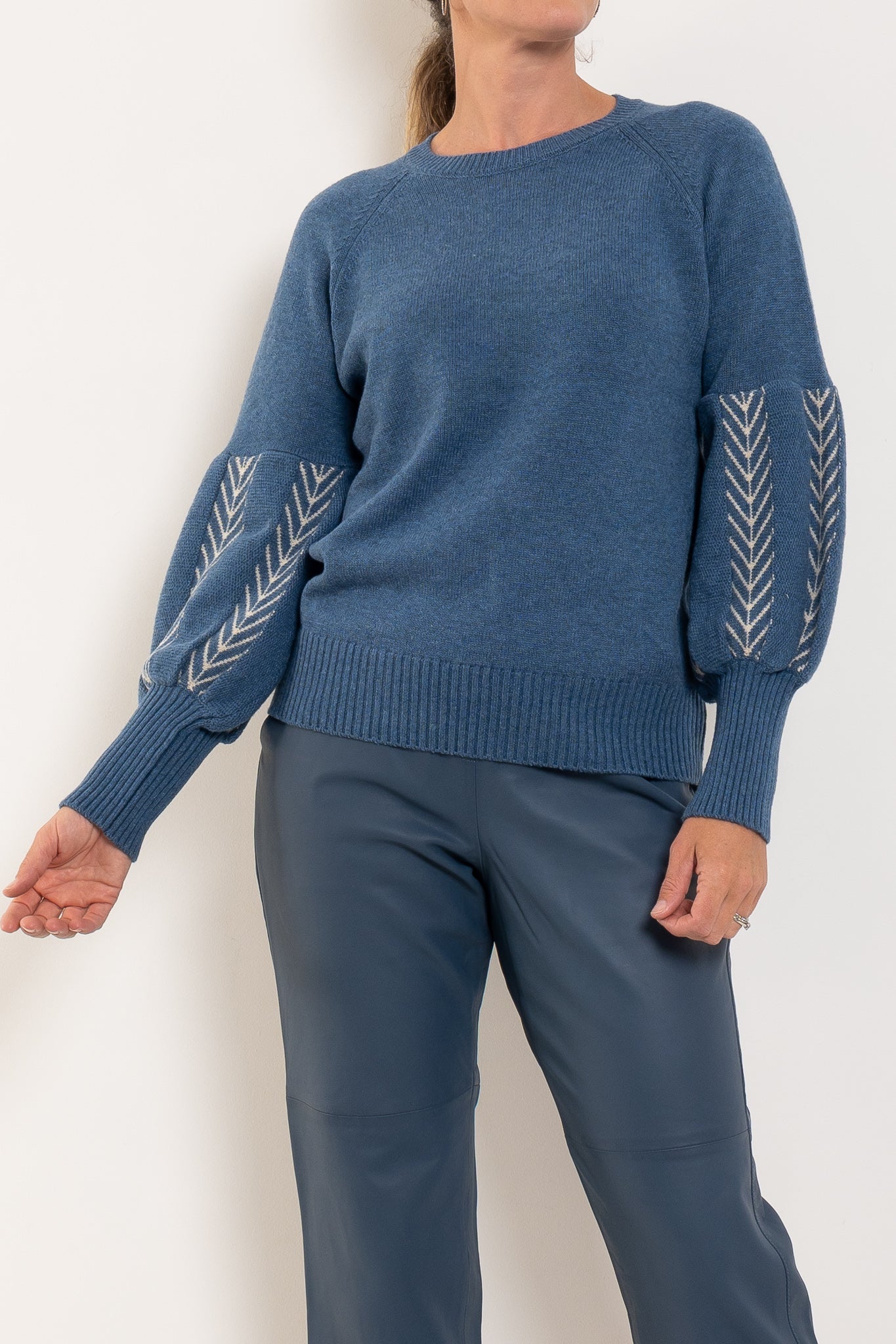 Designed with a classic crew neckline and a relaxed yet polished silhouette, the Arden knit is elevated by intricate jacquard detailing along the sleeves. The subtle tonal contrast creates texture and visual interest while maintaining a timeless, understated aesthetic. Gently blouson sleeves and ribbed cuffs and hem add structure and comfort, ensuring an effortlessly flattering fit.