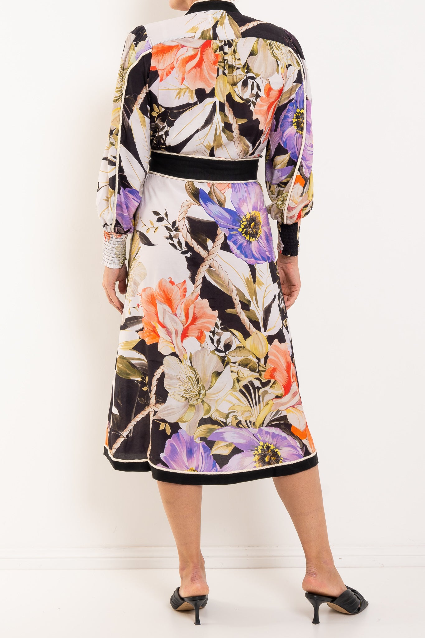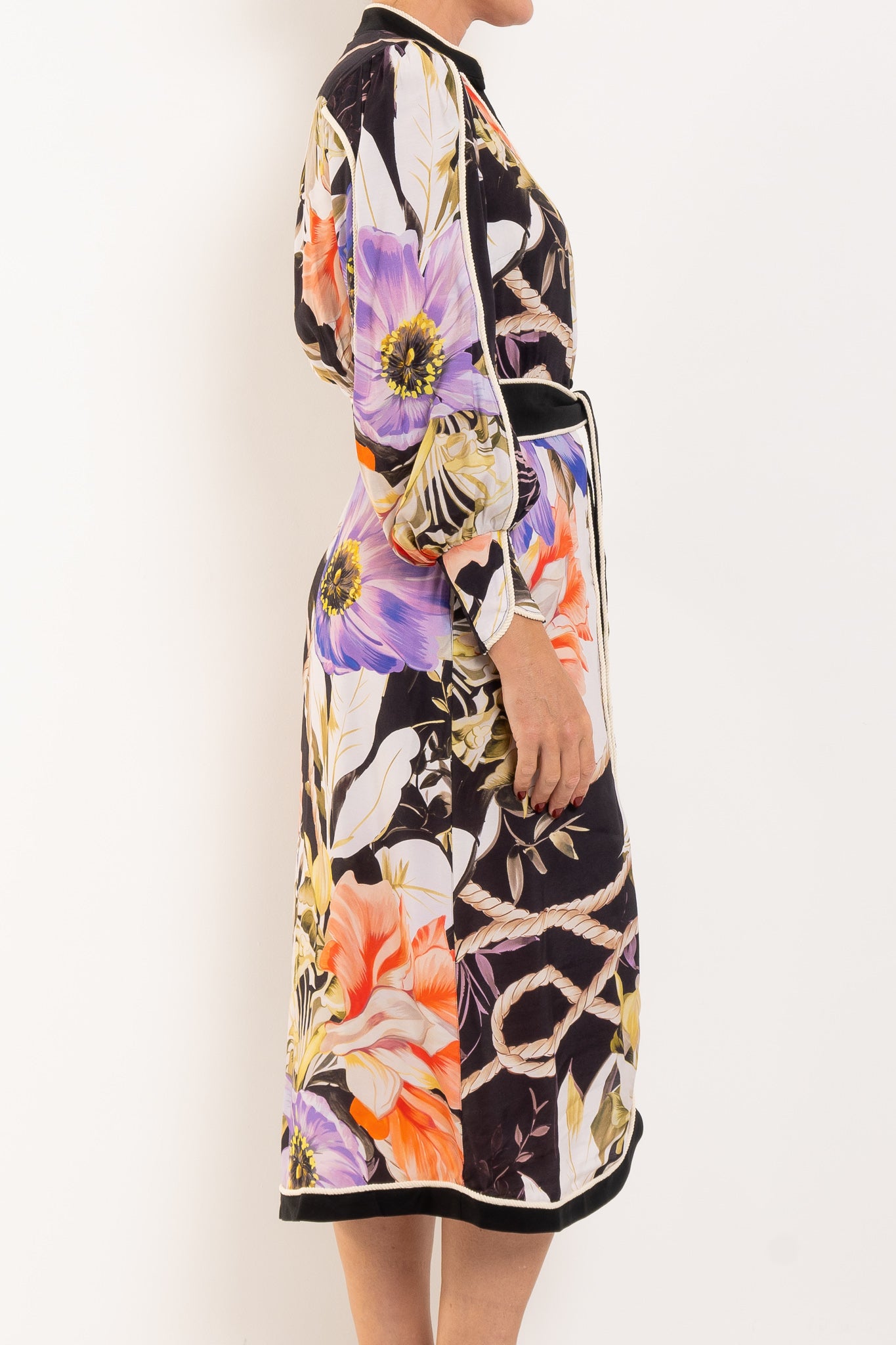 A striking statement dress that commands attention with artistic flair. The Camille Viscose Faille Curved Hem Dress in Tangled Blossom combines luxurious viscose faille with an exclusive oversized floral print layered in graphic contrast—perfect for elevated occasions and resort wear. The structured, smooth drape creates a polished silhouette that moves gracefully, while the signature rope detail belt cinches the waist with handcrafted artistry. A deep V-neckline with contrast trim, softly bloused long sleeves, and a curved hemline that elongates the figure complete the refined aesthetic. The front split adds effortless sophistication to this modern, feminine design. Ideal for gallery evenings, special events, and refined resort dressing—a dress that speaks to confident, cultured style.