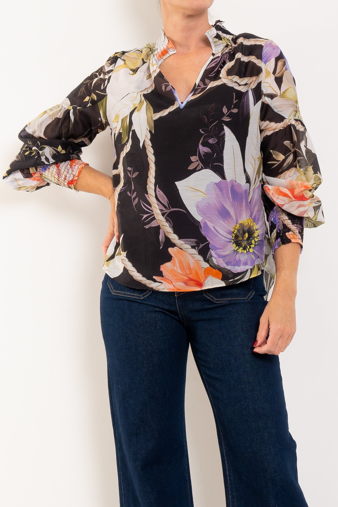 Meet the Colette—your new go-to for that effortless polish that feels anything but basic. This cotton silk blend is soft, breathable, and catches the light just right, giving you that subtle luxury without trying too hard. The Tangled Blossom print is where it gets interesting: moody florals in lilac, ivory, citrus and black that somehow work everywhere. A shirred collar adds unexpected texture at the neckline, while the V-front is genuinely flattering. Bloused sleeves with elasticated cuffs give you movement and ease—no stiffness, just flow. Tuck it into leather trousers for a sharp moment, or wear it loose and let it do the work. From morning meetings to evening plans, this blouse moves with you.