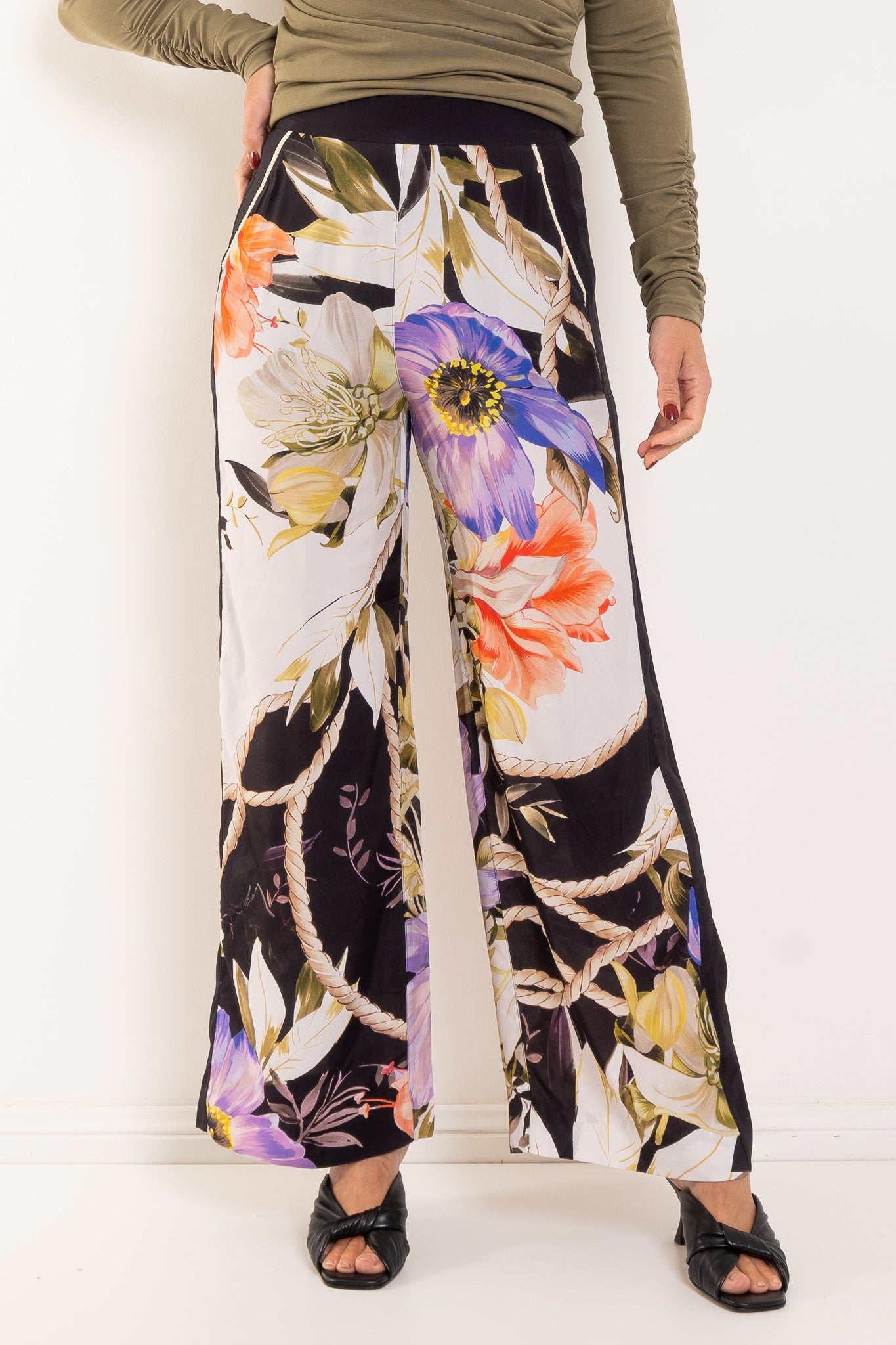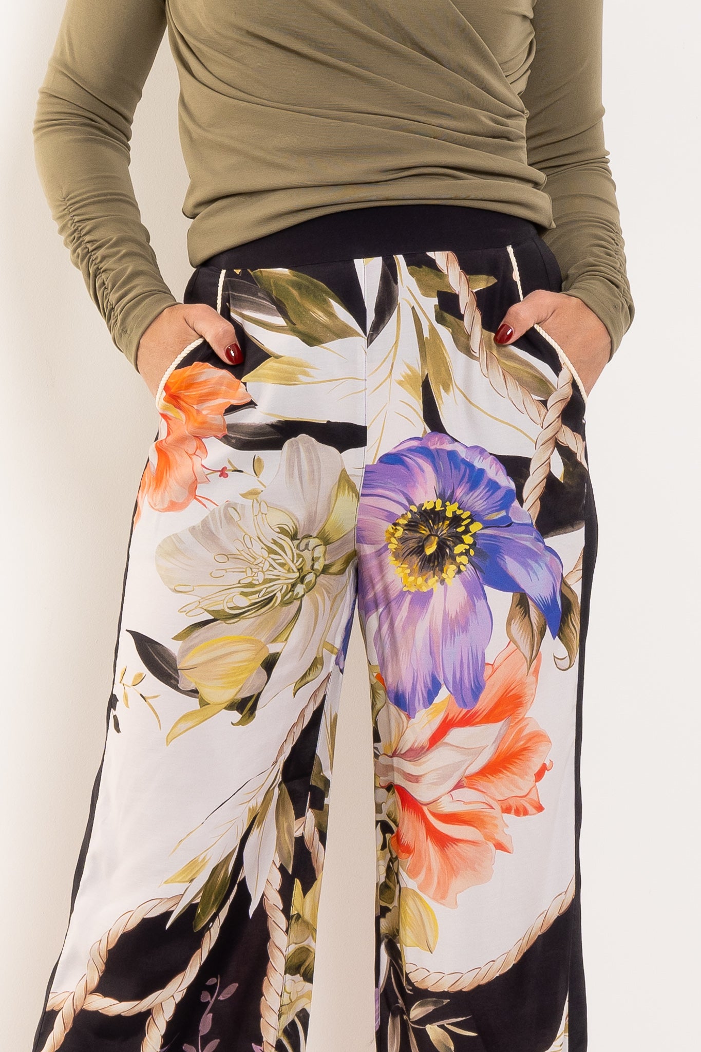 Own your presence in the Sorrel Wide Leg Pant. These aren't just pants—they're a statement piece that moves with you, blending contemporary edge with effortless grace. The standout? A bold floral print layered in black, ivory, lavender, and soft citrus that demands attention. Rope-inspired detailing adds unexpected texture, while the flowing wide-leg silhouette elongates and flatters in all the right ways. Lightweight fabrication means you stay comfortable all day, every day. Practical meets polished: a supportive waistband and functional side pockets keep you grounded while you make your mark. Wear them solo for maximum impact, or pair with the matching top for a coordinated moment. Either way, you've got this.