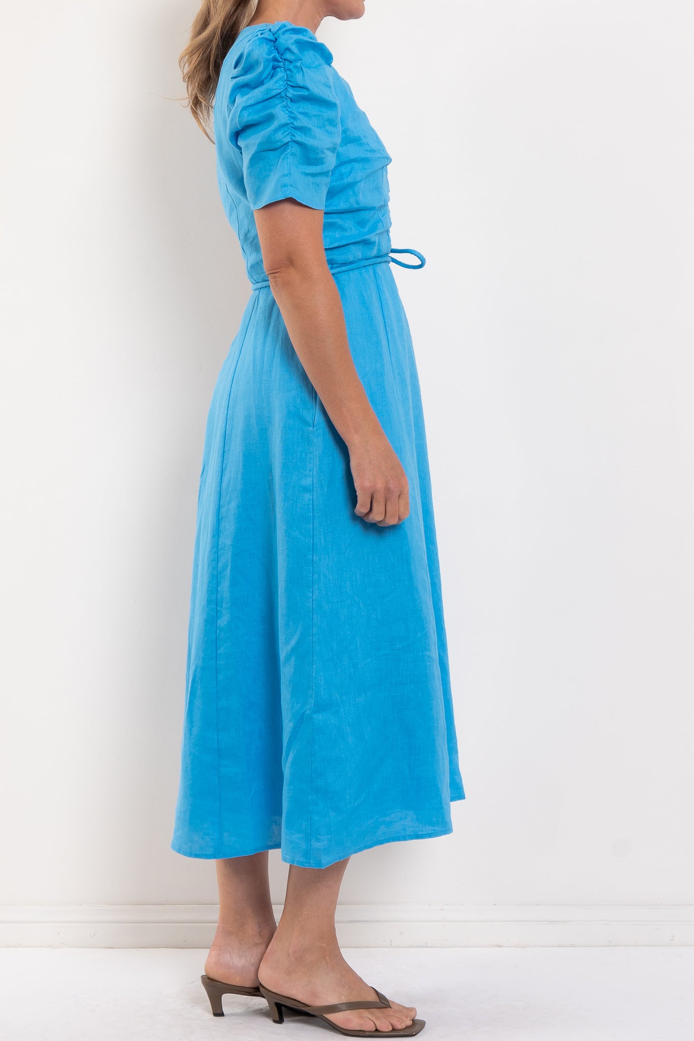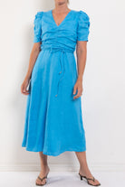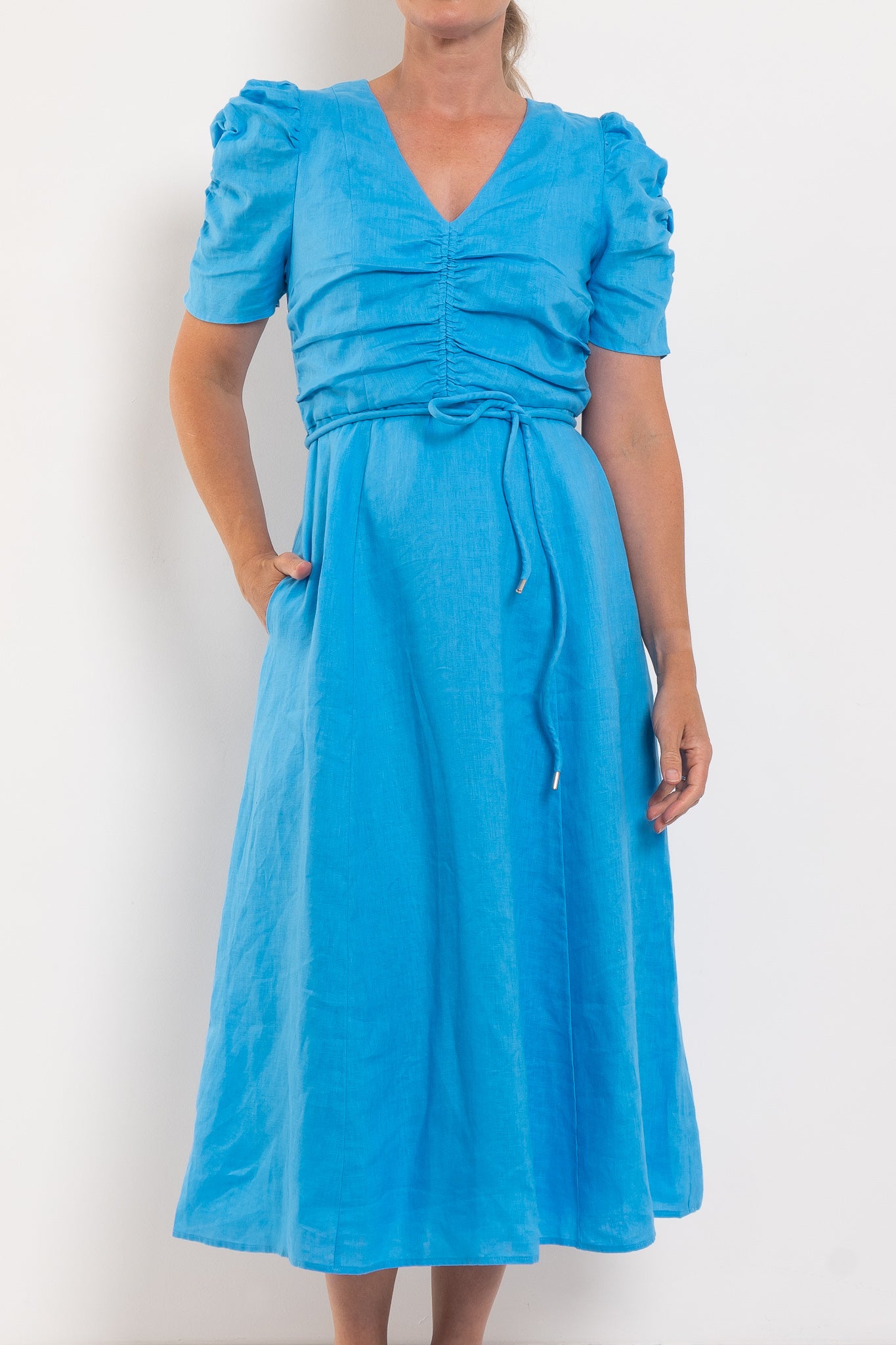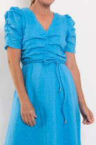 Experience understated luxury with the Zoe Kratzmann Glimmer Dress, expertly tailored in breathable linen. The elegant V-neckline draws the eye inward with carefully placed front gathers that extend into softly bloused sleeves, creating dimension and grace. See full product description below for fabric and fit info.