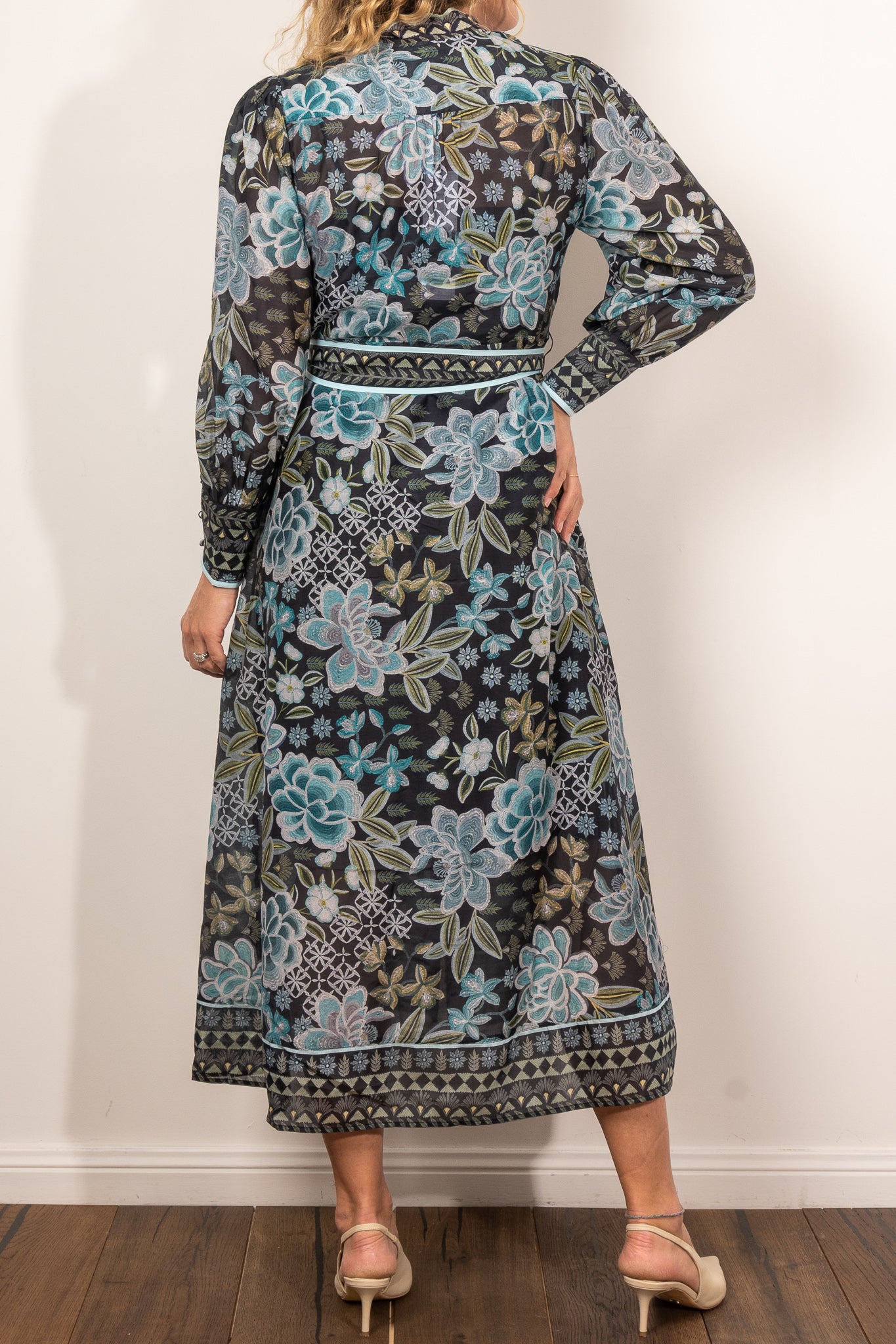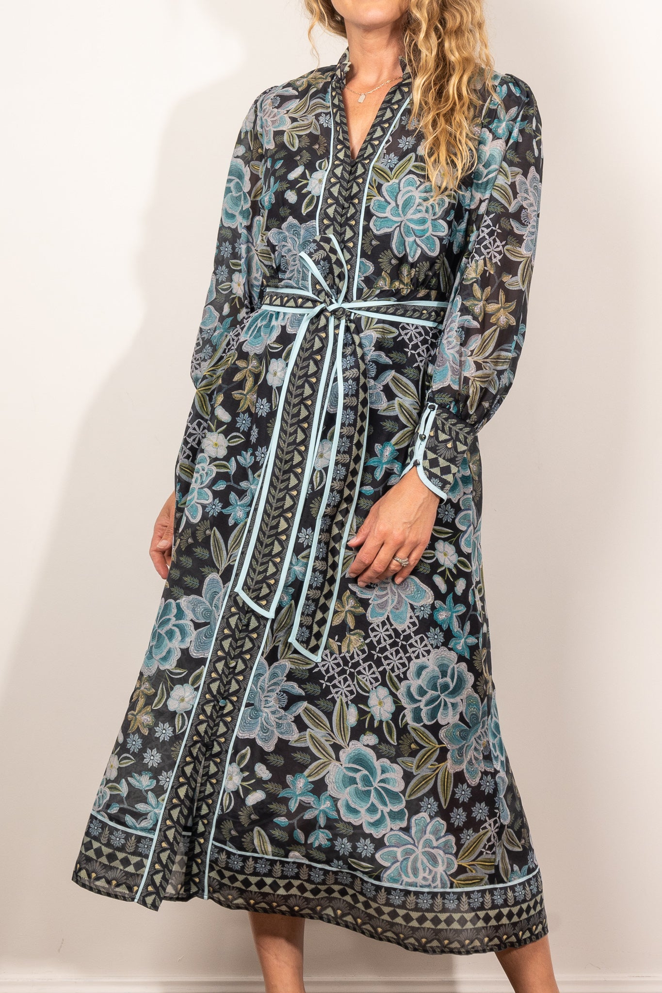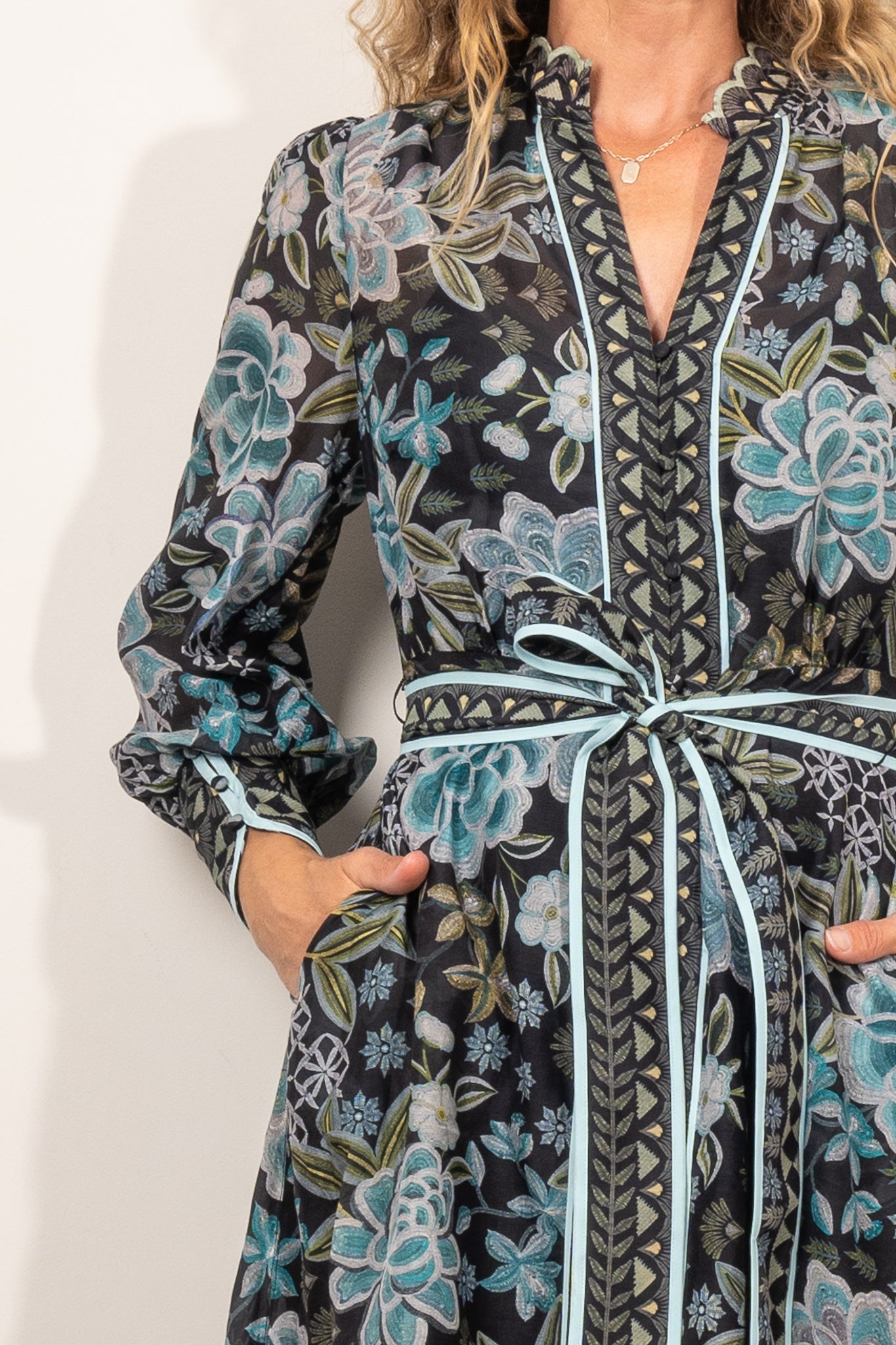 Indulge in elegance and comfort with our Sienna Dress in Dahlia Fields. The exquisite floral print in deep hues of teal, cream, and sage green makes a statement while the cotton-silk blend ensures a soft, lightweight feel. Features include a tailored waistline, button down front, and removable waist tie for a chic silhouette. Pair with boots for a flawless day to night look.