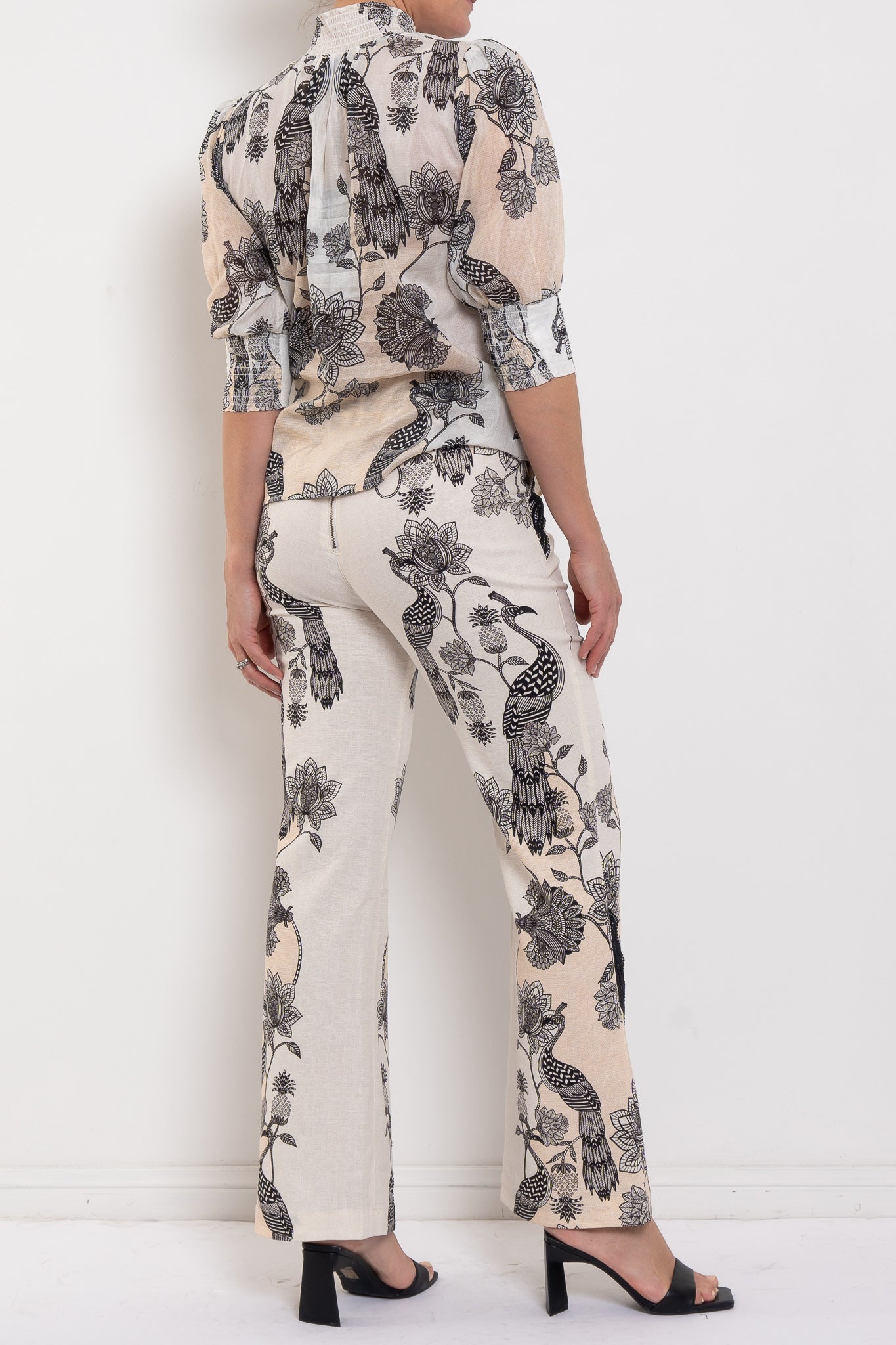 Crafted from a soft cotton–silk blend, Oleander drapes with lightweight fluidity while offering all-day comfort. The shirred collar and V-neckline create a flattering frame for the face, while three-quarter sleeves add effortless wearability. Finished in the striking Imperial Stone botanical placement print, this blouse works equally well tucked into tailored pants for the office or paired back with denim for off-duty chic.