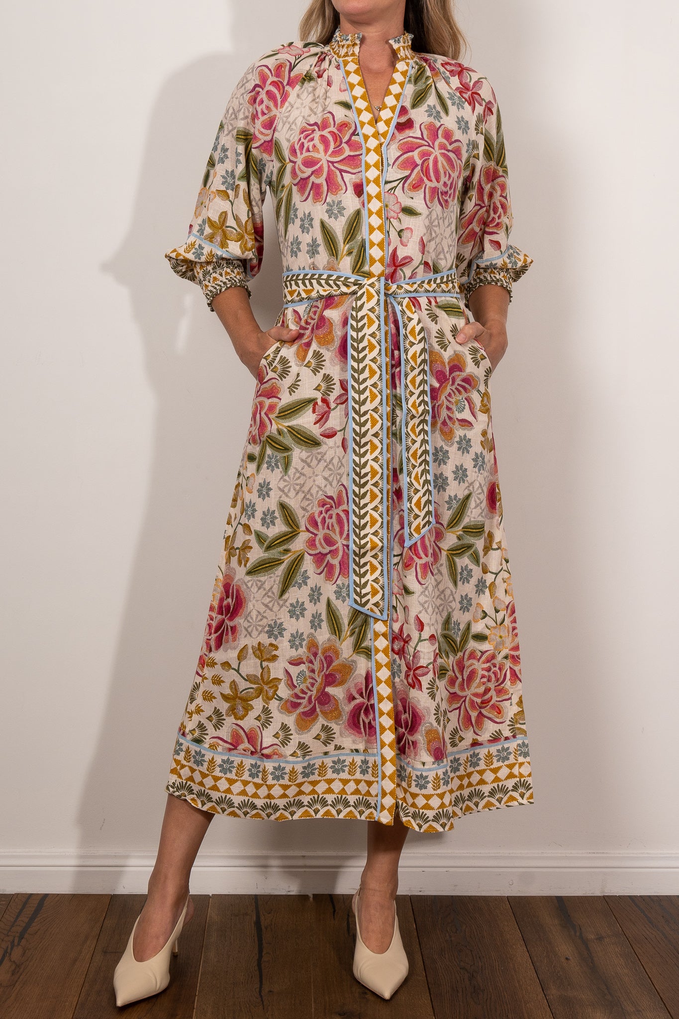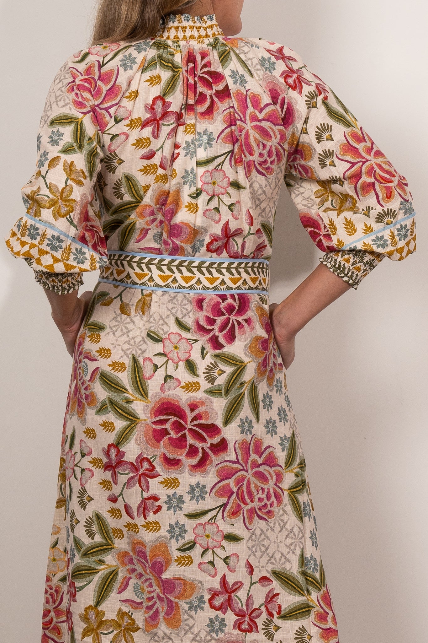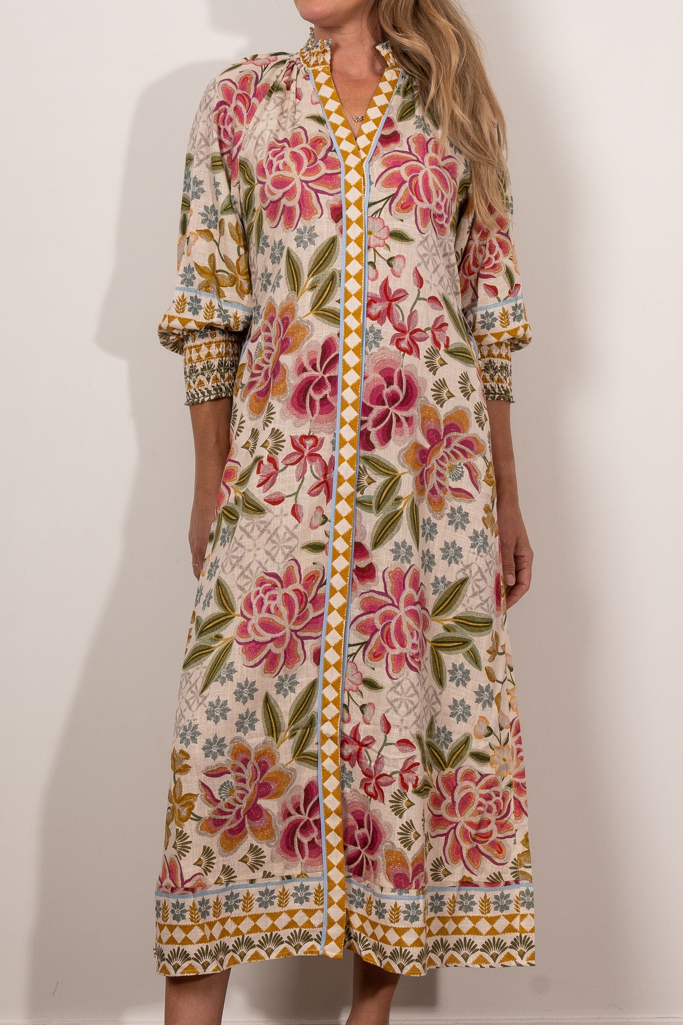 Indulge in the luxurious beauty of the Carmen Viscose Linen Maxi Dress. Adorned with a vibrant floral print, this dress exudes elegance and charm. Made with a breathable blend of viscose and linen, it features a tie-up belt and flowy silhouette for a flattering fit. Perfect for both daytime and evening events, make a statement with this stunning dress.