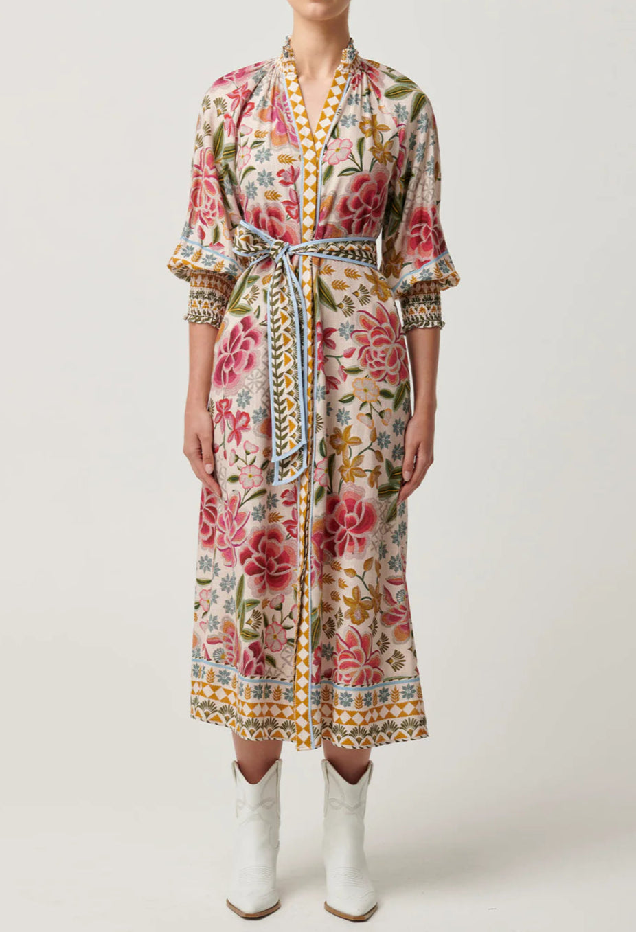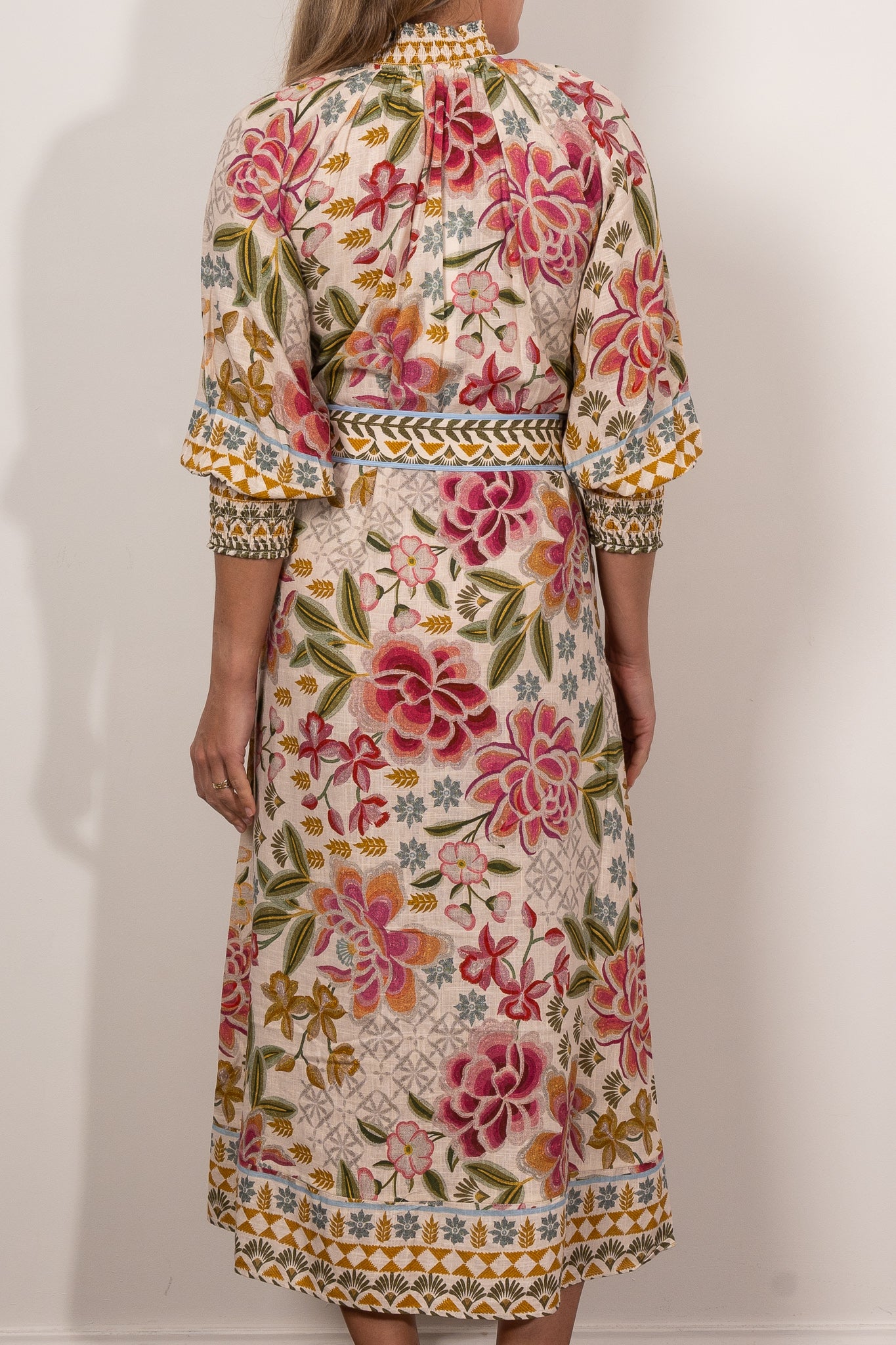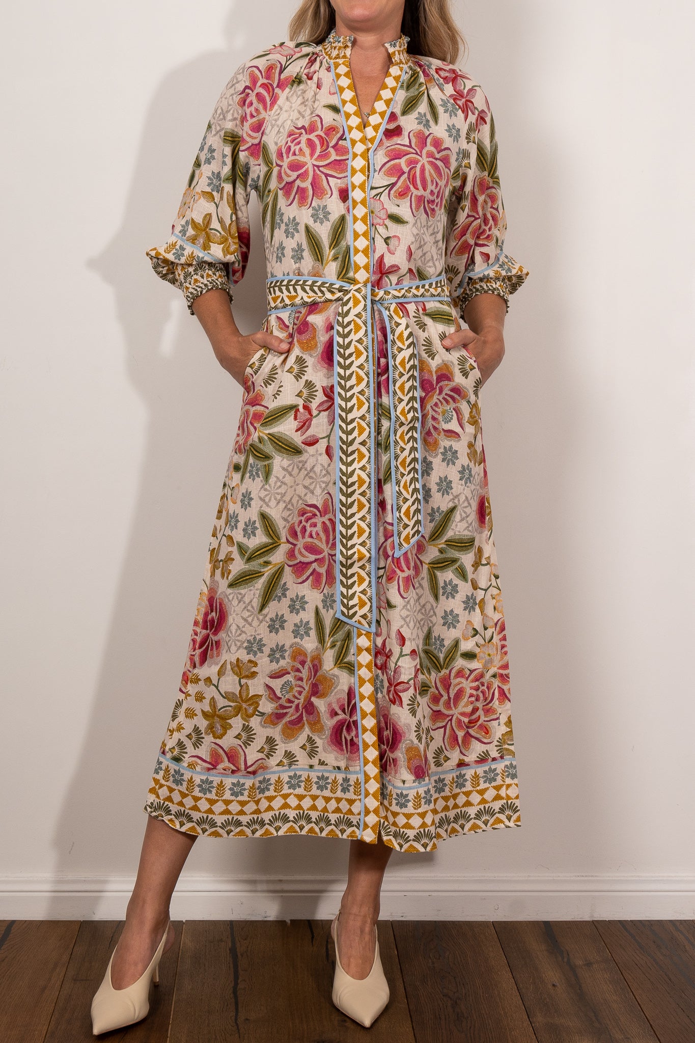 Indulge in the luxurious beauty of the Carmen Viscose Linen Maxi Dress. Adorned with a vibrant floral print, this dress exudes elegance and charm. Made with a breathable blend of viscose and linen, it features a tie-up belt and flowy silhouette for a flattering fit. Perfect for both daytime and evening events, make a statement with this stunning dress.