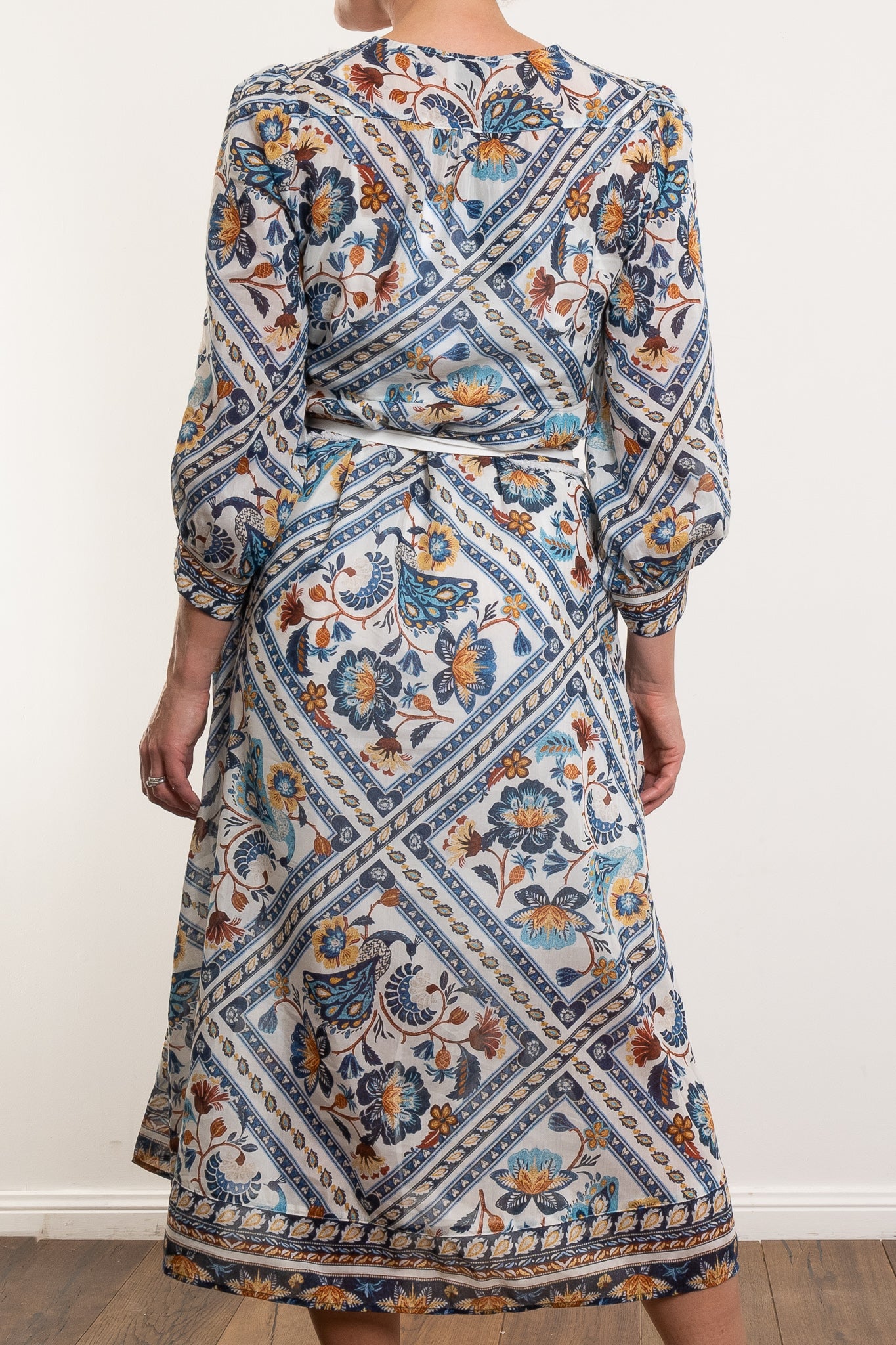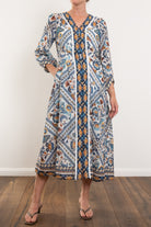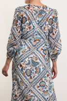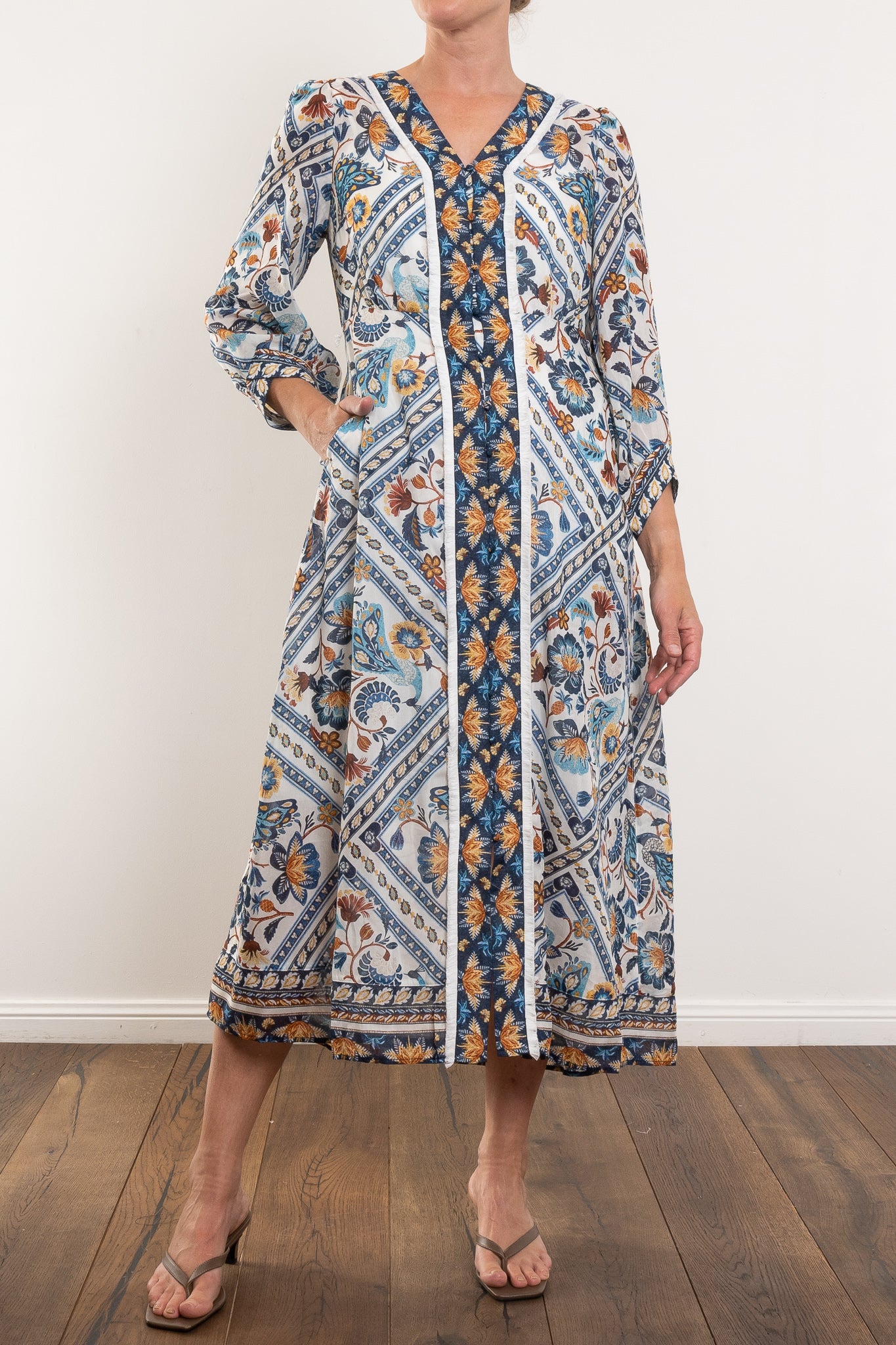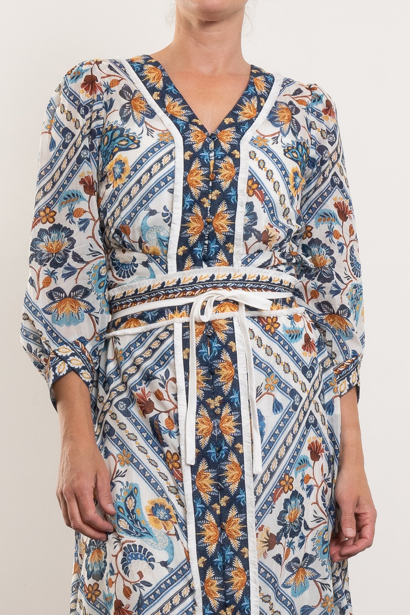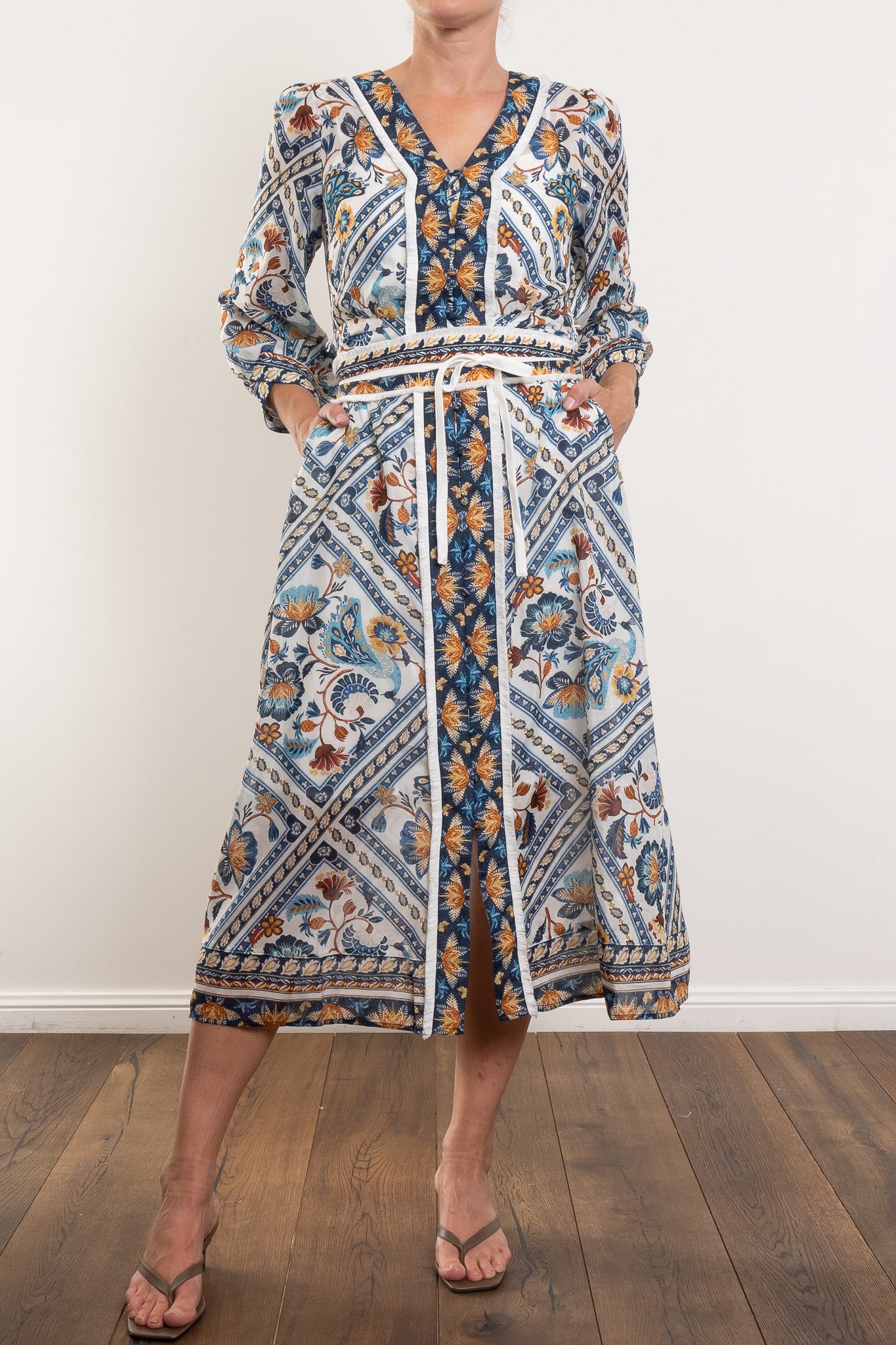 Experience effortless elegance with the Once Was Alexis Contrast Trim Midi Dress. Made from a luxurious silk-cotton blend, it showcases a vibrant floral mosaic in indigo, terracotta, and marigold. The contrast trim and self-tie rope belt highlight your waist, creating a flattering silhouette. Perfect for coastal strolls or garden parties, this dress combines relaxed comfort with sophisticated style.