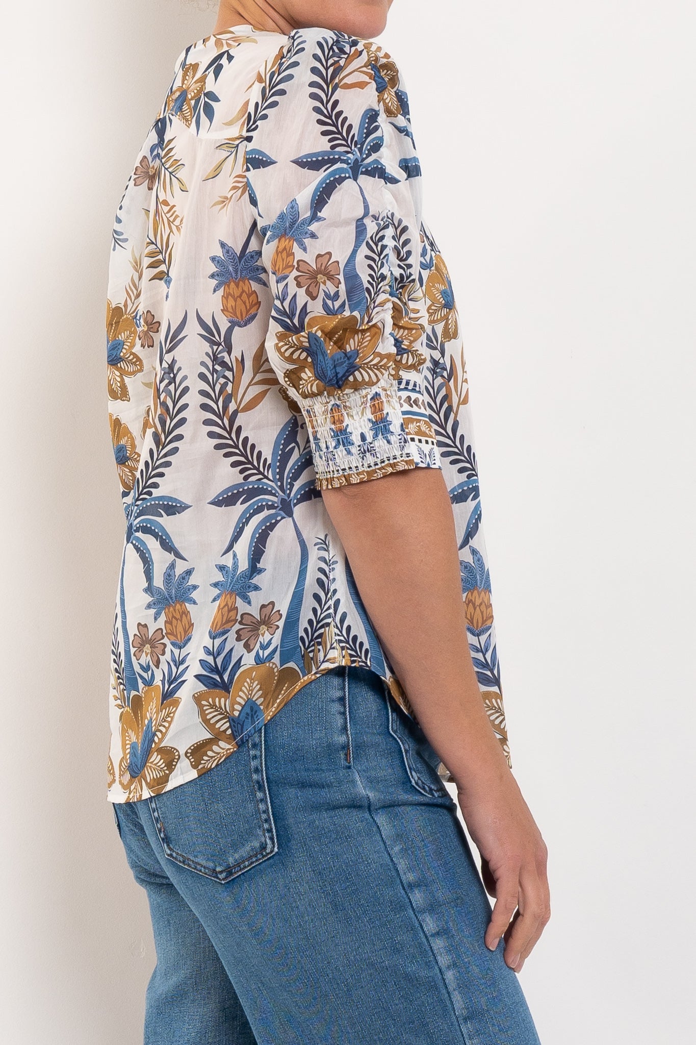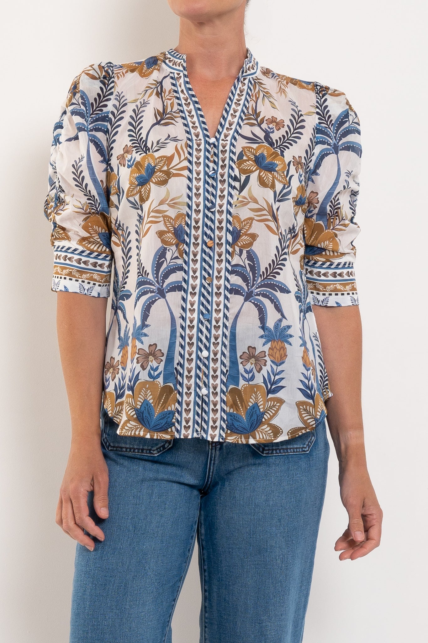 Elevate your everyday style with the Once Was Calantha Silk Shirt in Golden Medina. This luxurious cotton-silk blend delivers effortless sophistication through its fluid drape and breathable comfort. The captivating Golden Medina print—a harmonious fusion of golden florals and deep indigo foliage—strikes the perfect balance between modern elegance and bohemian charm. With its classic button-down front, refined collar, and delicately puffed sleeves, this versatile piece transitions seamlessly from polished professional looks to relaxed weekend wear. Tuck it in for timeless sophistication or tie it at the waist for an undeniably chic, feminine edge. A wardrobe essential that works as hard as you do.