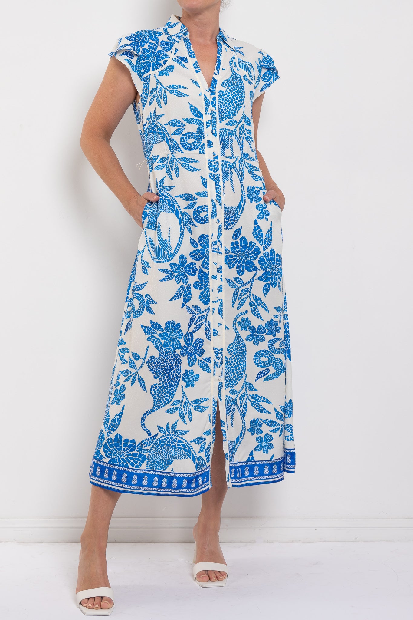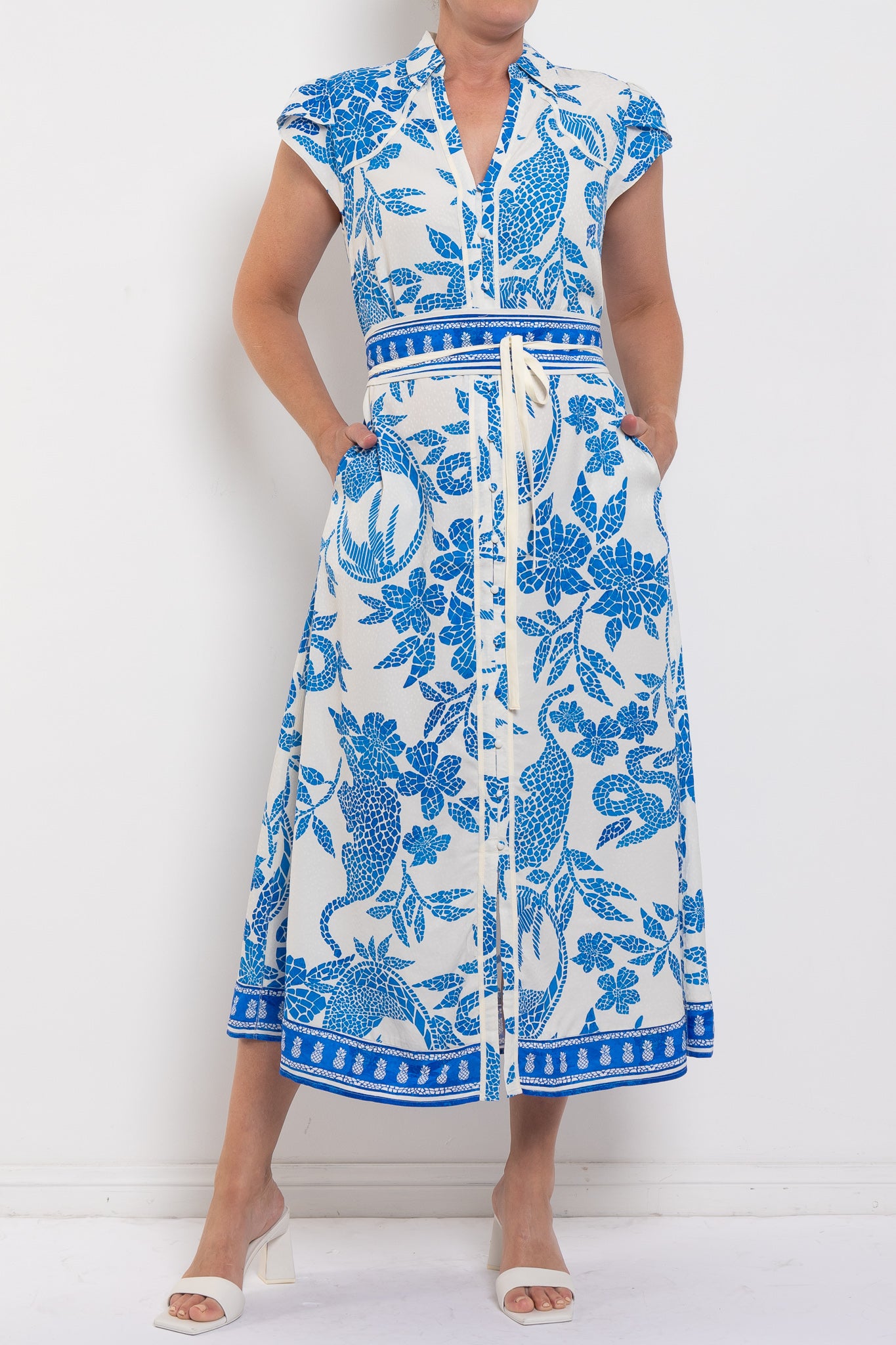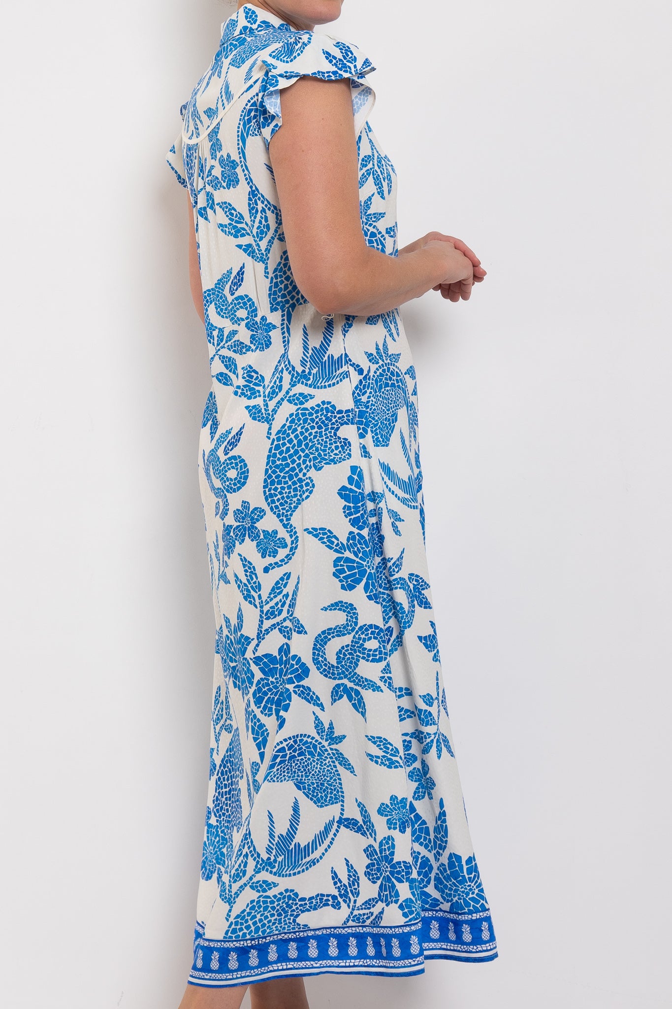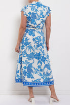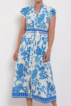 Crafted from a lightweight viscose–rayon blend, Callista moves fluidly through the body and cinches at the waist with a self-tie belt for a custom fit. Petal sleeves add a soft, romantic detail, while the button-through front allows for versatile styling. Finished in the Azure Mosaic print, this dress is perfect for spring events, weekend lunches, and everything in between.