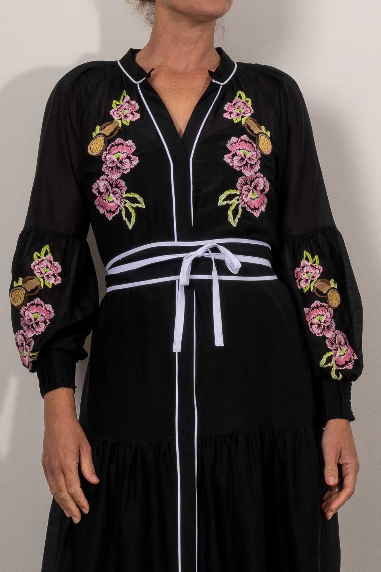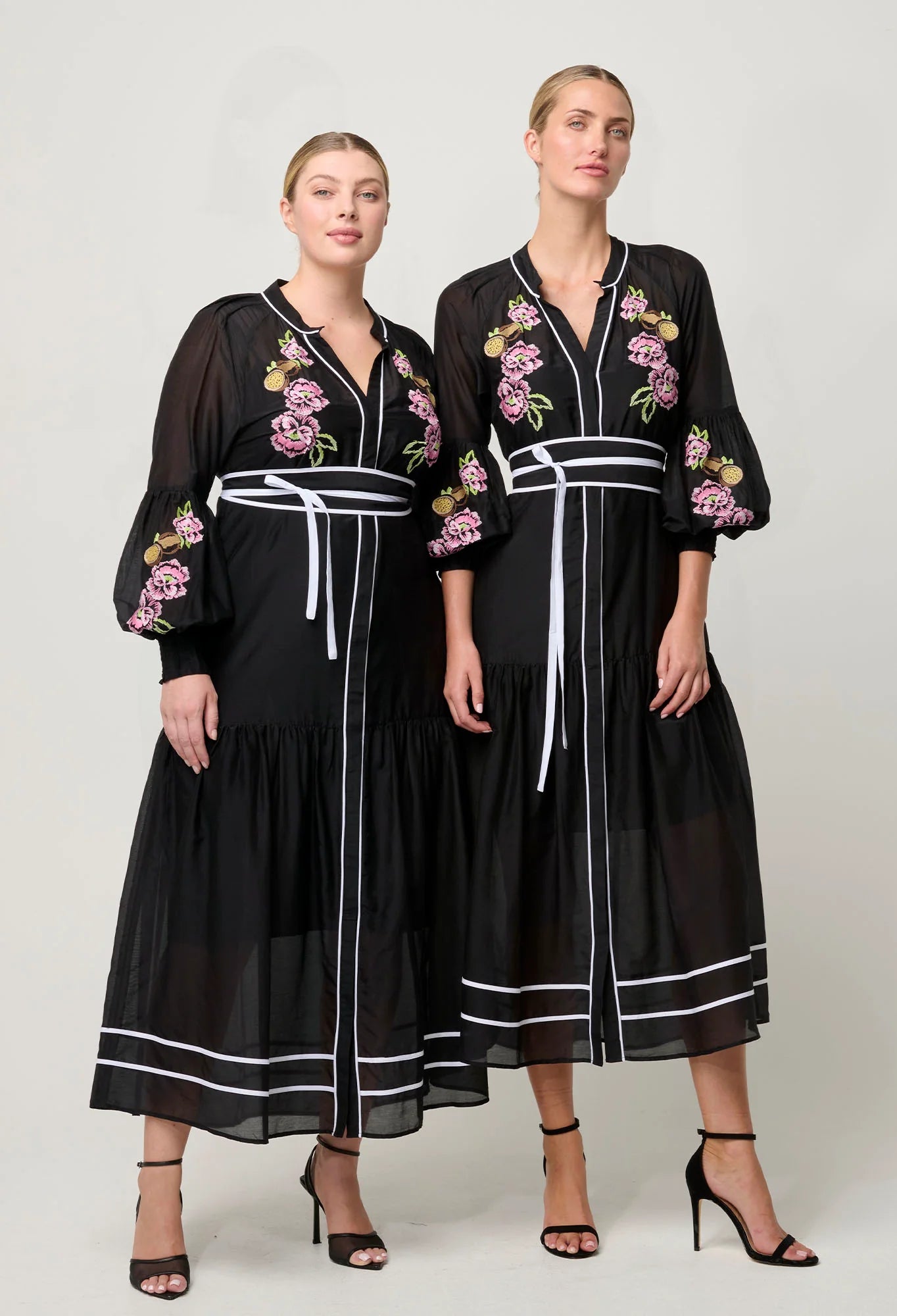 Unleash a timeless elegance with the Once Was Catalina Embroidered Maxi Dress. Made from an airy cotton-silk blend, this full-length dress offers a dreamy and flowy drape with every step. The handcrafted floral embroidery and contrast white trim add an alluring touch, while the billowing sleeves and adjustable waist tie enhance the romantic volume. Elevate your wardrobe with this understated yet luxurious piece.
