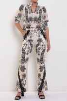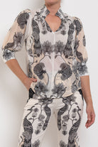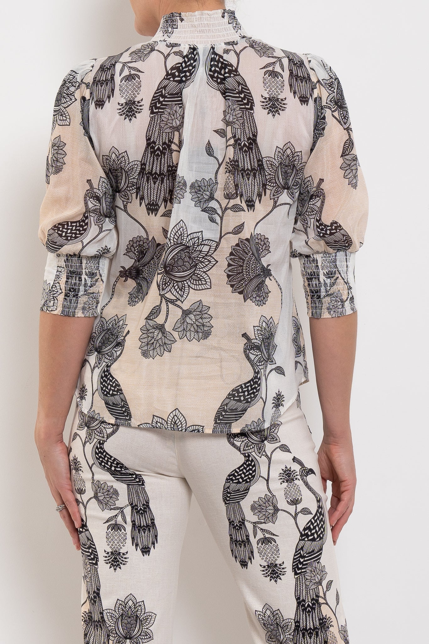 Crafted from a soft cotton–silk blend, Oleander drapes with lightweight fluidity while offering all-day comfort. The shirred collar and V-neckline create a flattering frame for the face, while three-quarter sleeves add effortless wearability. Finished in the striking Imperial Stone botanical placement print, this blouse works equally well tucked into tailored pants for the office or paired back with denim for off-duty chic.
