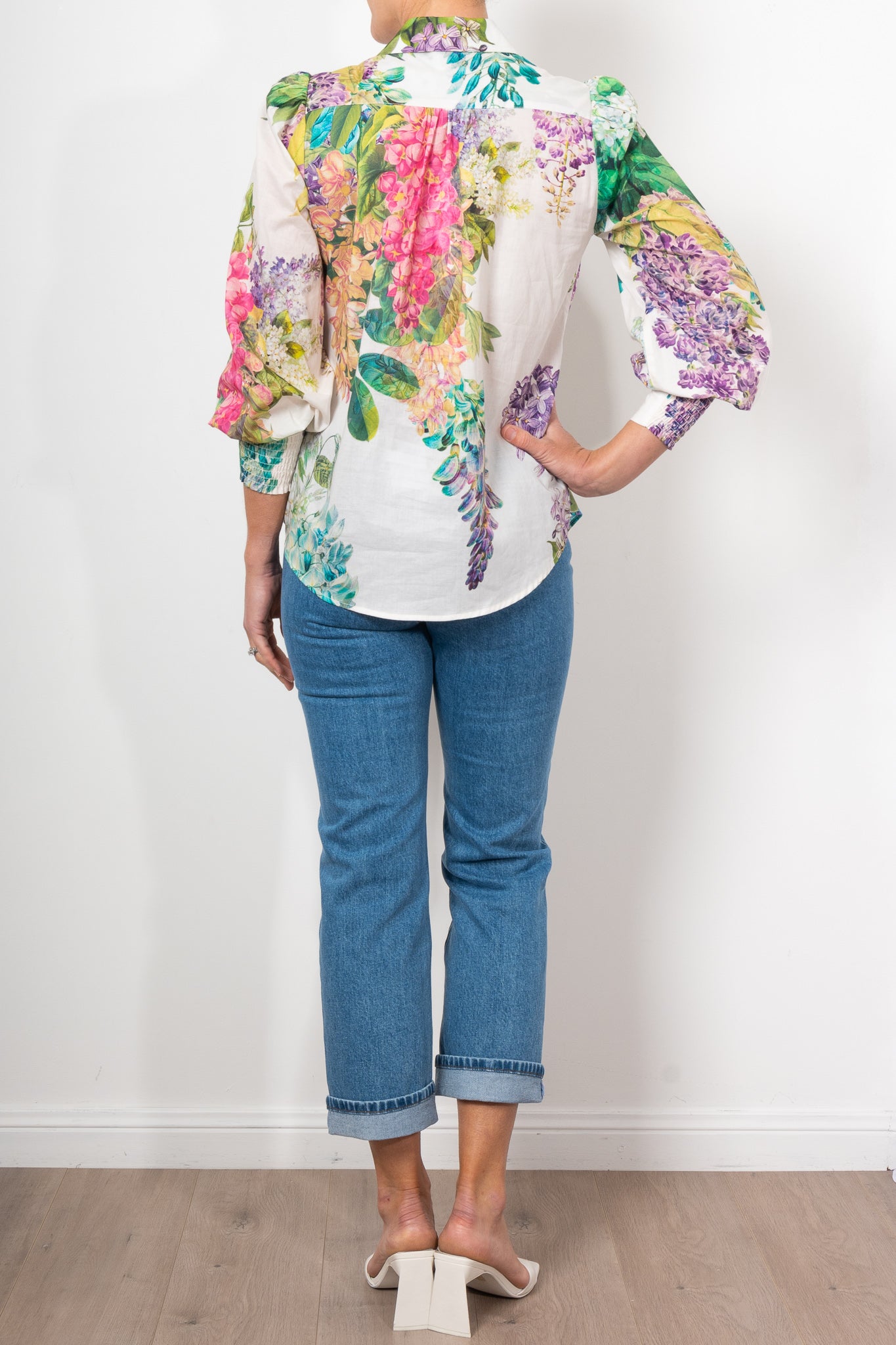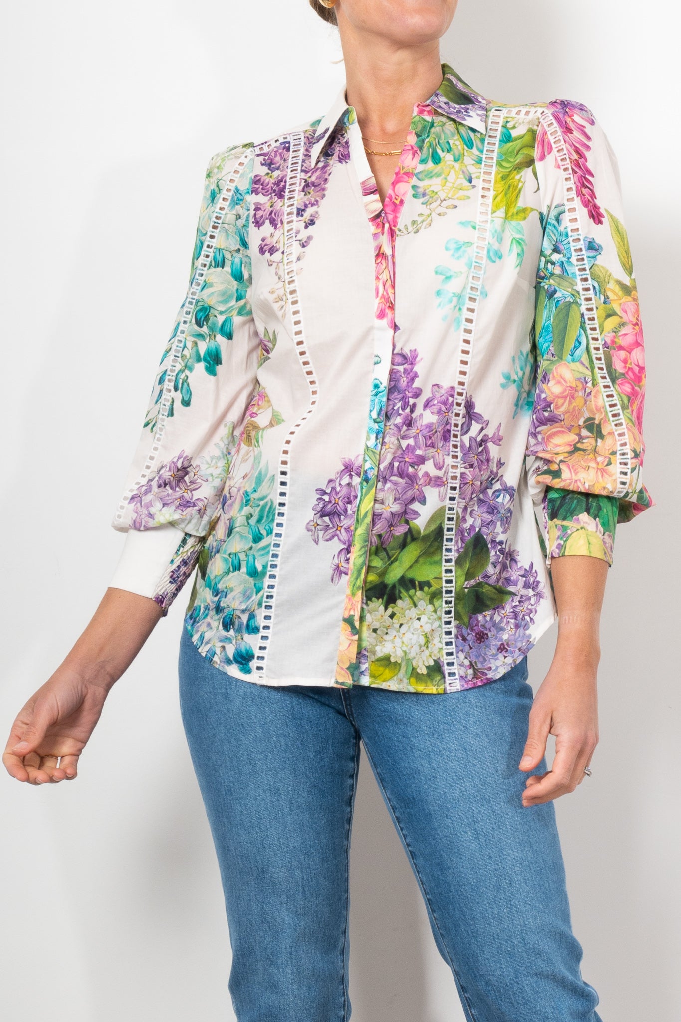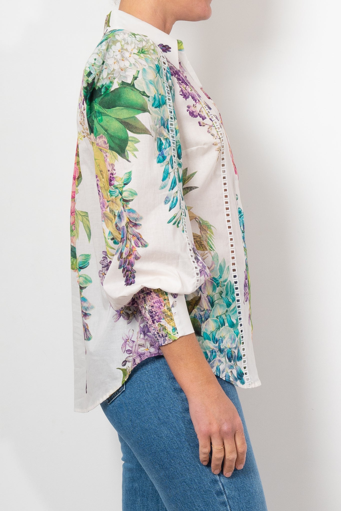 Elevate your style with the Swanson Embroidered Cotton Voile Shirt in White Wisteria. The timeless button-up design is enhanced with delicate embroidered cutouts and a soft blouson sleeve. Perfect for any occasion, this shirt seamlessly blends classic tailoring with a touch of artistic flair.