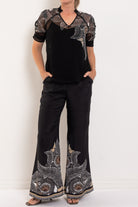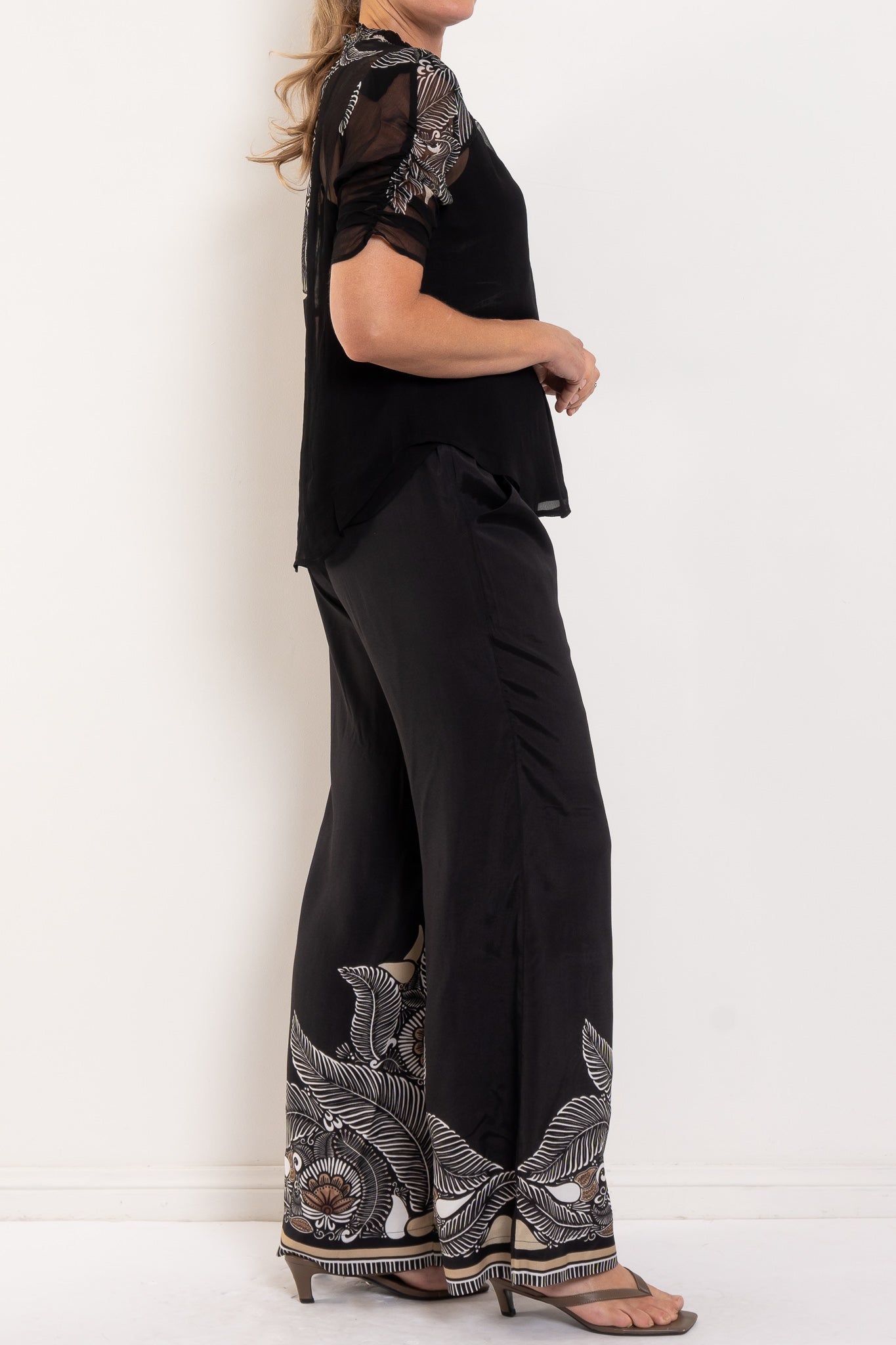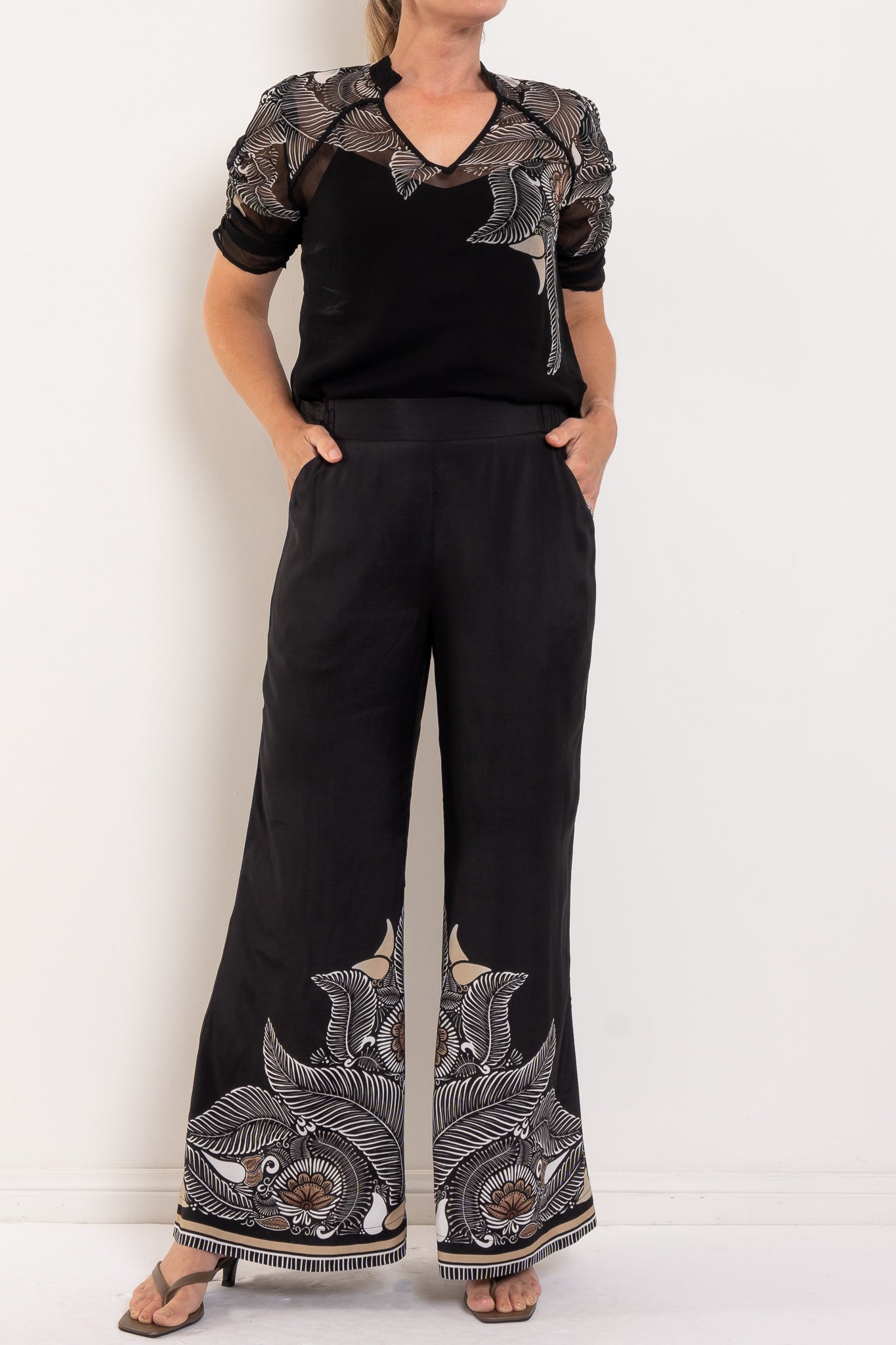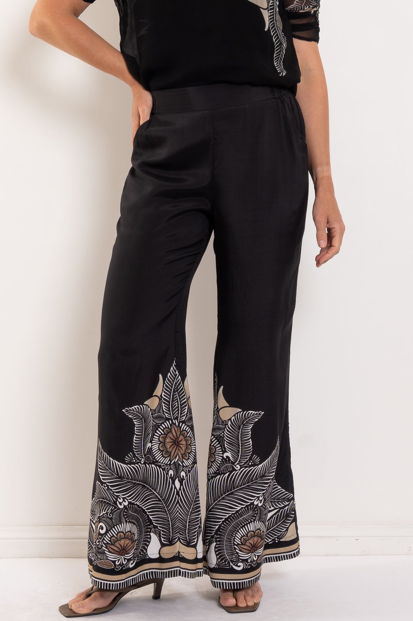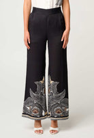 Cut from a soft viscose–rayon faille, these pants drape beautifully through the leg without clinging. The striking Casablanca border print frames the hem and draws the eye down, giving a lengthening effect that works beautifully with a heel or a sleek flat. A flat front waistband keeps the look clean and polished, while the elasticated back and relaxed wide leg ensure all-day comfort — perfect for long lunches, events or travel days when you still want to feel put-together.