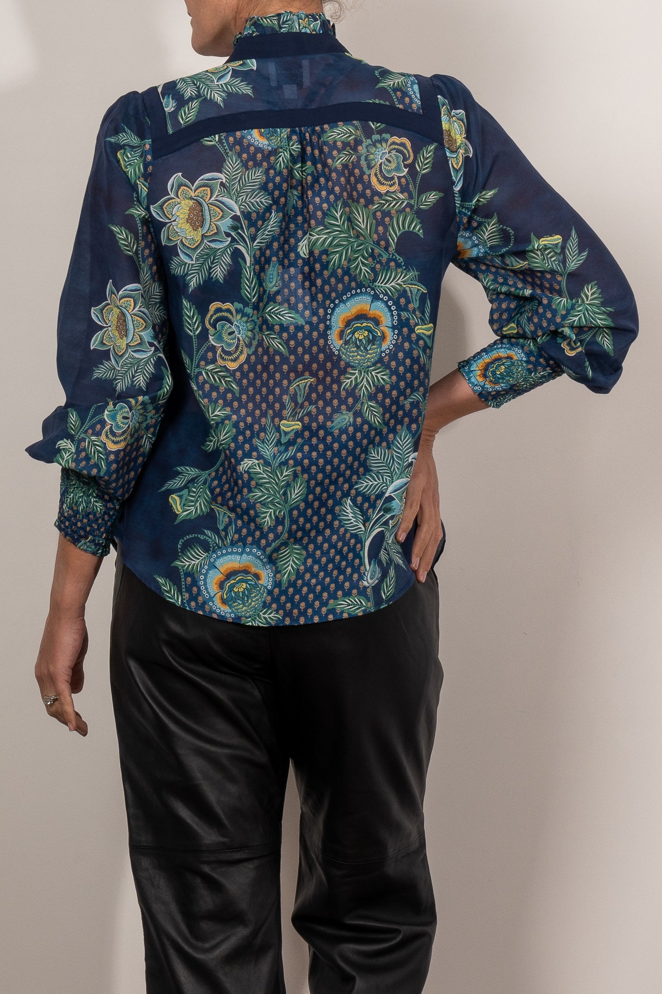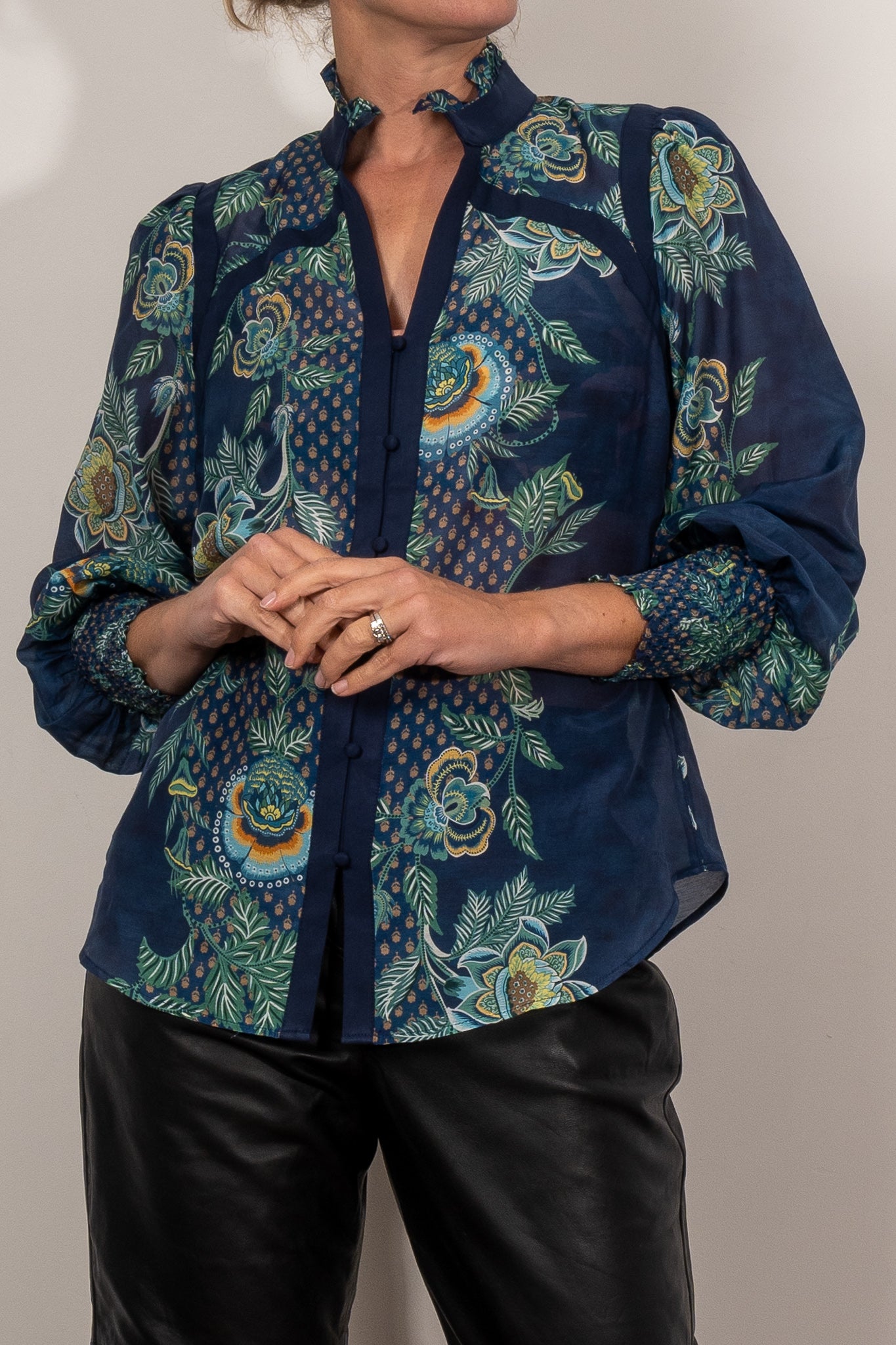 Romantic yet refined, the Renata Contrast Trim Silk Blouse is a true standout piece. Crafted from floaty silk georgette, it features a rich botanical print in jewel-toned hues, brought to life with contrast navy panelling and delicate fabric-covered buttons. A subtle ruffled neckline and voluminous sleeves with smocked cuffs add soft drama, while the semi-sheer finish offers an elegant hint of skin. Pair it with tailored trousers for polished sophistication, or dress it down with denim and boots for modern bohemian charm.