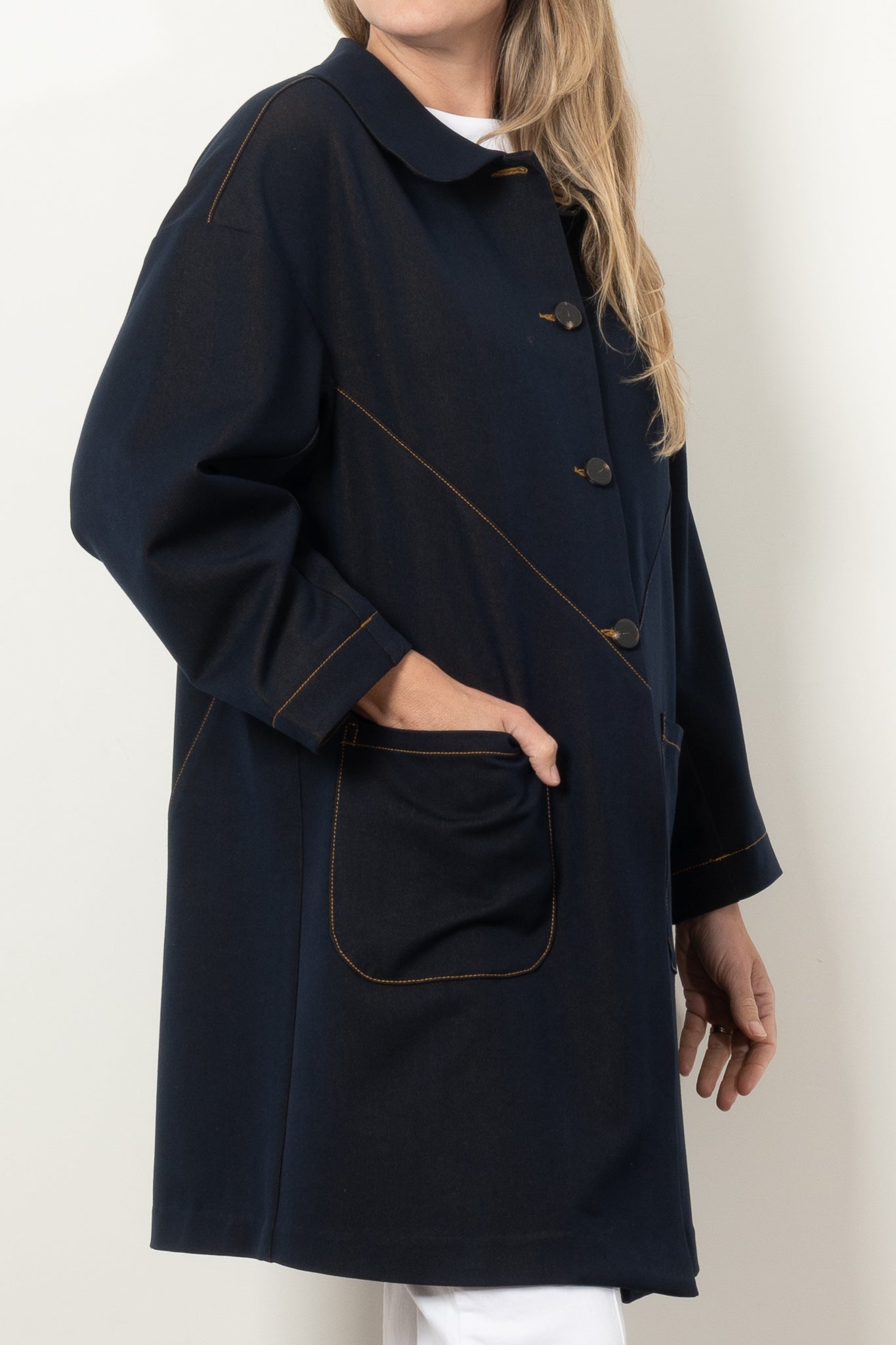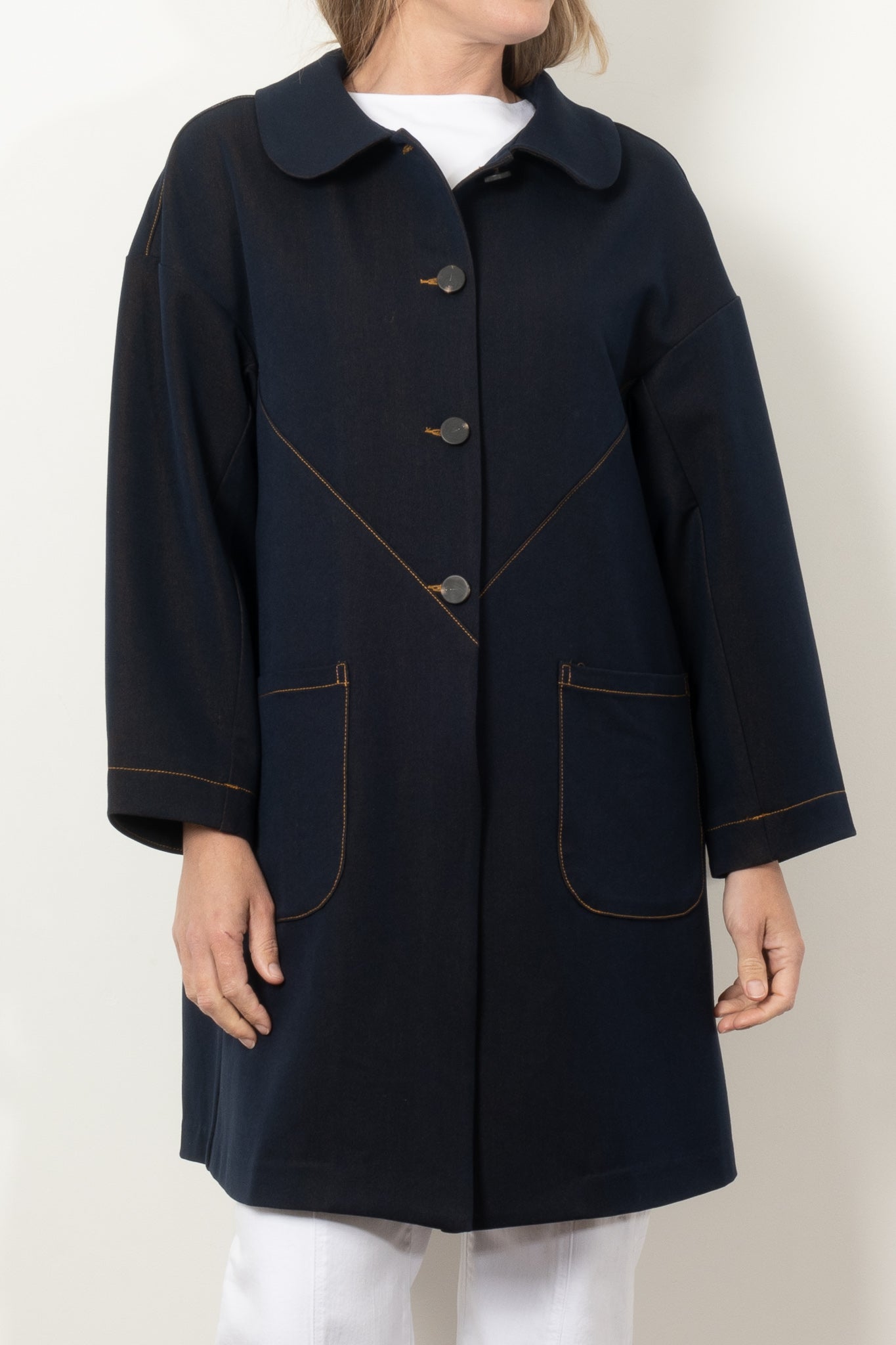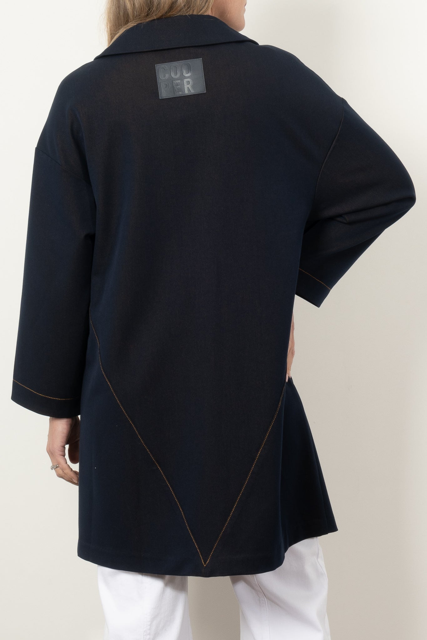 Elevate your style with the COOPER by Trelise Cooper Hot Air Cocoon Coat, a must-have denim statement piece. This timeless coat features an elegant Peter Pan collar, eye-catching contrast stitching, and generous patch pockets that blend fashion with function. The clean silhouette and bound interior seams ensure both comfort and sophistication, making this midweight jacket your perfect companion through every season.