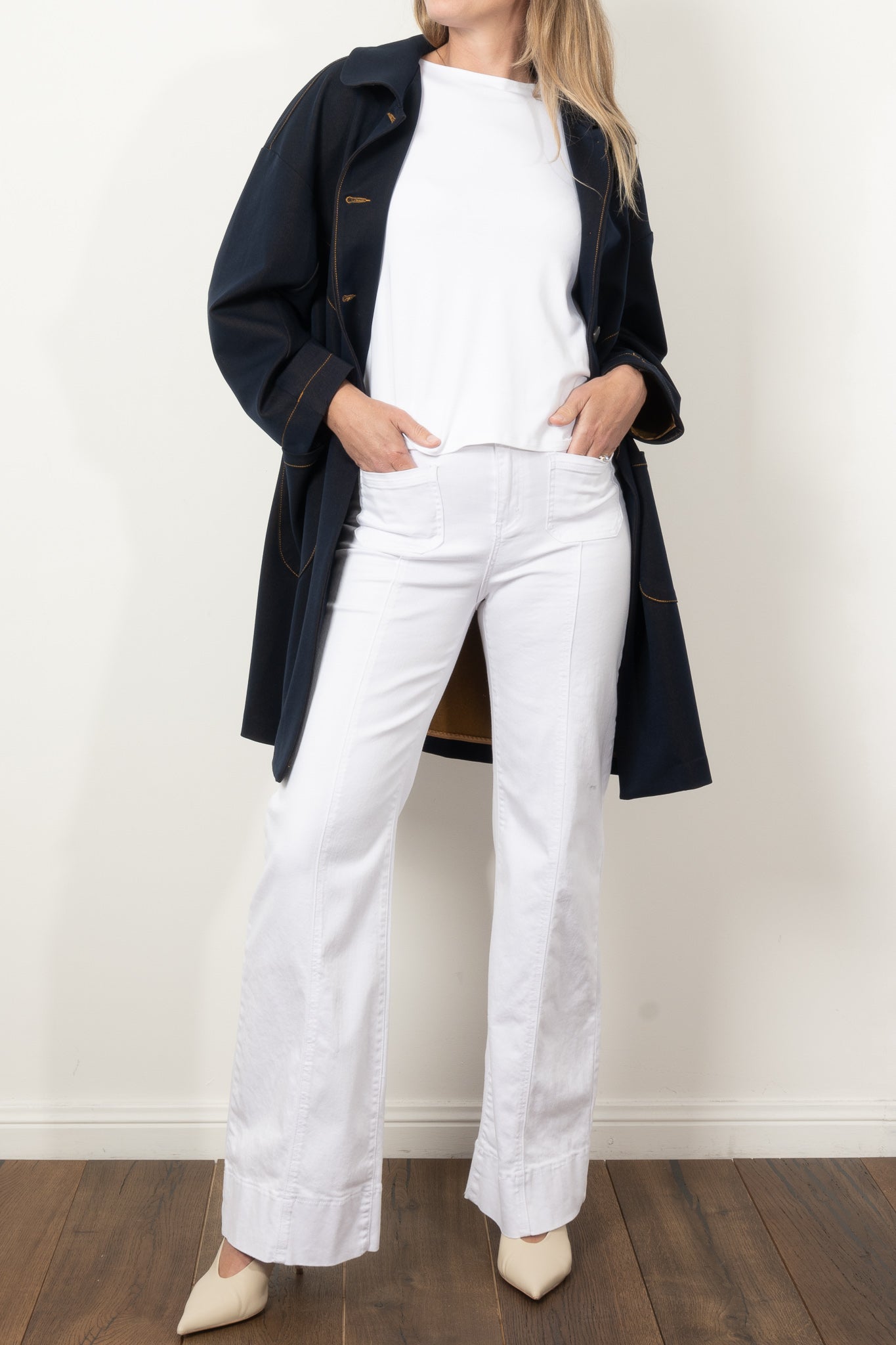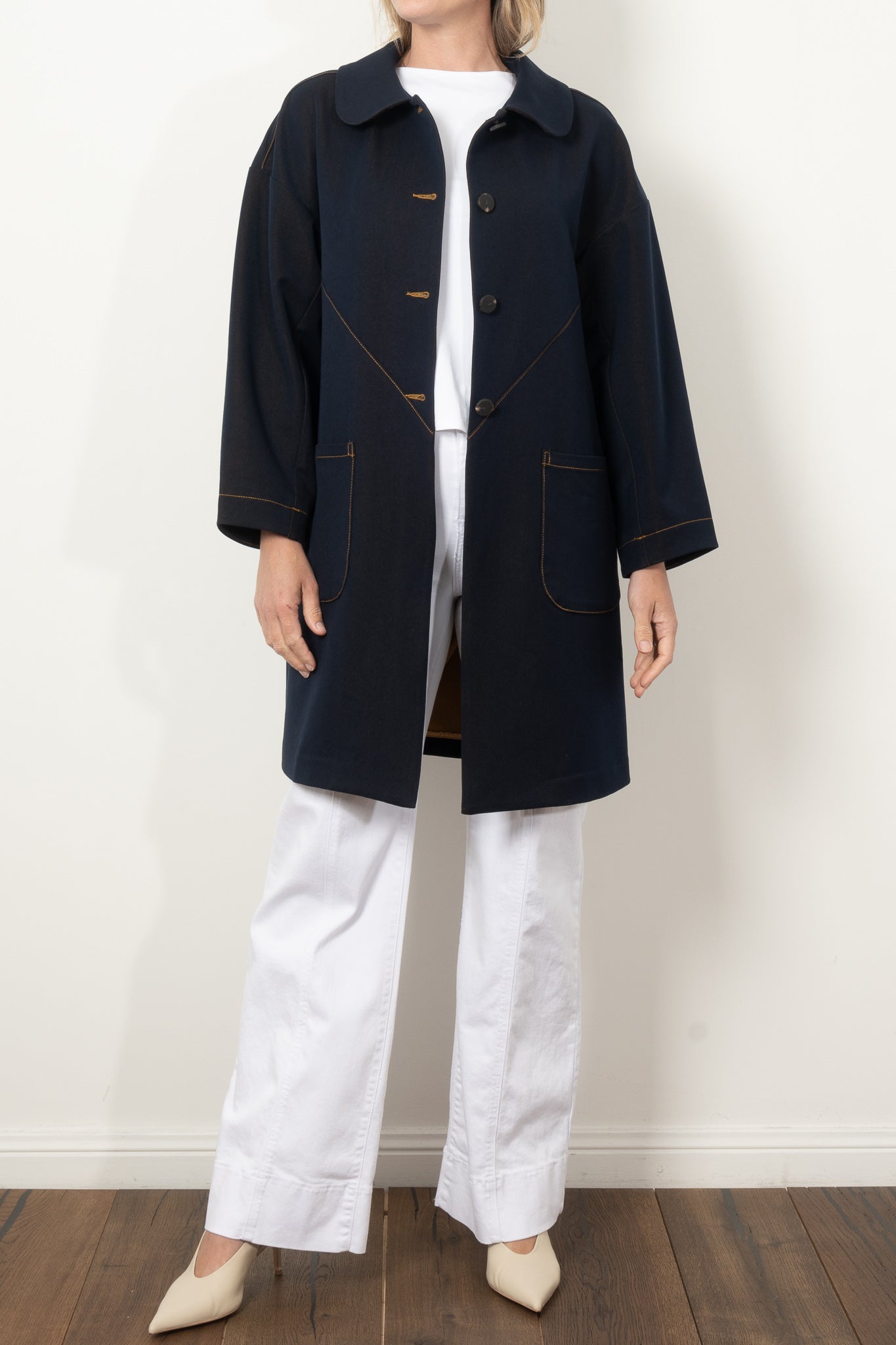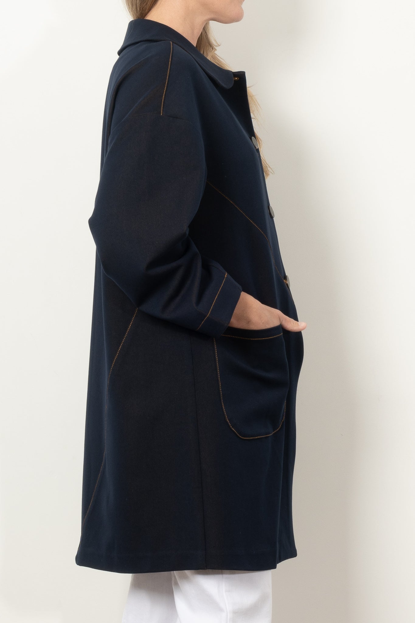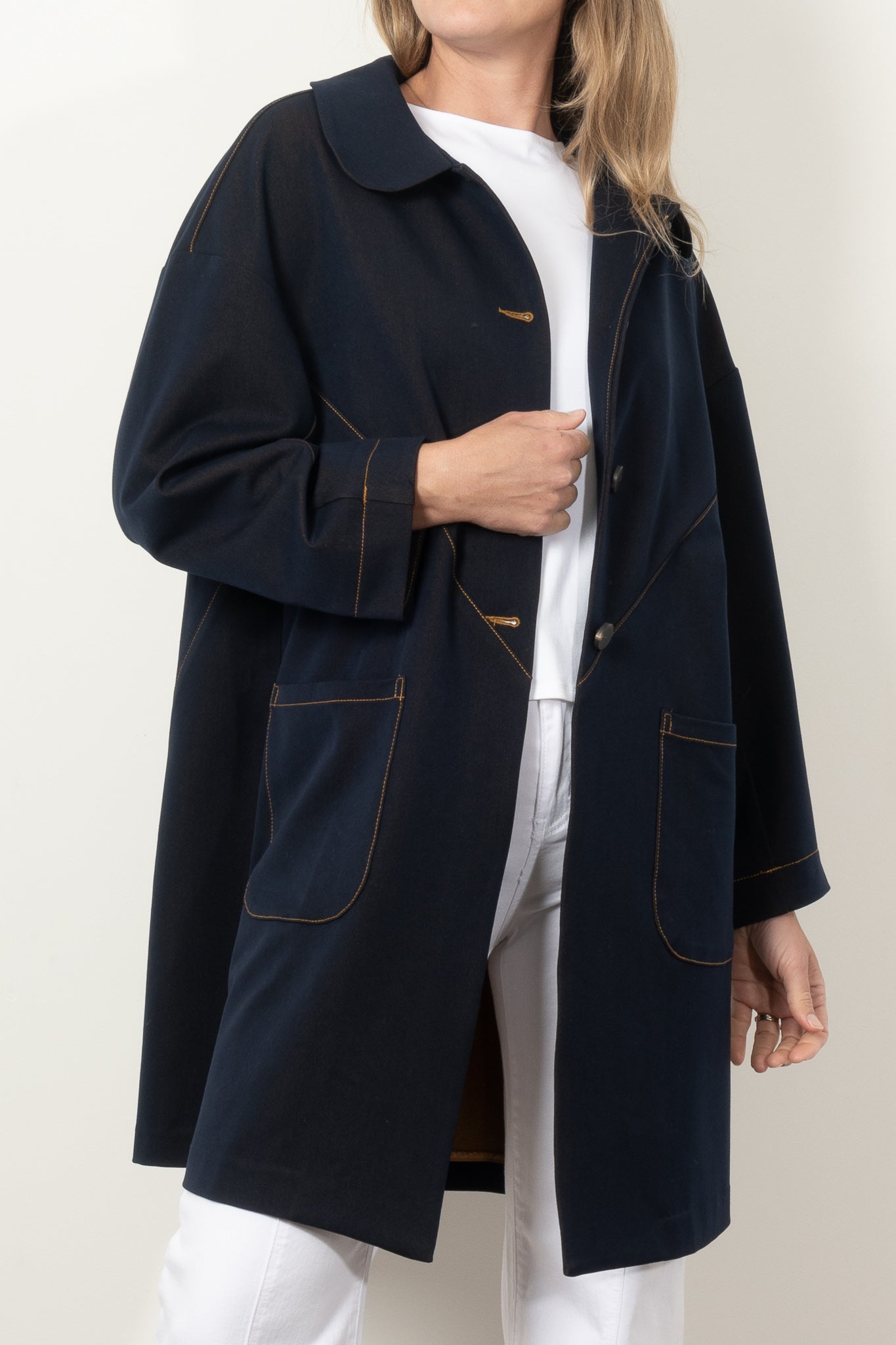 Elevate your style with the COOPER by Trelise Cooper Hot Air Cocoon Coat, a must-have denim statement piece. This timeless coat features an elegant Peter Pan collar, eye-catching contrast stitching, and generous patch pockets that blend fashion with function. The clean silhouette and bound interior seams ensure both comfort and sophistication, making this midweight jacket your perfect companion through every season.
