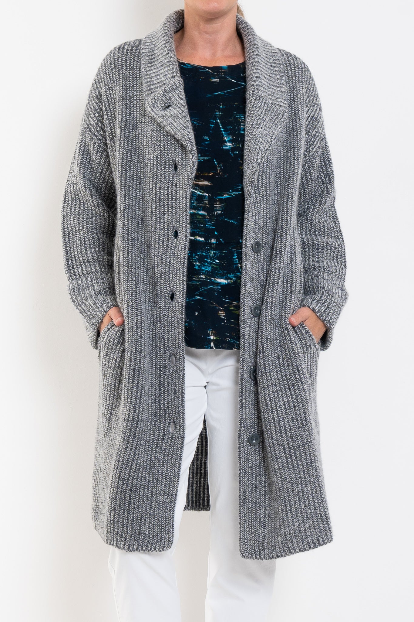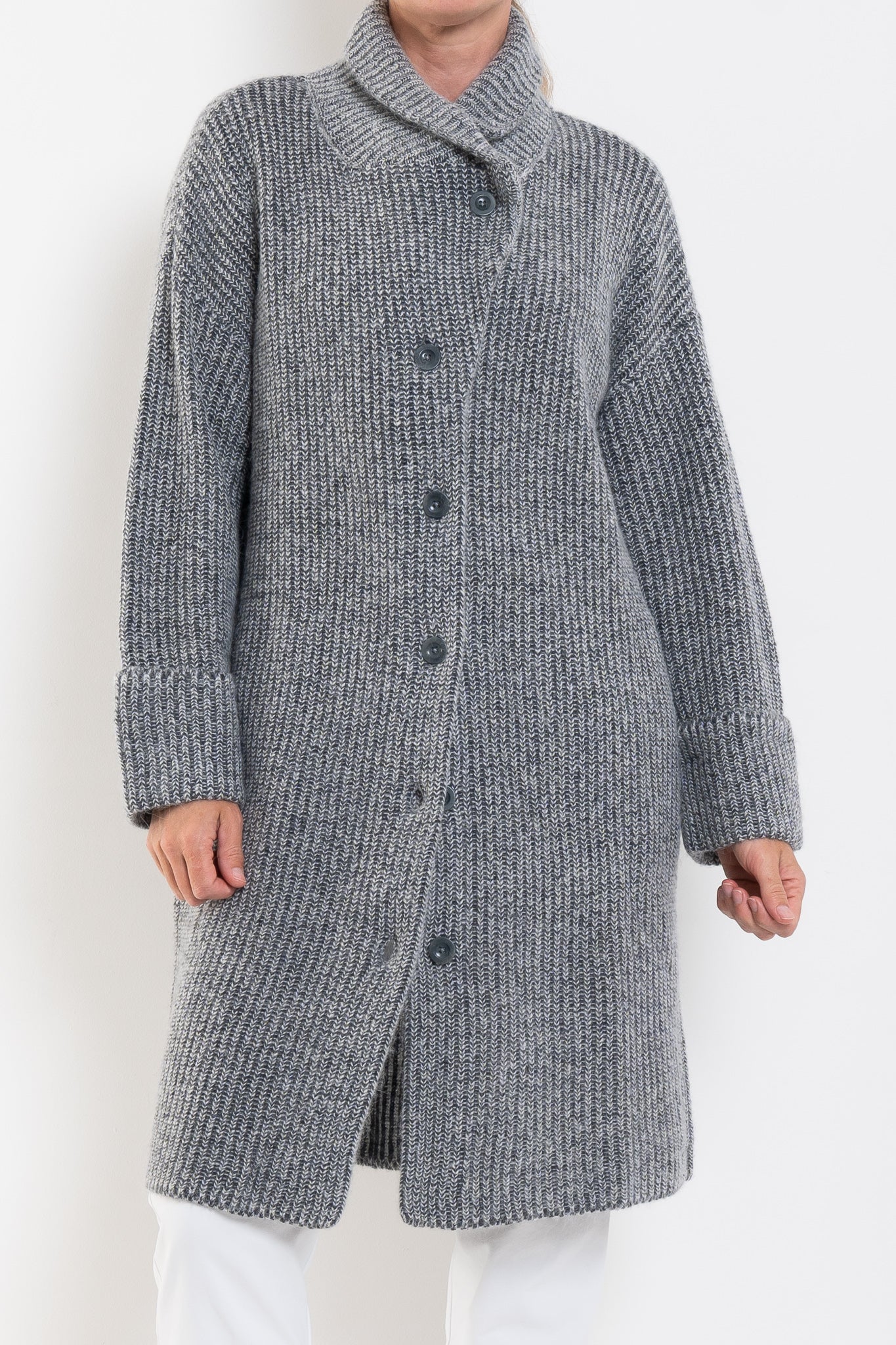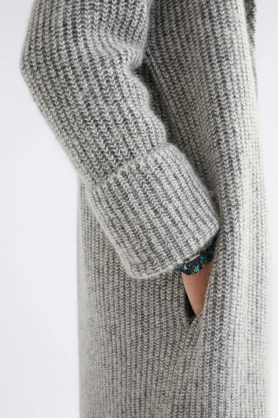 The Aleph Longline Cardi is a coat style cardigan crafted from a luxuriously, soft blend of merino wool, alpaca and recycled nylon in a two-tone mix of grey marle yarns. This longline cardigan features a soft shawl-style collar with roll neckline, button-through front with tonal Corozo buttons, and full-length sleeves with turned-up cuffs. The straight-cut silhouette creates a refined, flattering shape. A cosy elevated layering piece for cooler days.