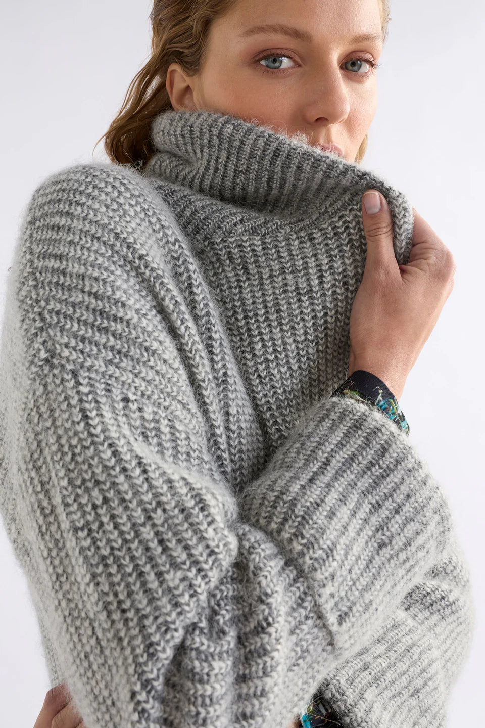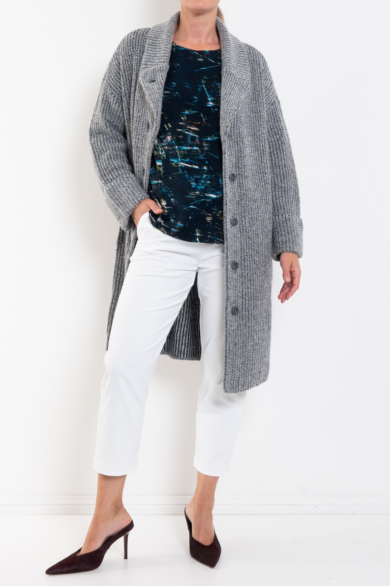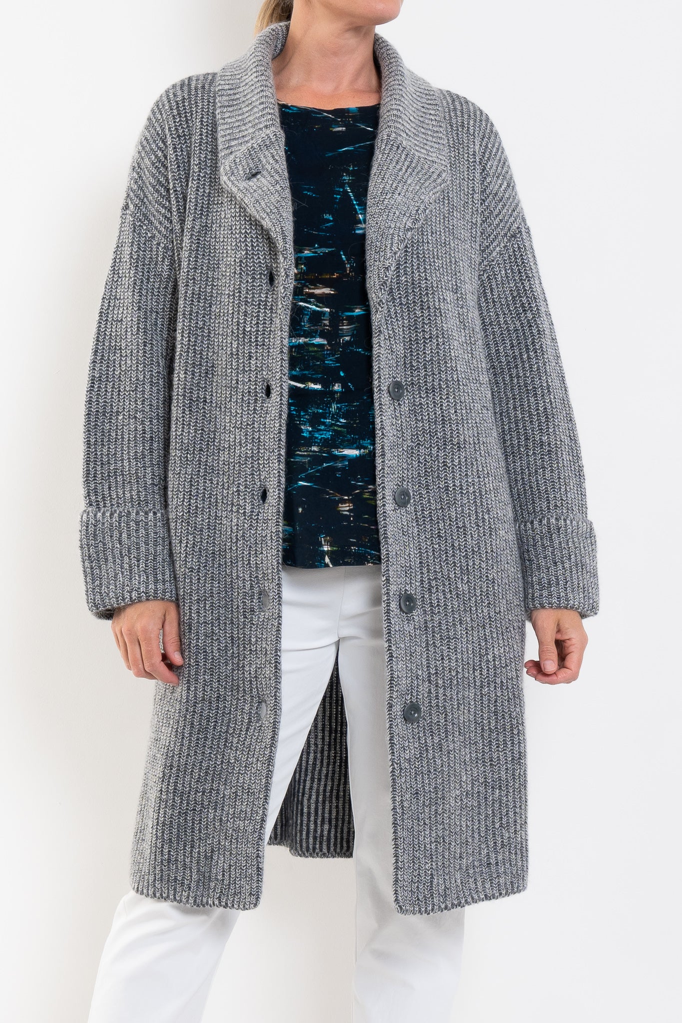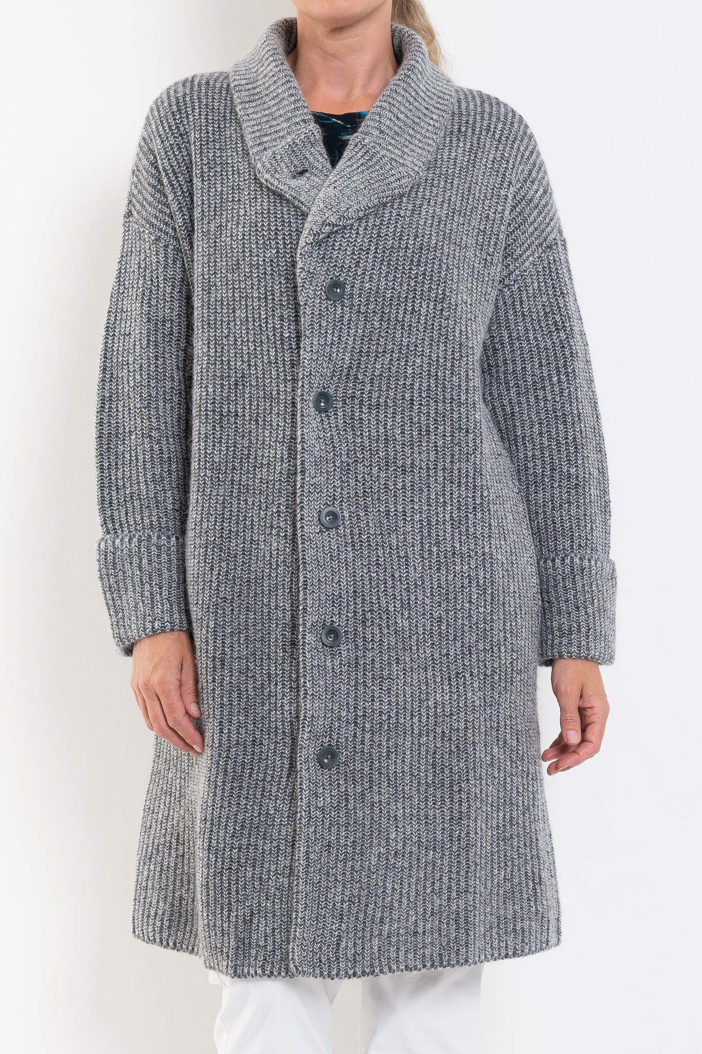 The Aleph Longline Cardi is a coat style cardigan crafted from a luxuriously, soft blend of merino wool, alpaca and recycled nylon in a two-tone mix of grey marle yarns. This longline cardigan features a soft shawl-style collar with roll neckline, button-through front with tonal Corozo buttons, and full-length sleeves with turned-up cuffs. The straight-cut silhouette creates a refined, flattering shape. A cosy elevated layering piece for cooler days.