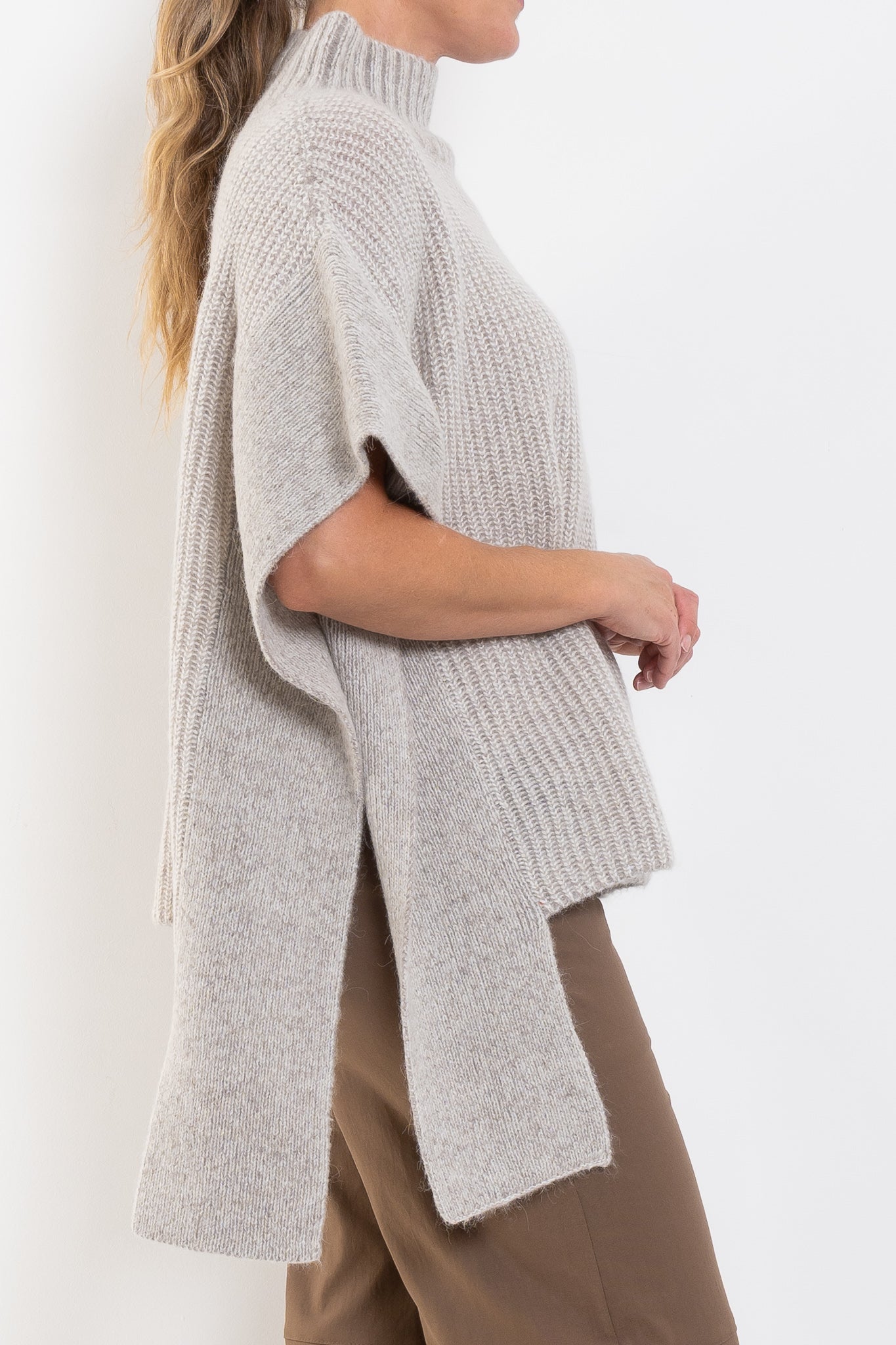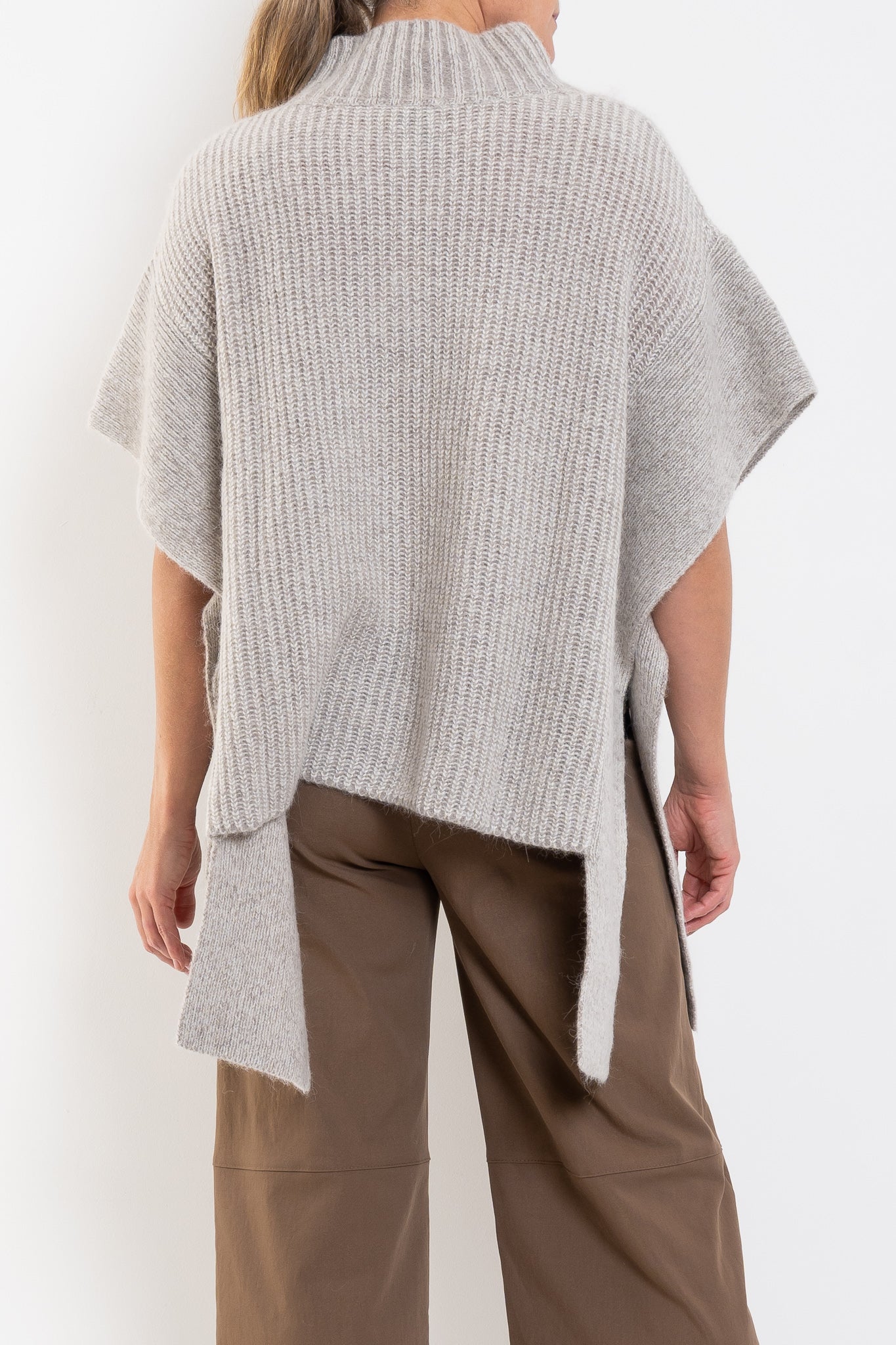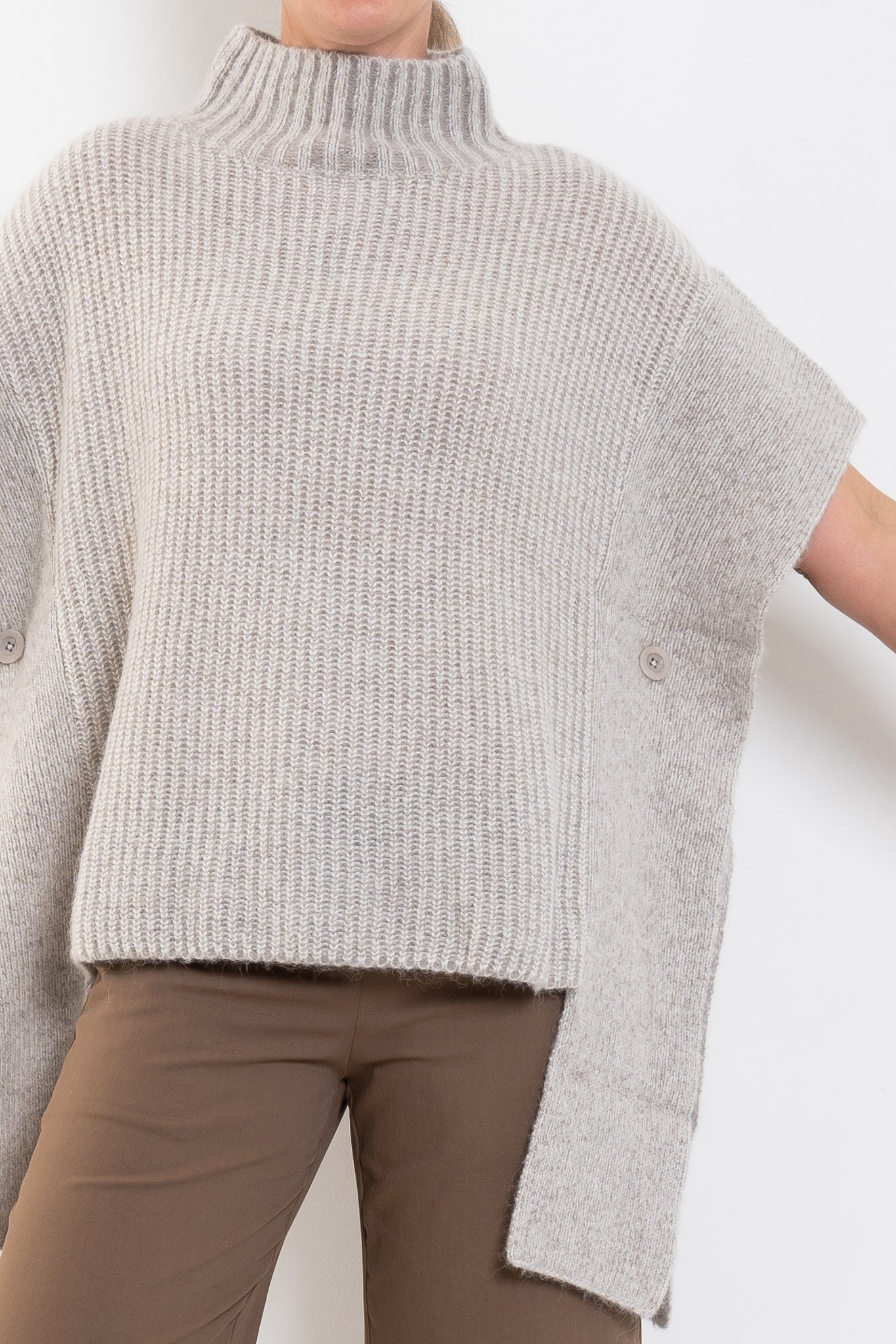 The Aleph Poncho is a boxy turtleneck style crafted from a luxuriously soft blend of merino wool, alpaca and recycled nylon, in a two-tone mix of oat and flax coloured yarns. This ribbed knit, poncho-style silhouette features a high turtleneck collar, open sides with extended shoulder panels, and arm openings. A single button detail at the side seam allows for flexibility in shape and styling, while the high-low hem adds interest. A statement layering piece for cooler weather. Wear over our fine merino knit basics or neater fit knits.
