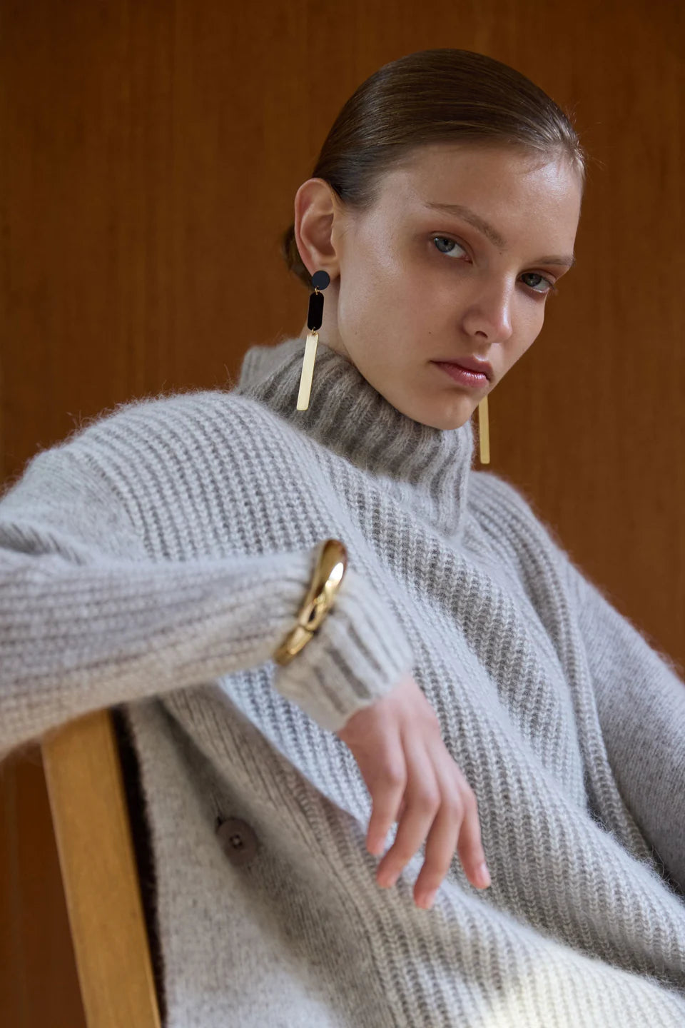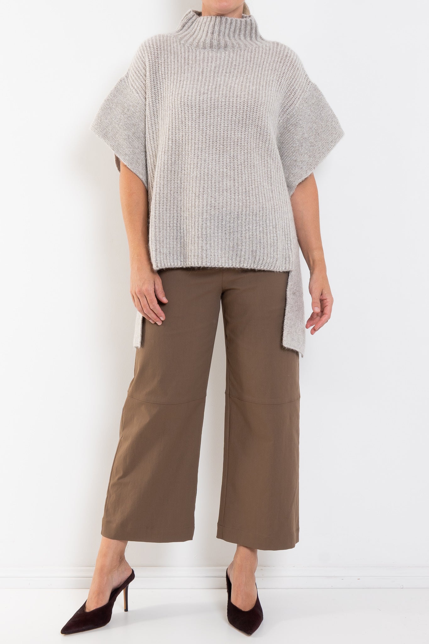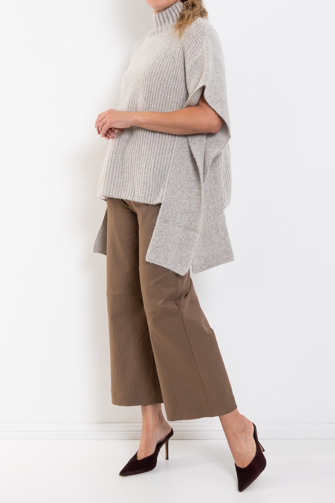 The Aleph Poncho is a boxy turtleneck style crafted from a luxuriously soft blend of merino wool, alpaca and recycled nylon, in a two-tone mix of oat and flax coloured yarns. This ribbed knit, poncho-style silhouette features a high turtleneck collar, open sides with extended shoulder panels, and arm openings. A single button detail at the side seam allows for flexibility in shape and styling, while the high-low hem adds interest. A statement layering piece for cooler weather. Wear over our fine merino knit basics or neater fit knits.