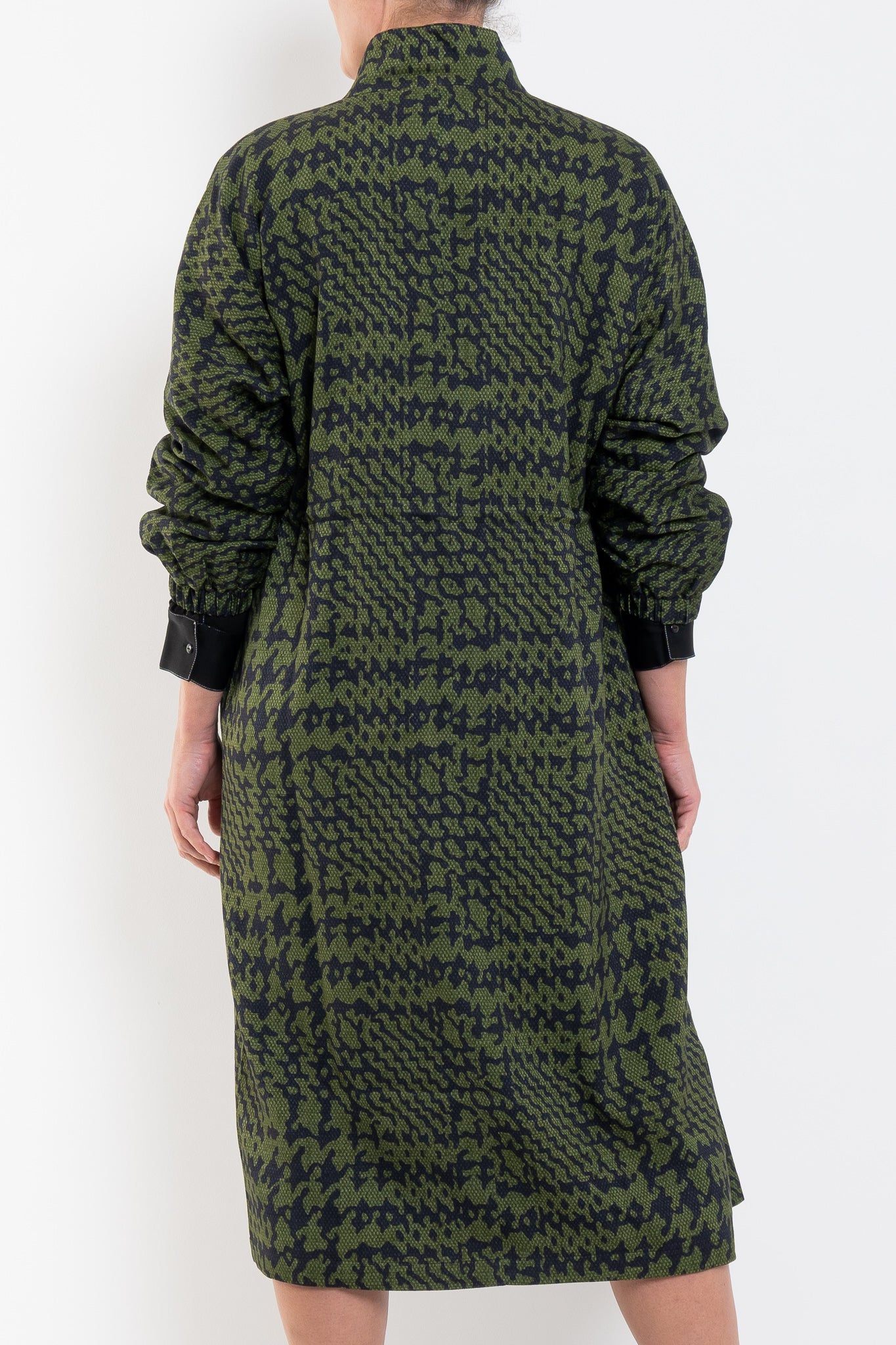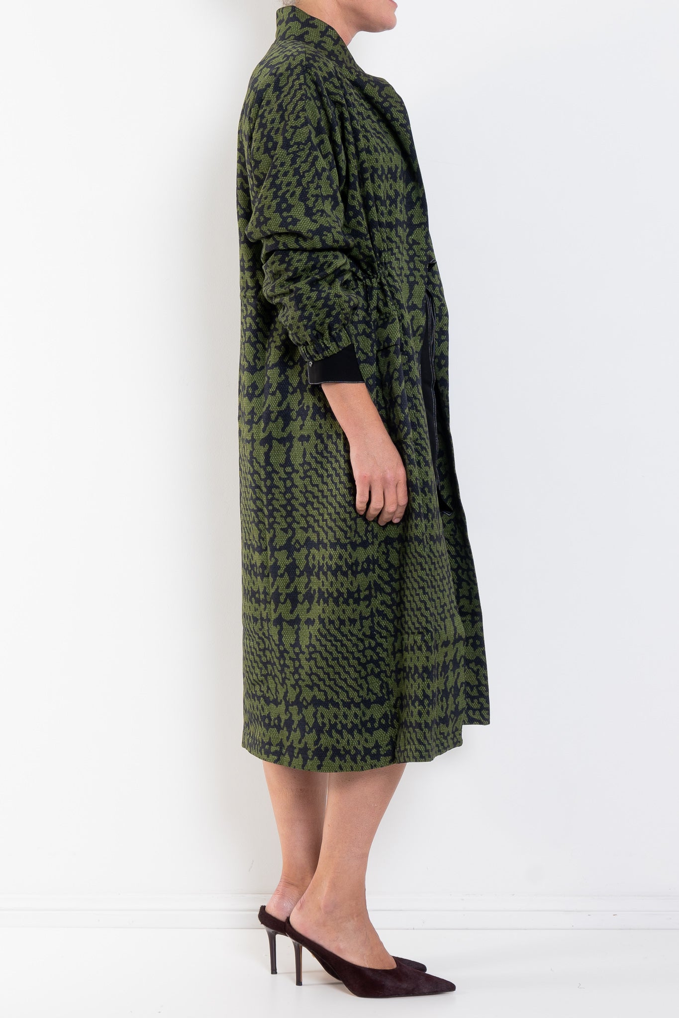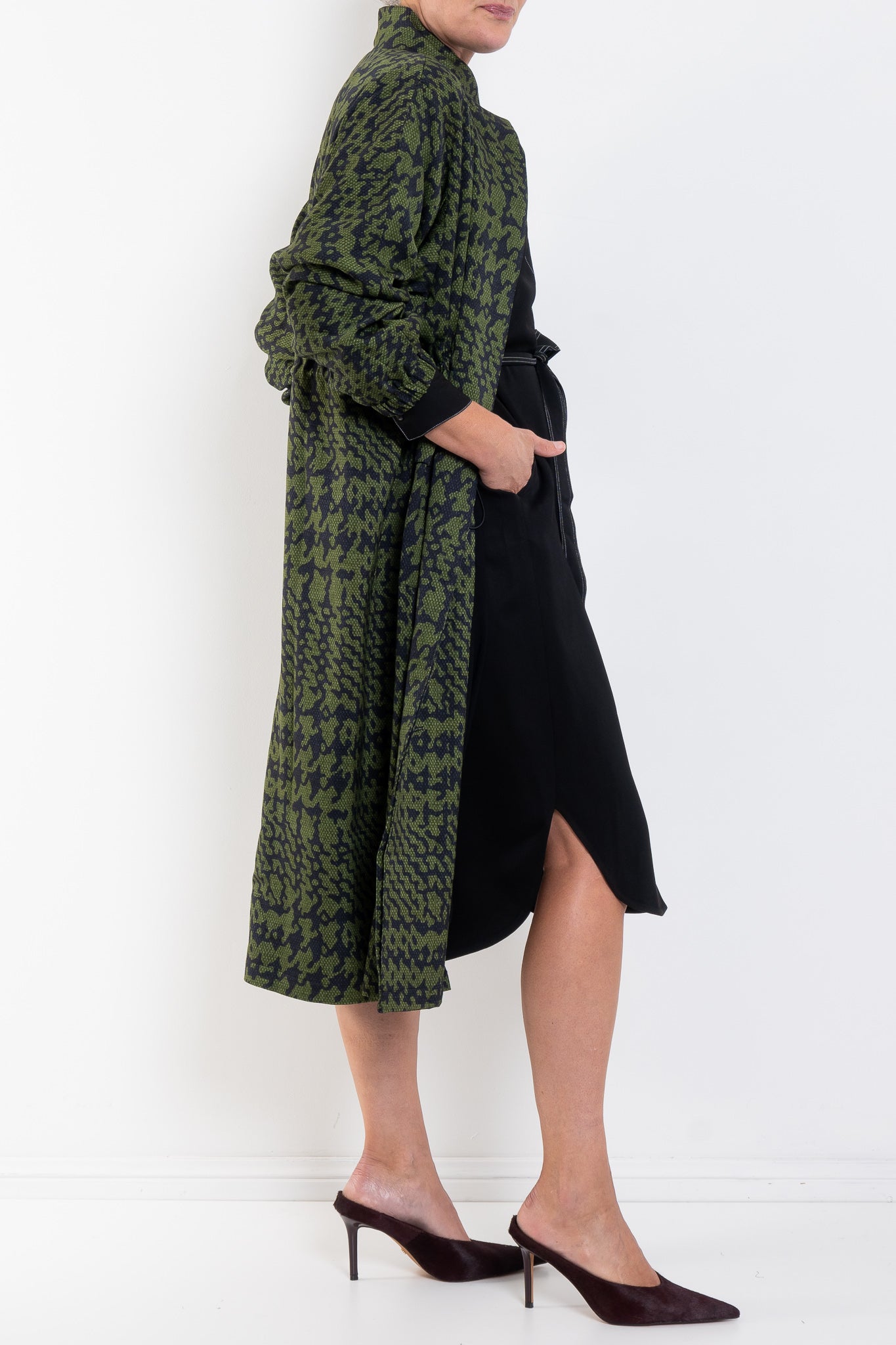 The Mitte Coat is a striking longline style crafted from a textured, silky crepe fabric printed in the Portus Print - a modern take on a houndstooth. This relaxed fit coat features a stand collar with button-through front and concealed placket, elasticated drawstring waist and internal toggles for an adjustable defined waist. The full-length sleeves have batwing shaping through the back and dropped shoulder with set-in sleeves at the front. A fully lined body with front patch pockets in a midi-length with subtle side splits. Wear cinched for shape or loose for effortless drape, pair with the Mitte Pant for a complete print ensemble.