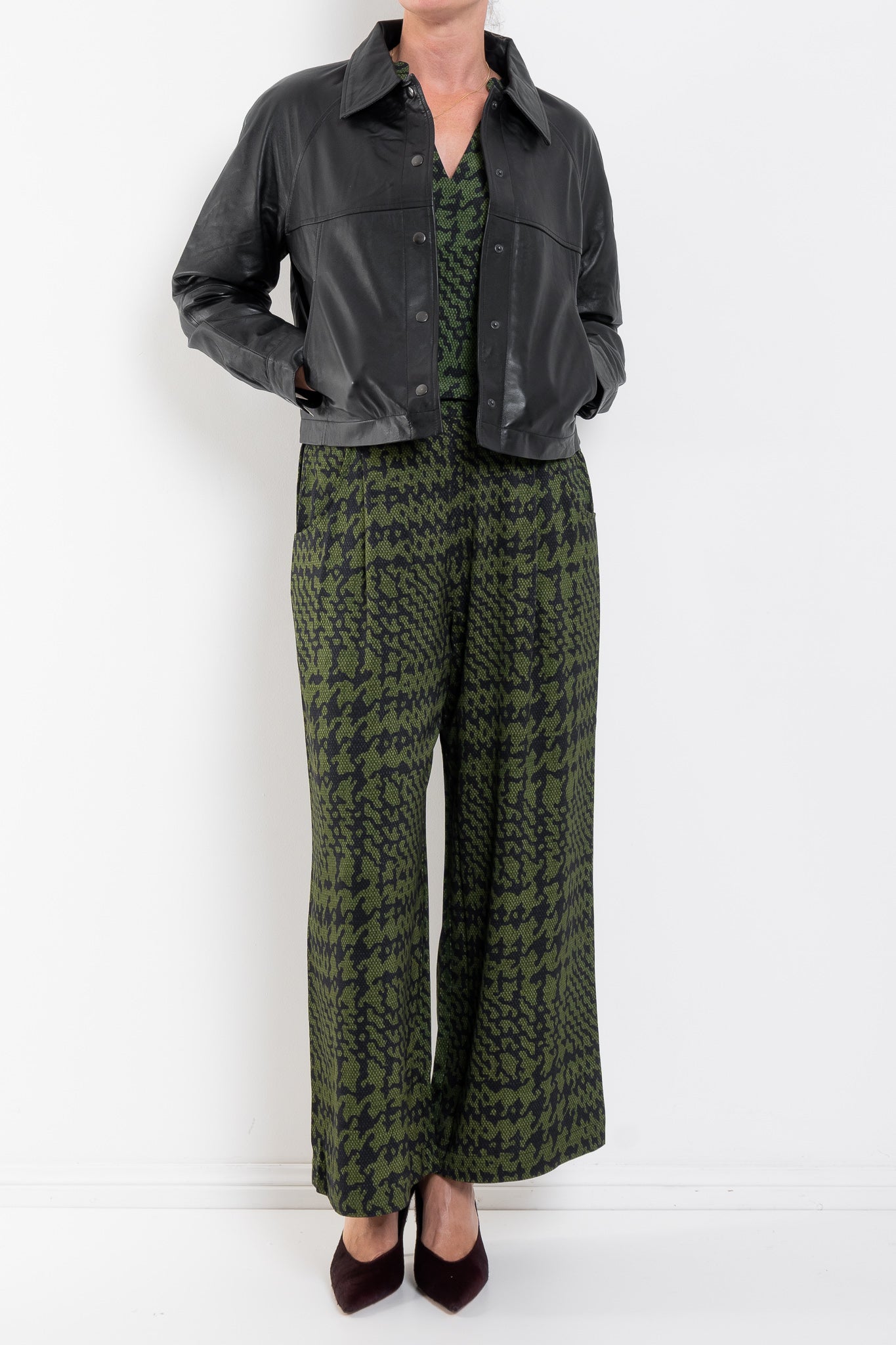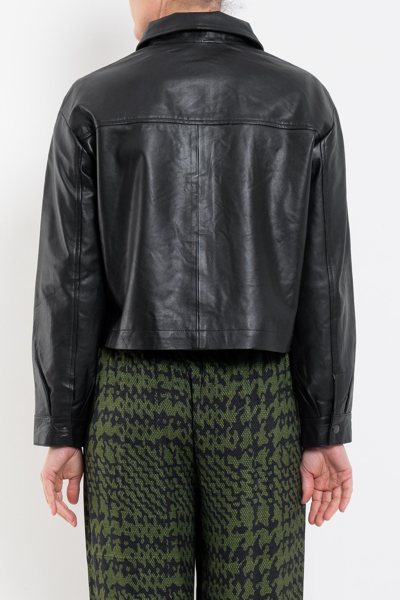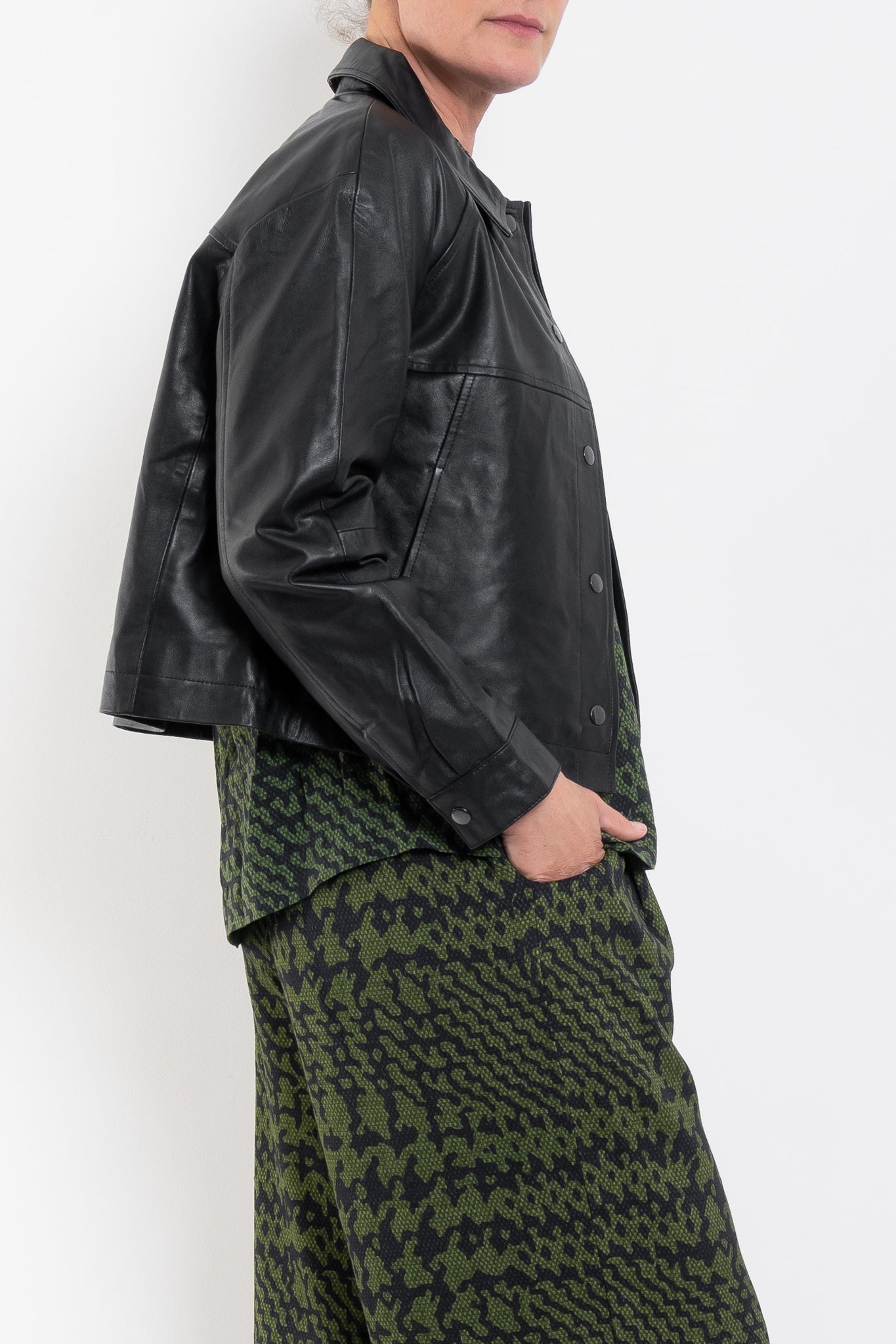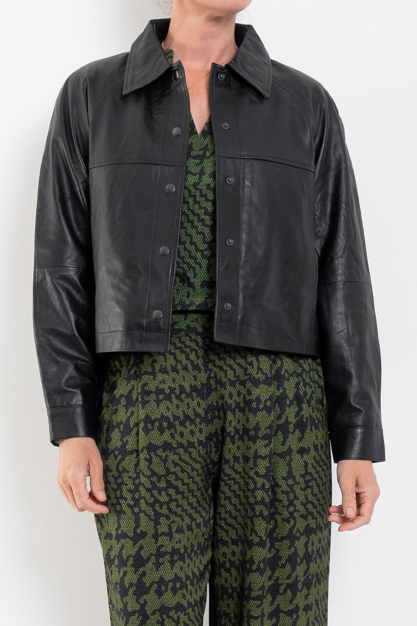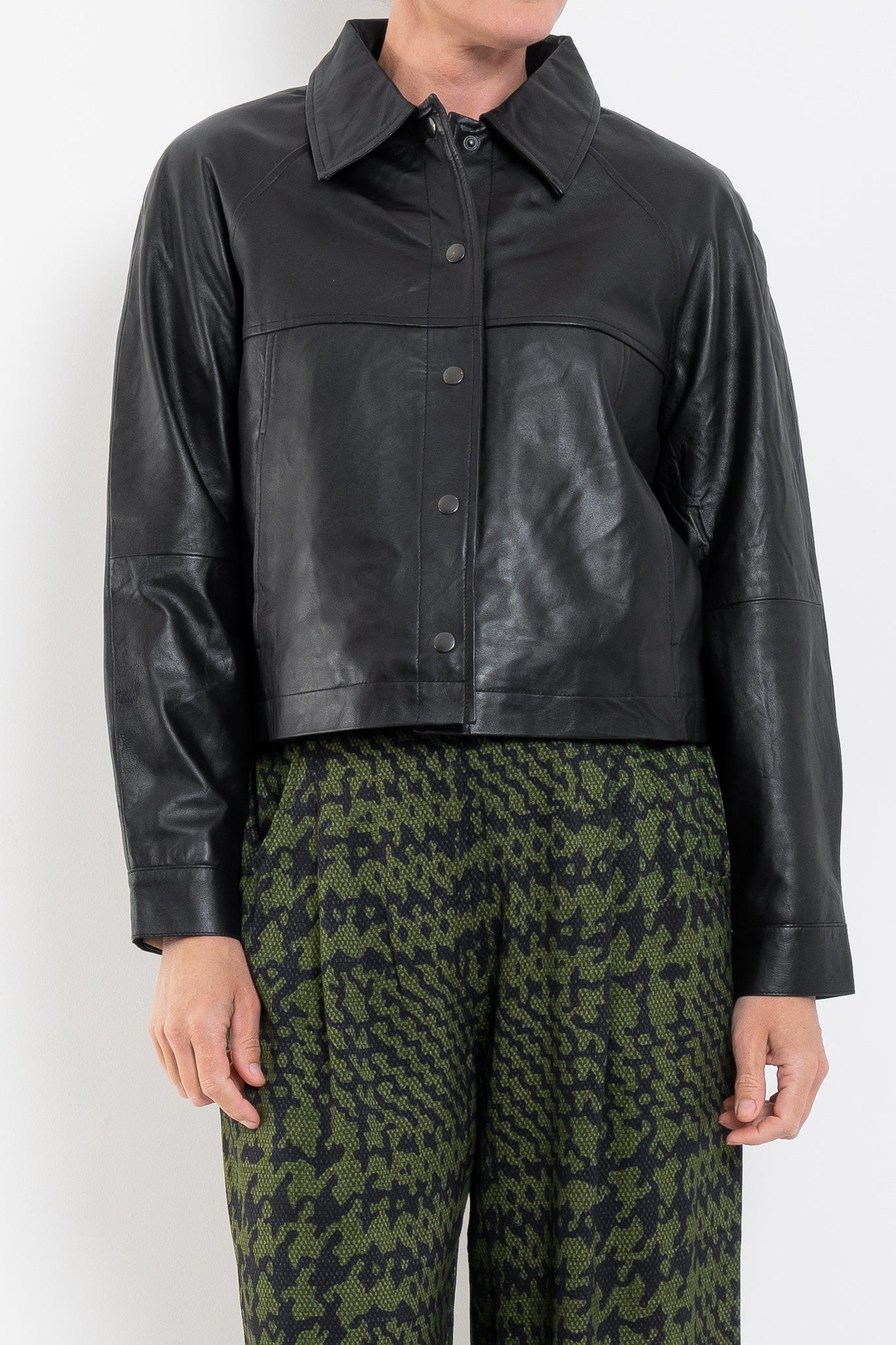 The Nahka Leather Jacket is a fresh new leather jacket style crafted from a soft lamb leather. This regular fit short jacket features a classic shirt collar, front yoke detail, and centre front placket with metal press-stud button closure. The long raglan sleeves with press stud cuffs and functional front pockets, create a refined silhouette. A timeless leather jacket for elevated wear, style for evening occasions over dresses and tailored bottoms or for more relaxed day-time wear, style with dark denim.