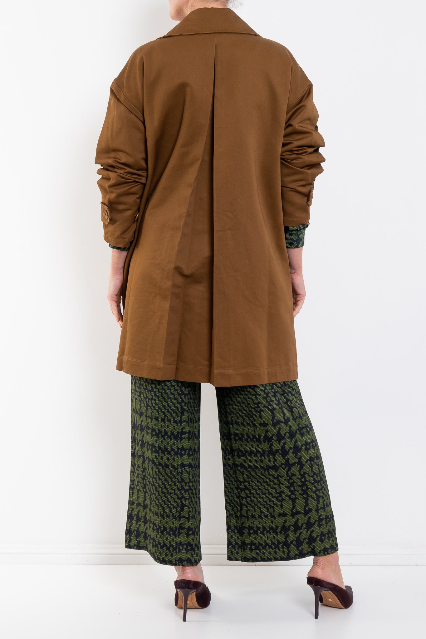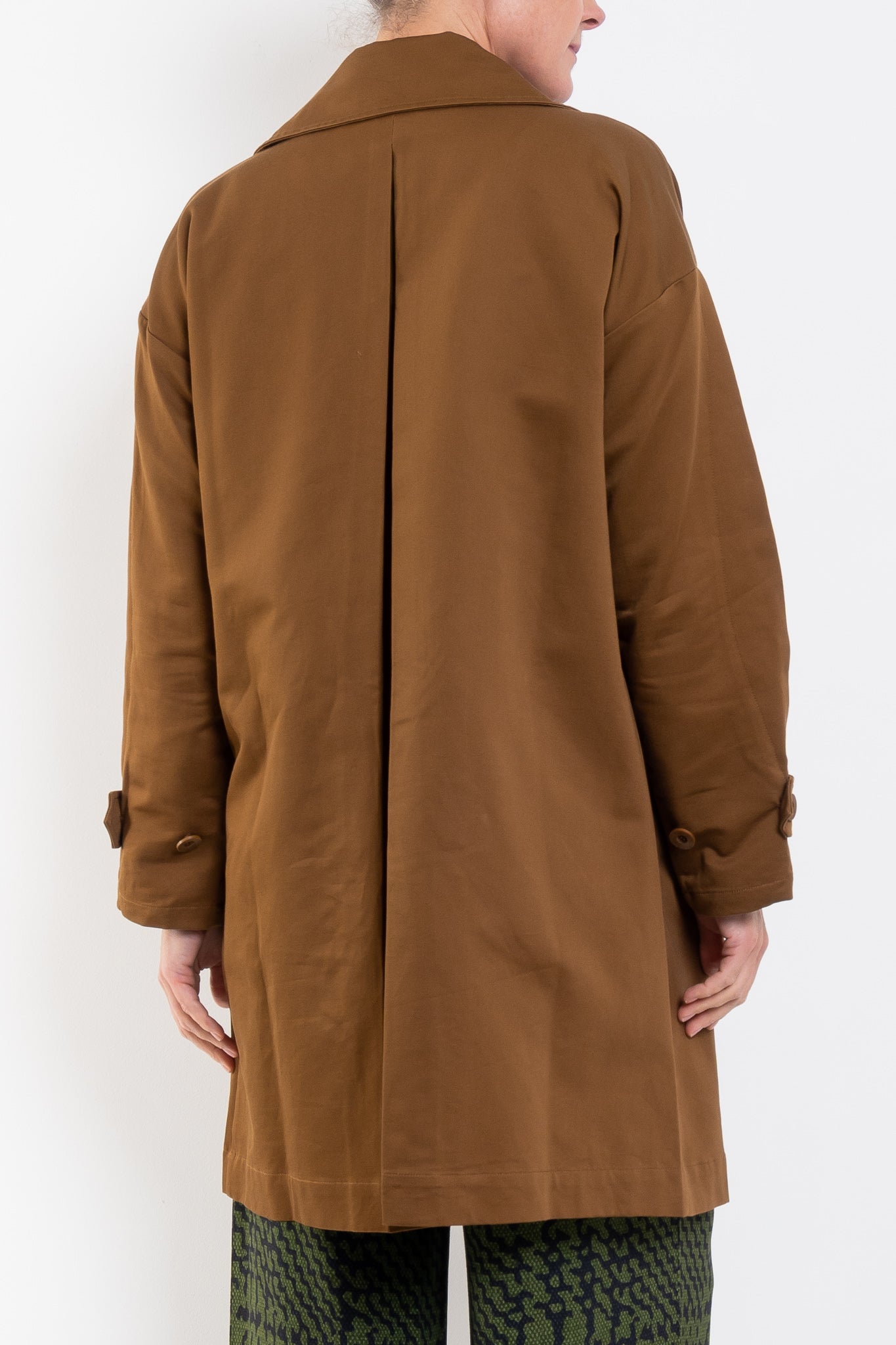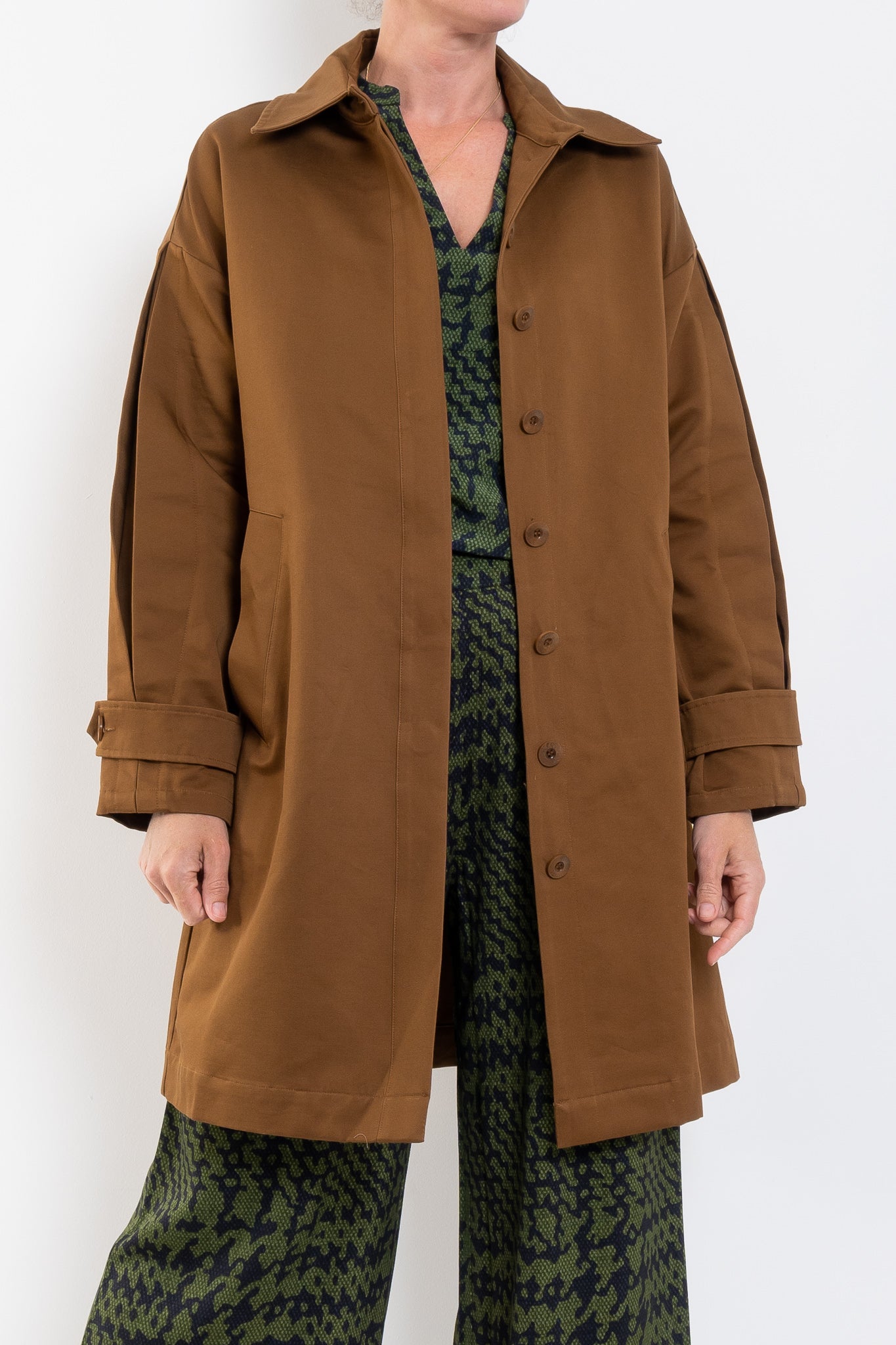 The Talli Jacket is a longline style crafted from a midweight, structured organic cotton stretch twill. This regular fit jacket features a classic shirt-style collar, centre front placket with concealed Corozo button closure, and dropped shoulder seams. The long sleeves have adjustable cuff tabs with decorative box pleats at the outer sleeve for added volume and interest. Vertical angled front welt pockets and a back yoke with inverted box pleat create a clean, tailored silhouette. Pair with the Talli Pant for a coordinated ensemble or over your favourite autumn-winter, smart casual outfits.