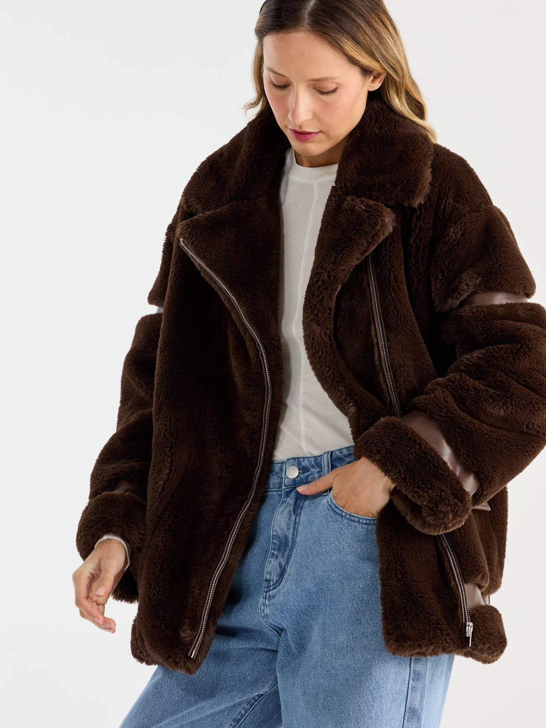 Add a touch of luxury to your wardrobe with the Ena Pelly Clover Faux Fur Jacket. Made from 100% recycled polyester, this sustainable jacket offers a cosy and comfortable feel. Its relaxed fit, alternative leather trims, and press stud pocket flaps make it perfect for layering.