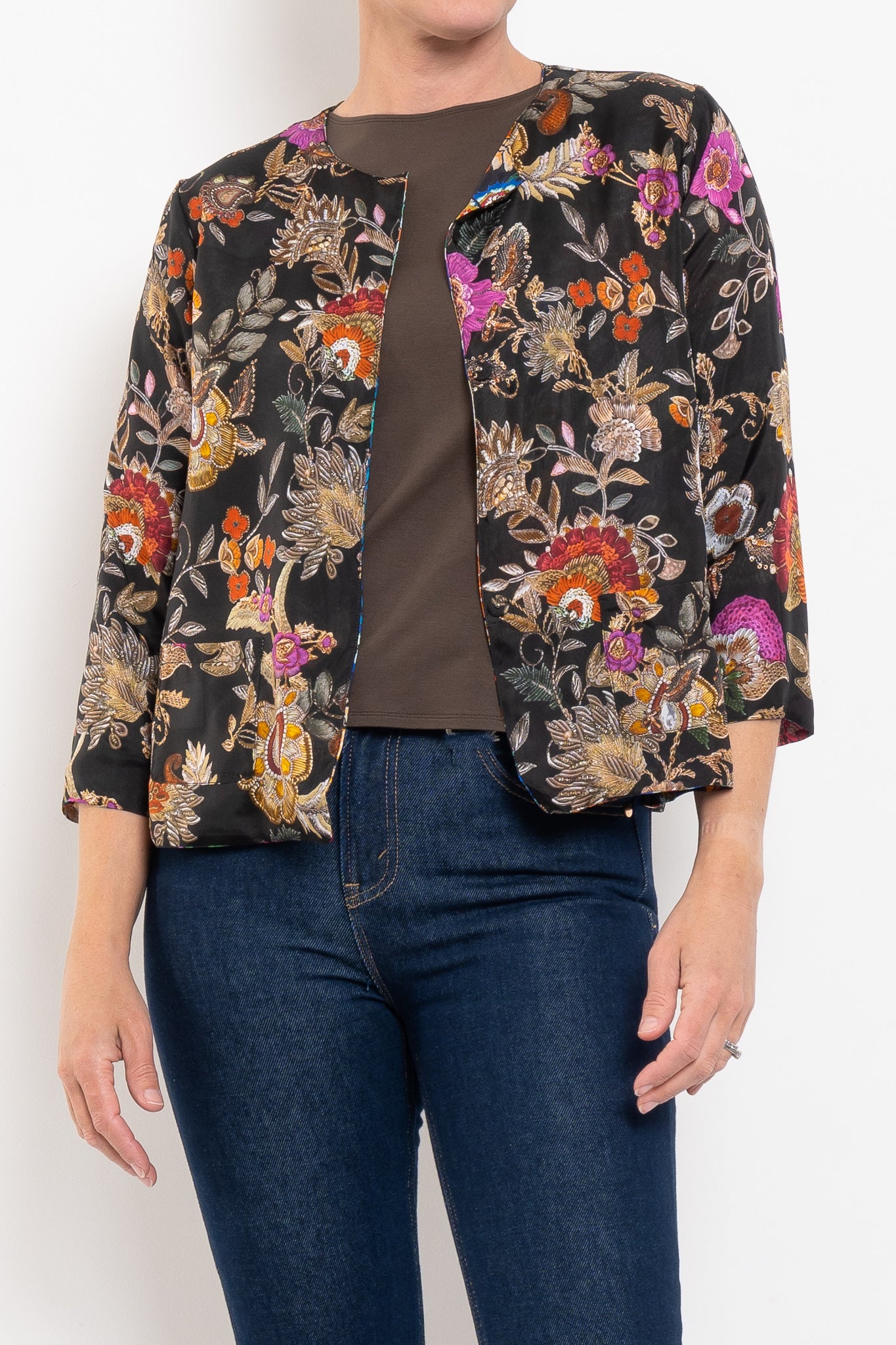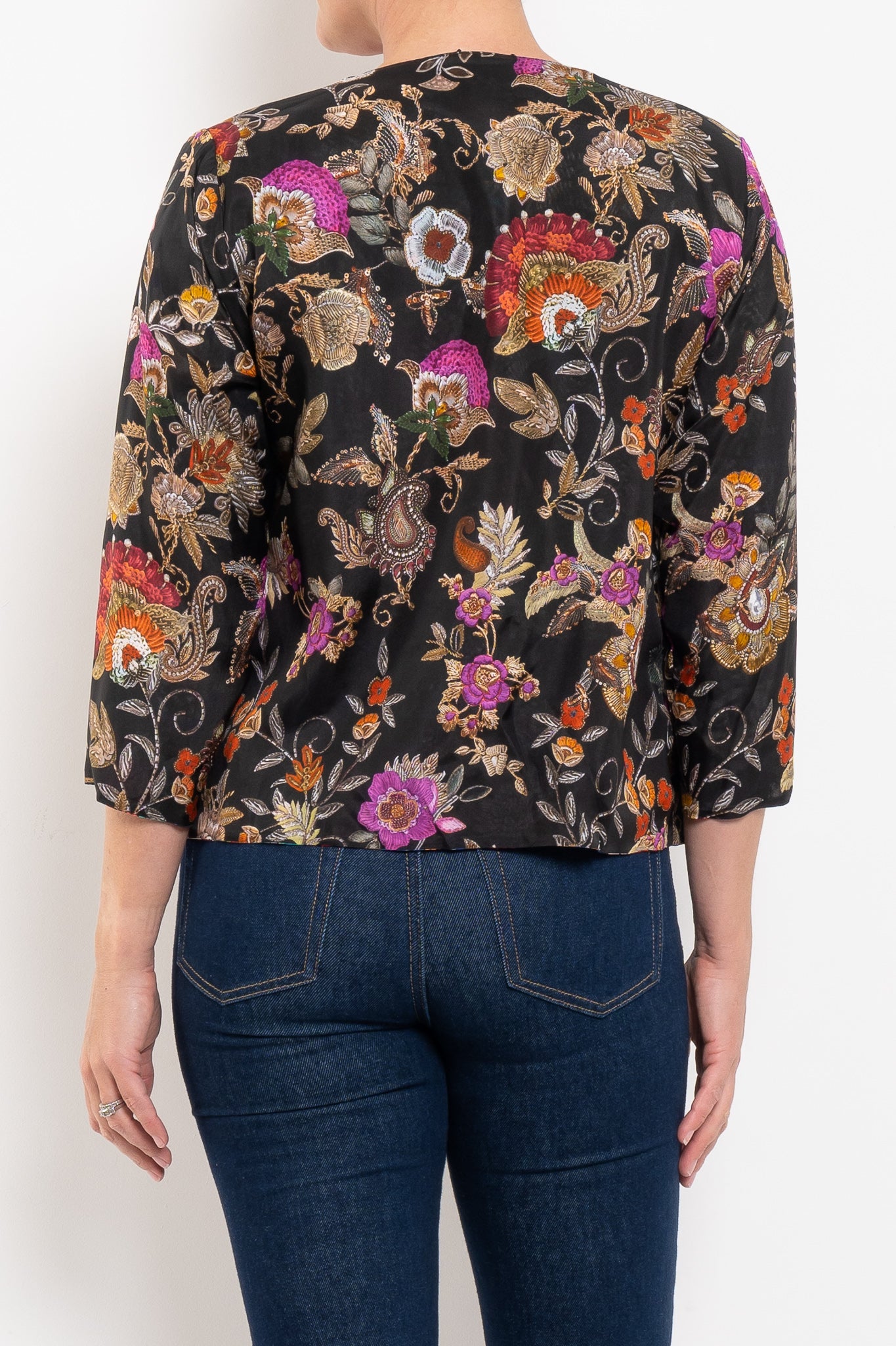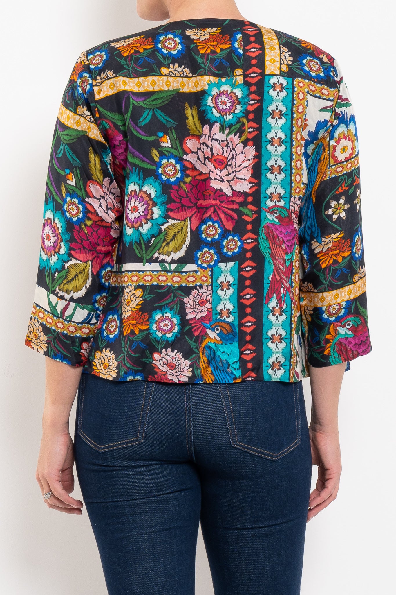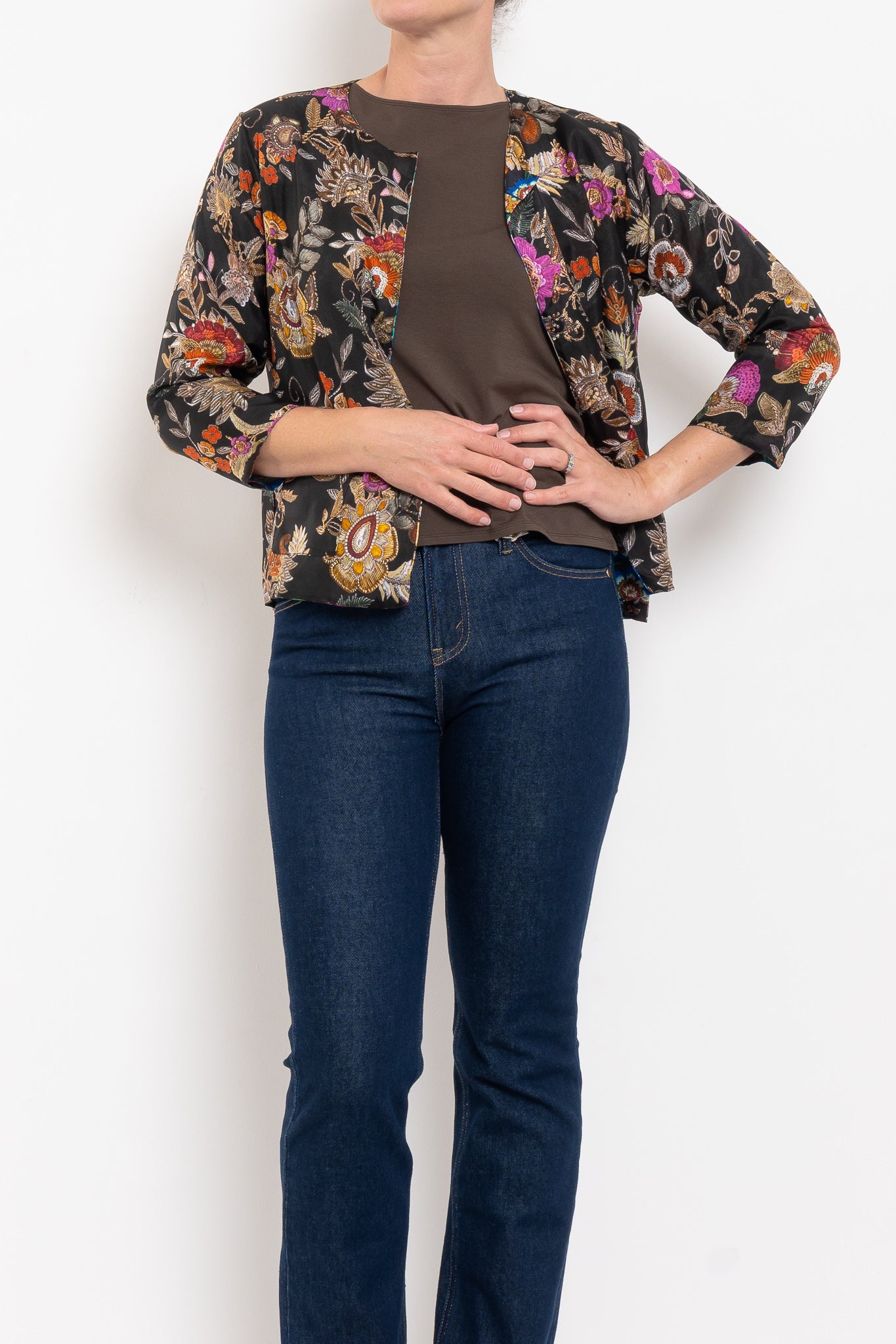 Crafted from 100% silk, the Ruby Jacket is fluid, luxurious, and designed to drape beautifully. Fully reversible, it gives you the choice of two unique prints: one side bold and vibrant, the other softer and more neutral with subtle pops of fuchsia. A round neckline and press-stud closure keep the silhouette simple and chic, while front pockets add a touch of practicality. A true statement layer that works from everyday styling through to evening occasions.