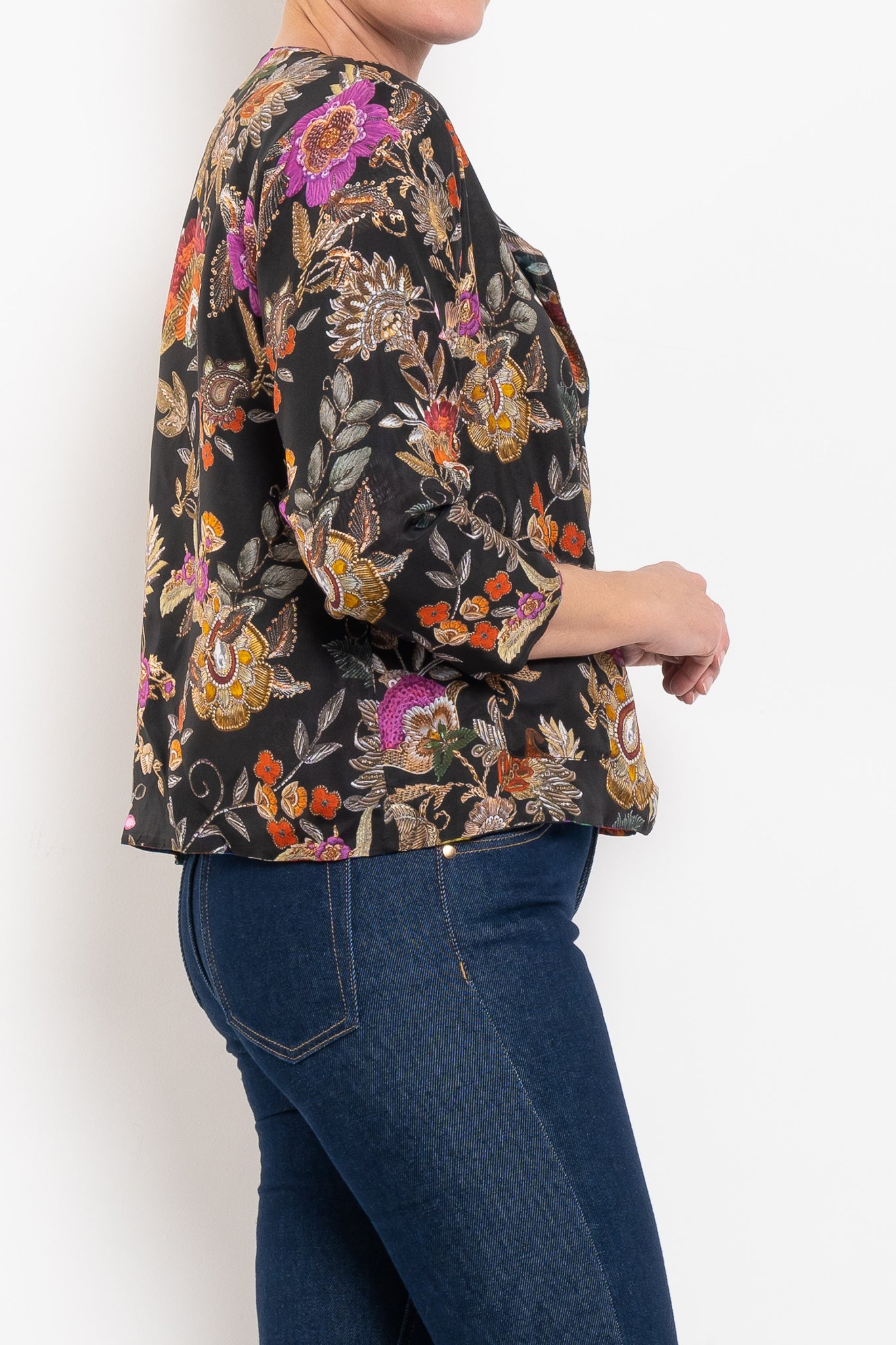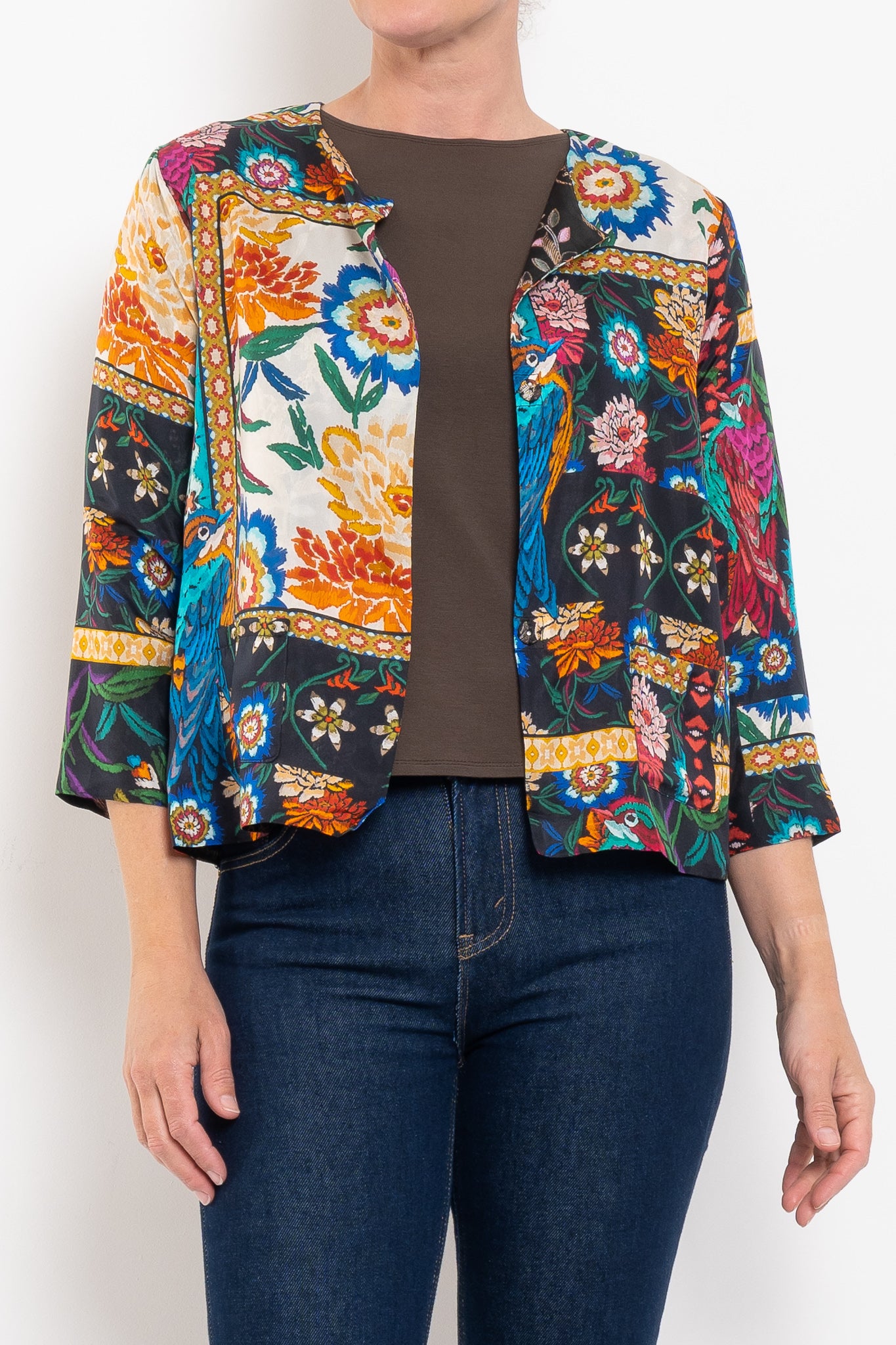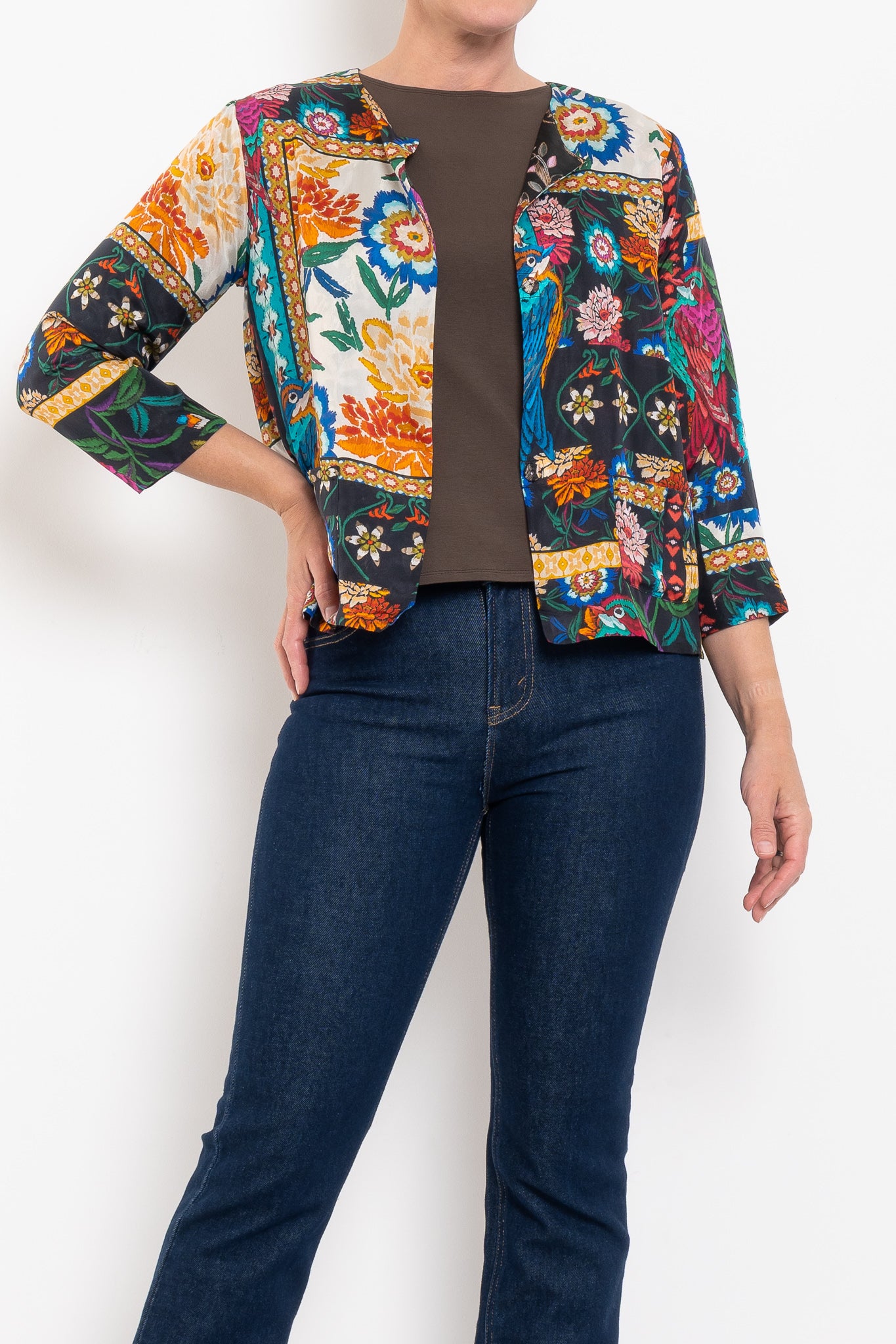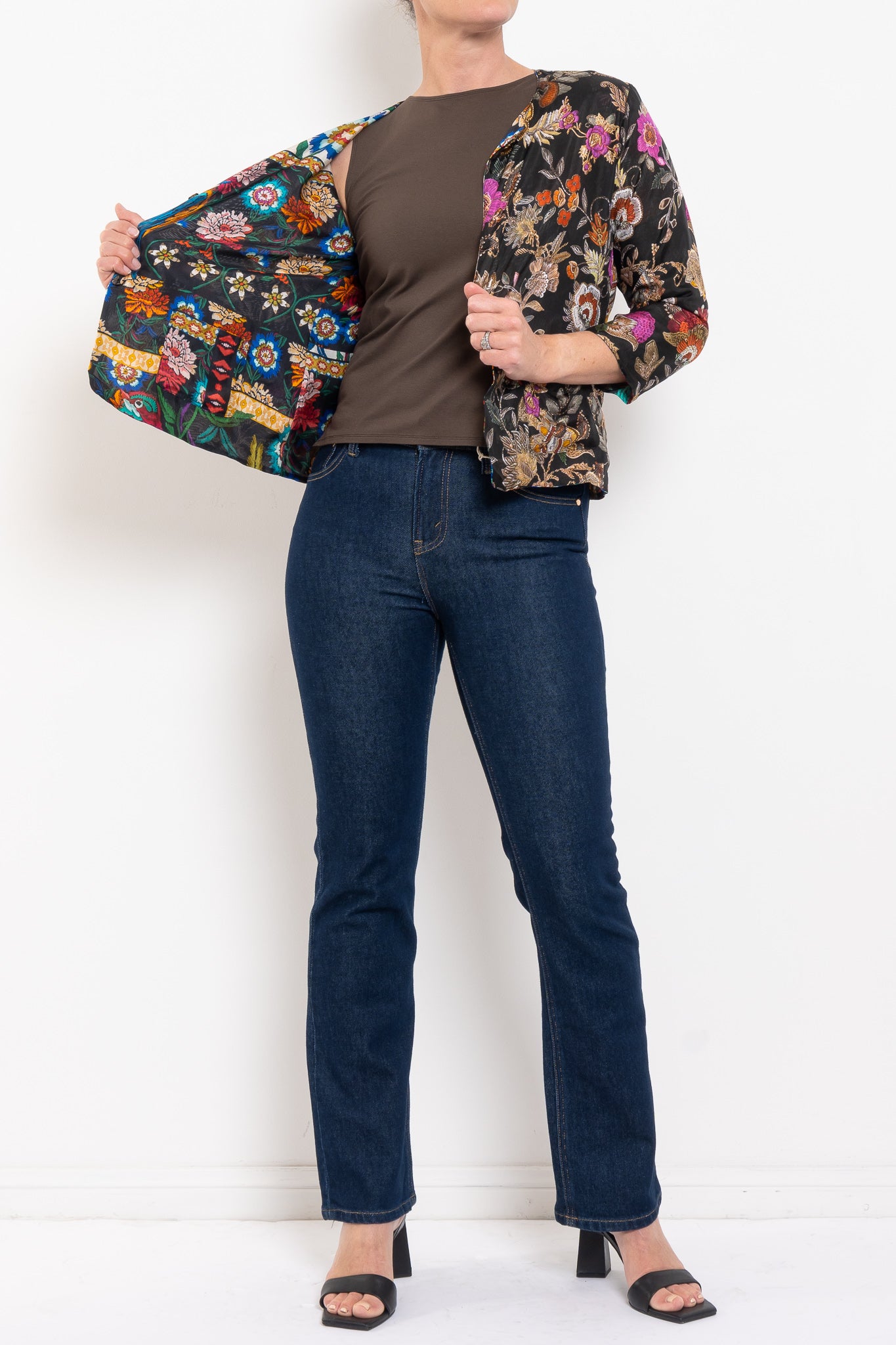 Crafted from 100% silk, the Ruby Jacket is fluid, luxurious, and designed to drape beautifully. Fully reversible, it gives you the choice of two unique prints: one side bold and vibrant, the other softer and more neutral with subtle pops of fuchsia. A round neckline and press-stud closure keep the silhouette simple and chic, while front pockets add a touch of practicality. A true statement layer that works from everyday styling through to evening occasions.
