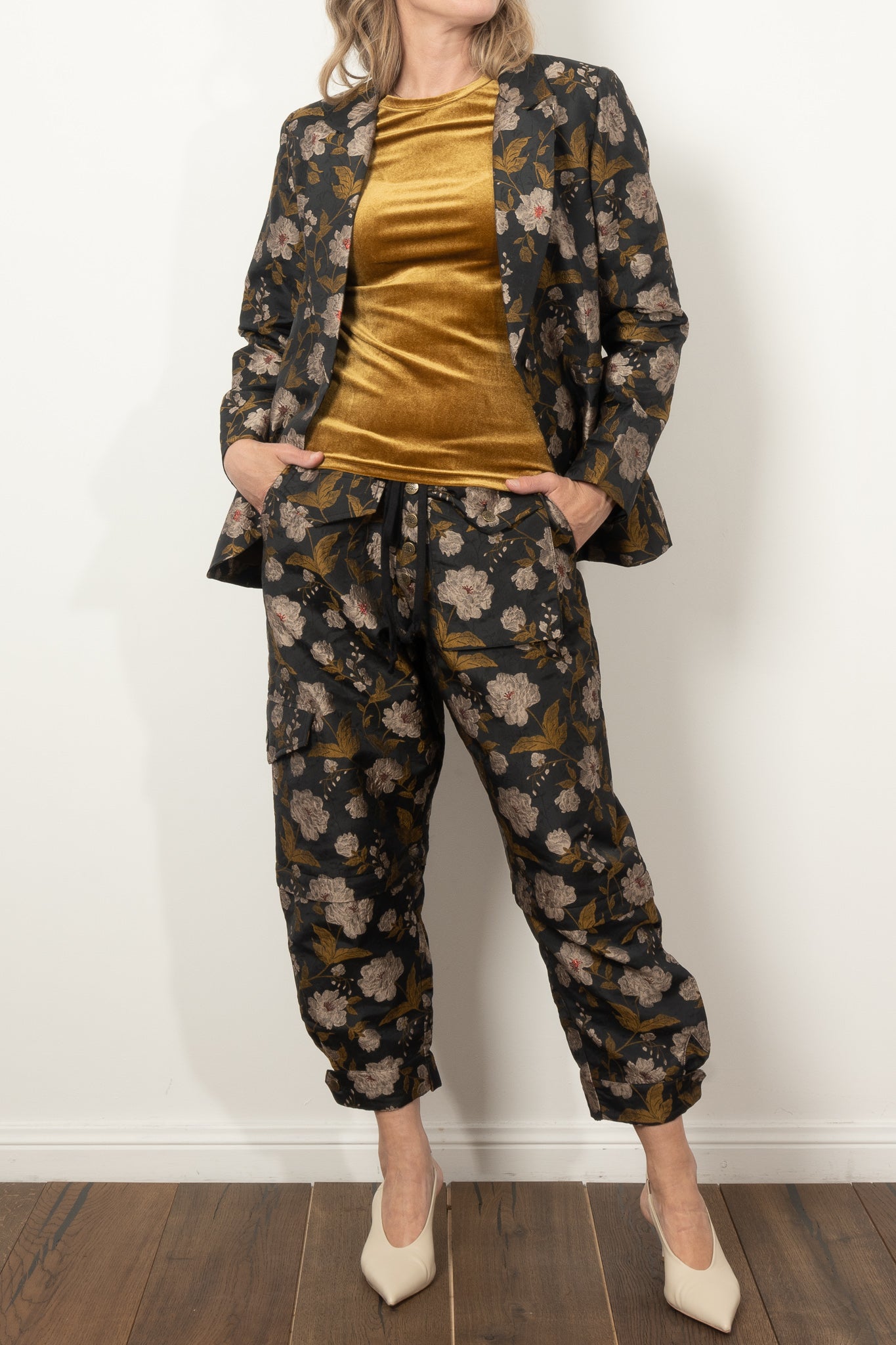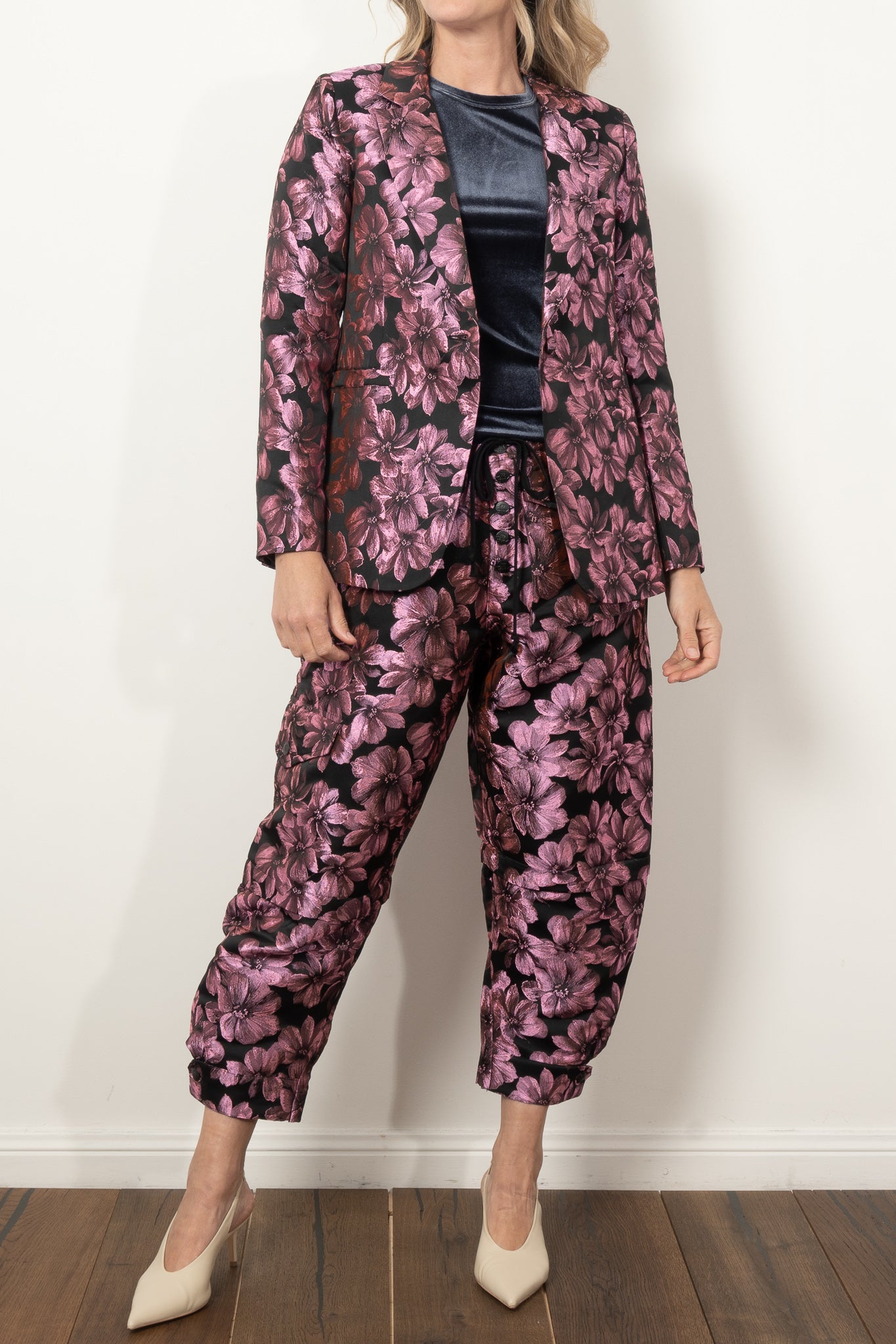 Tailored yet unapologetically bold, this shimmering brocade blazer by M.A. Dainty is a statement-maker in every sense. Available in two head-turning colourways—one with rich golden florals, the other with vibrant pink blooms—this structured piece brings polish and personality to any look. Style it with the matching pants or skirt for full drama, or throw it over denim to instantly elevate your everyday. A modern twist on classic tailoring, finished in luxe, light-catching fabric.