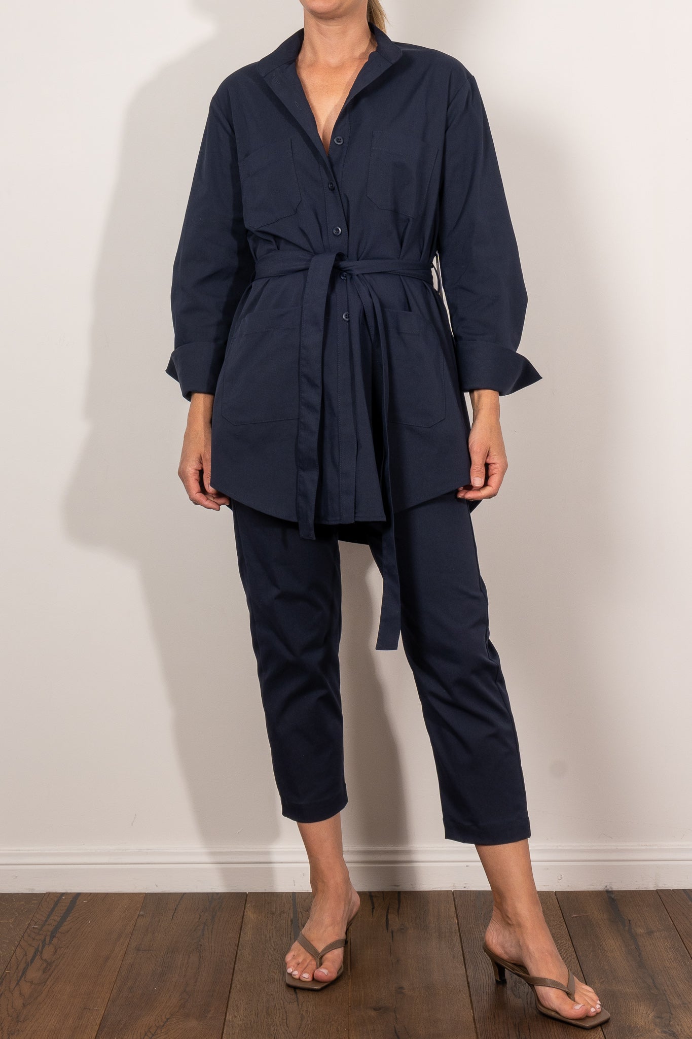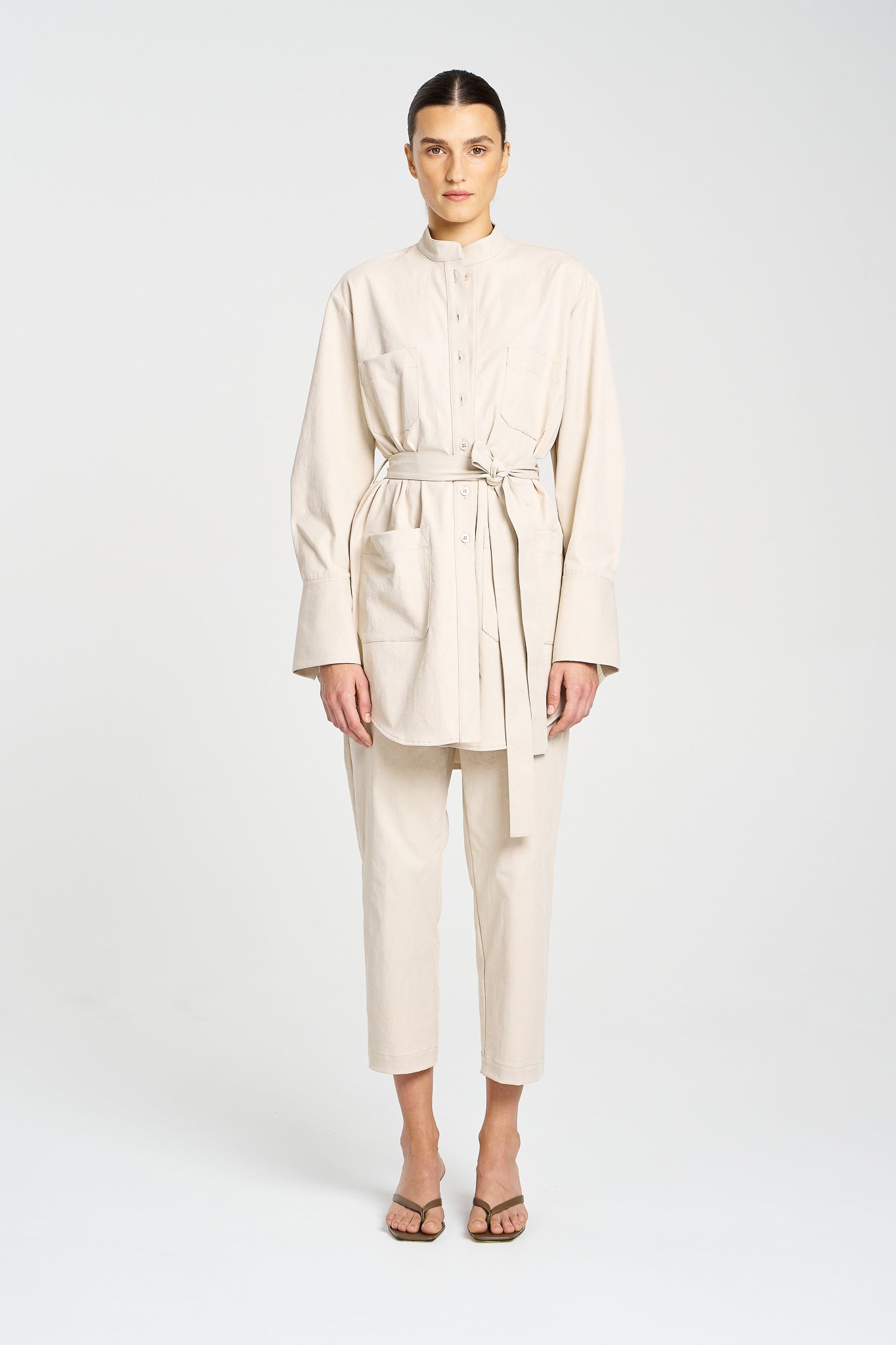 Utility meets polish in the Safari Jacket, crafted from Mela Purdie’s innovative Gravitene — a compressed Memory Stretch Micro Twill that offers subtle structure with a soft cotton-like feel. Designed for effortless layering, this modern take on the classic utility jacket features a petite stand collar, full-length sleeves, and four functional patch pockets. A curved hemline and waist tie lend a flattering shape to the relaxed silhouette.