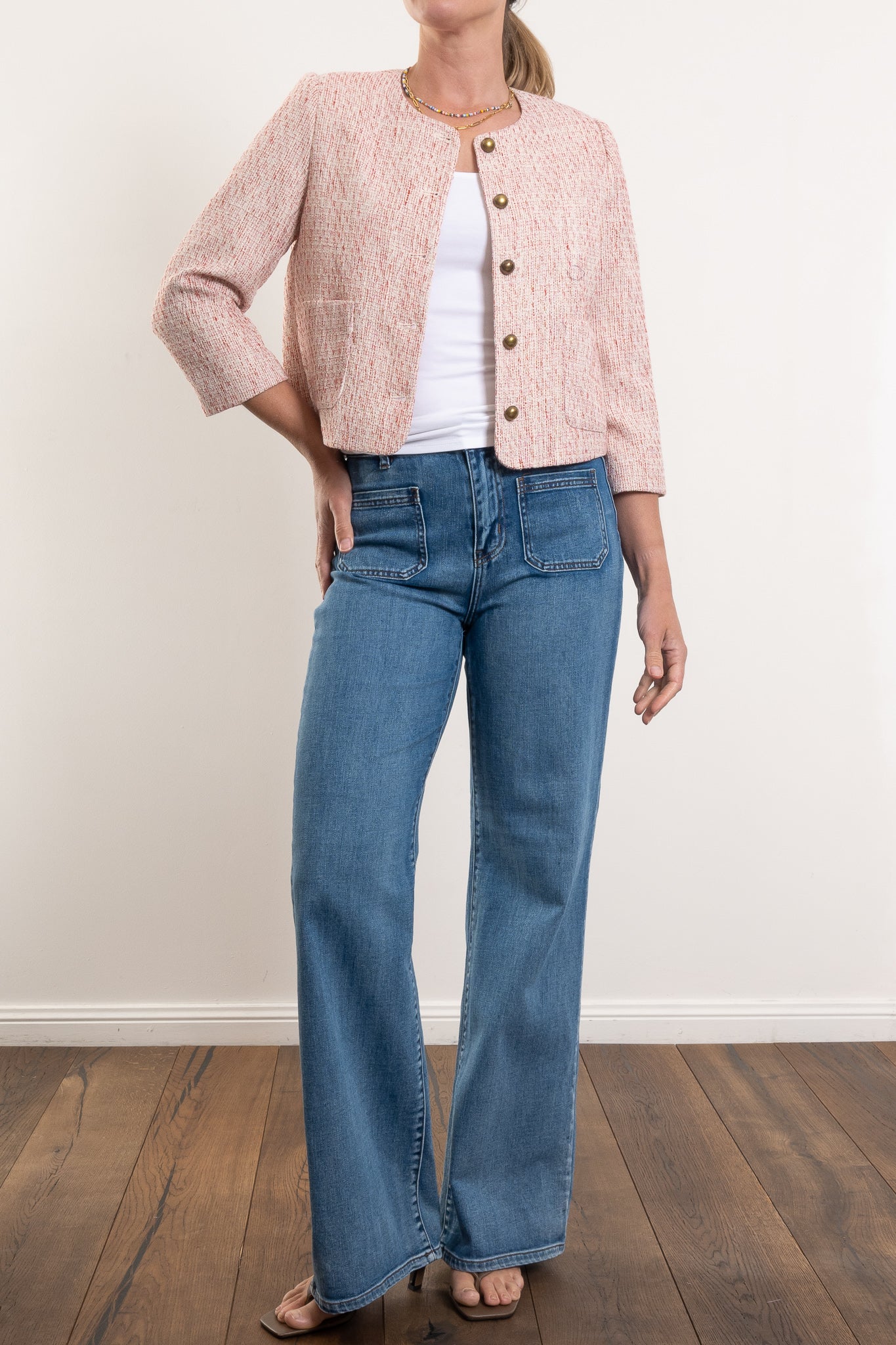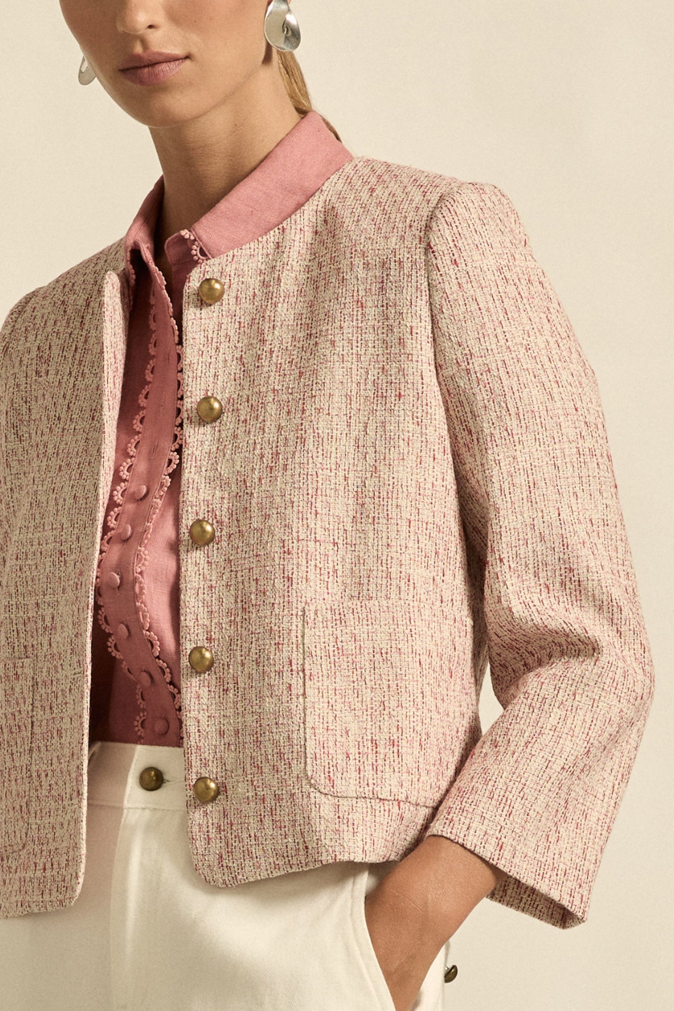 Sweet, structured, and effortlessly polished—the Dash Jacket is a feminine take on tailored layering. Crafted in 100% cotton boucle and lined with soft stretch for all-day comfort, this cropped jacket balances modern romance with refined detail.