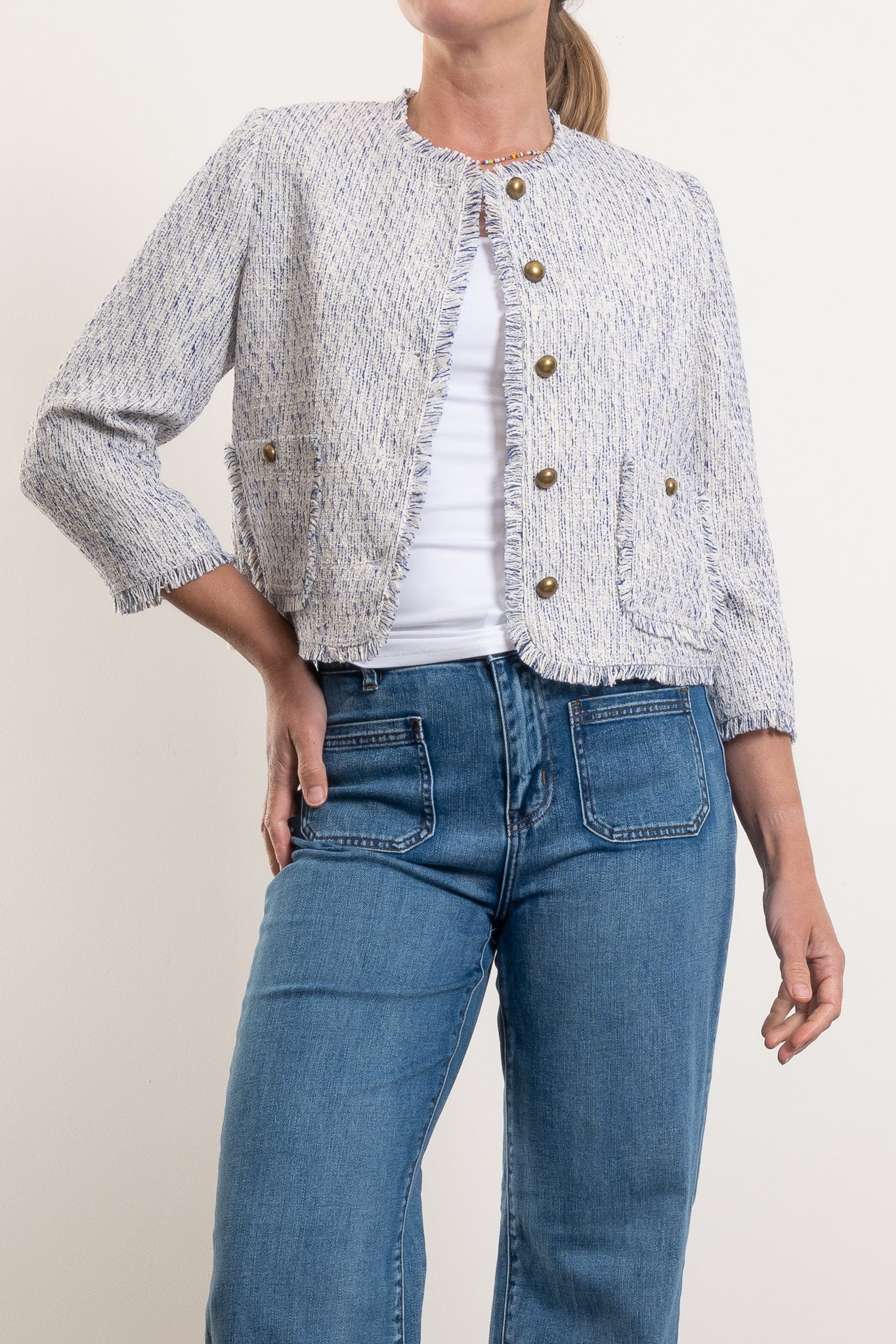 The Zeal Jacket blends elegance with ease, offering a soft take on tailoring that suits both coastal escapes and everyday polish. Woven with subtle blue tones for a rich, textured finish, this cropped jacket features a round neckline, fringed edging, and brushed-brass dome buttons for a modern classic feel.
