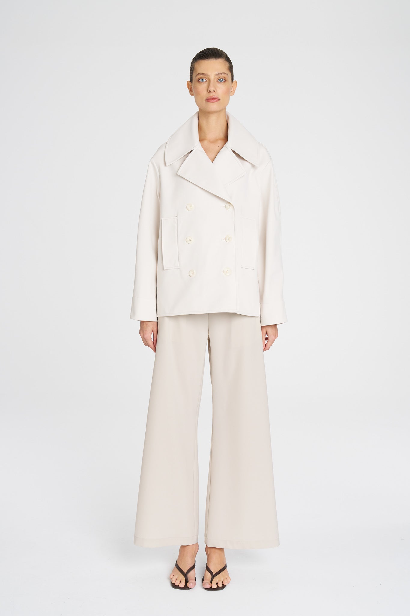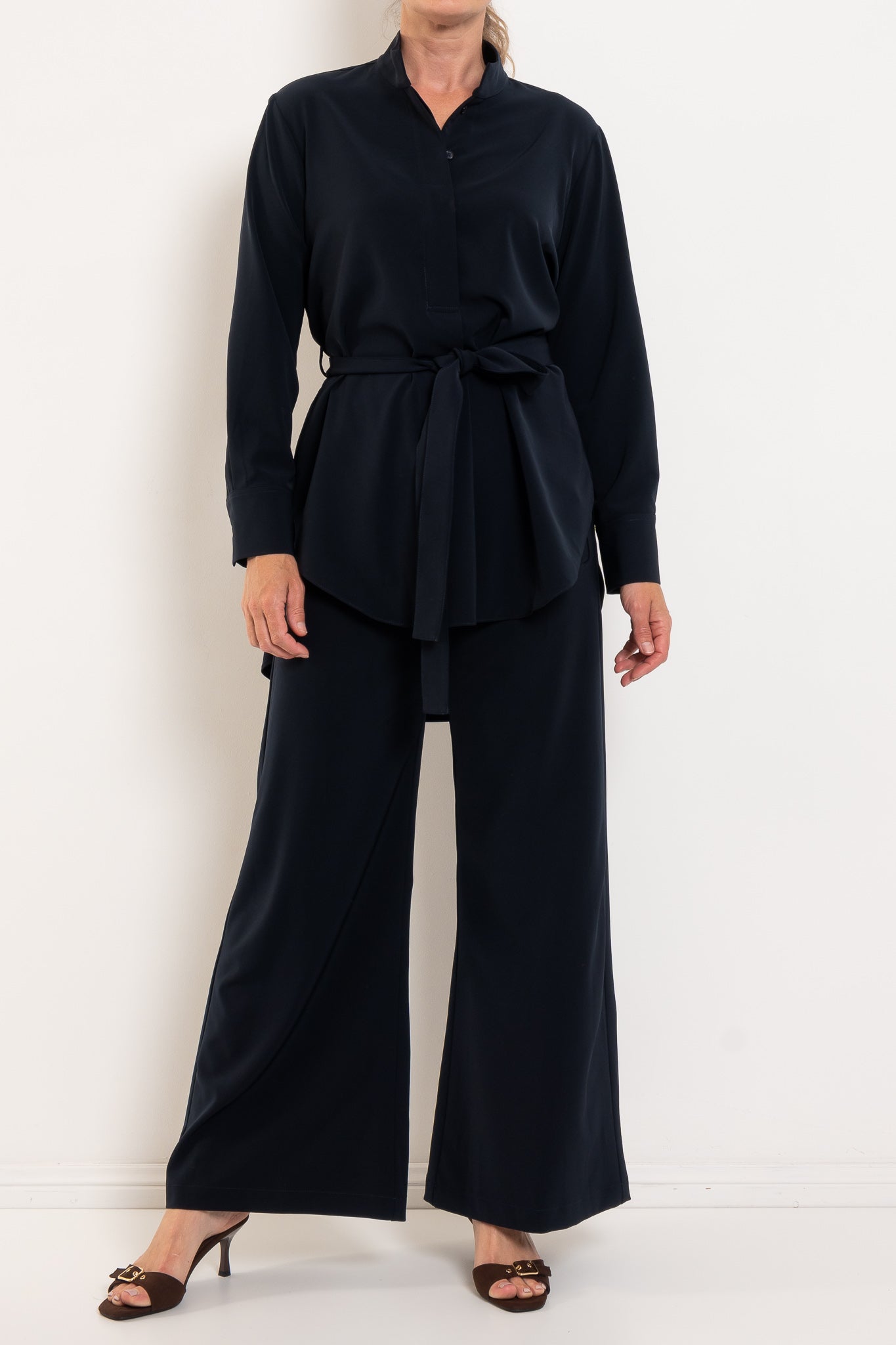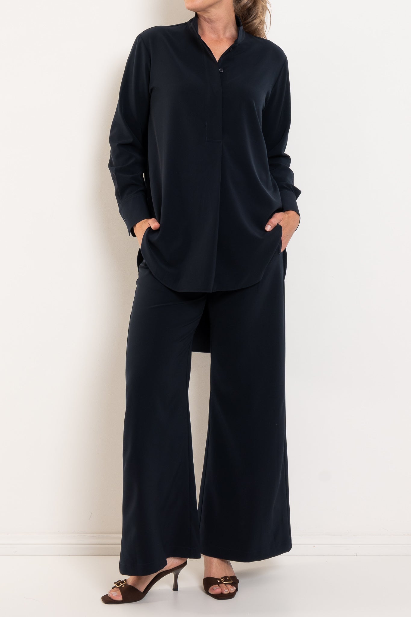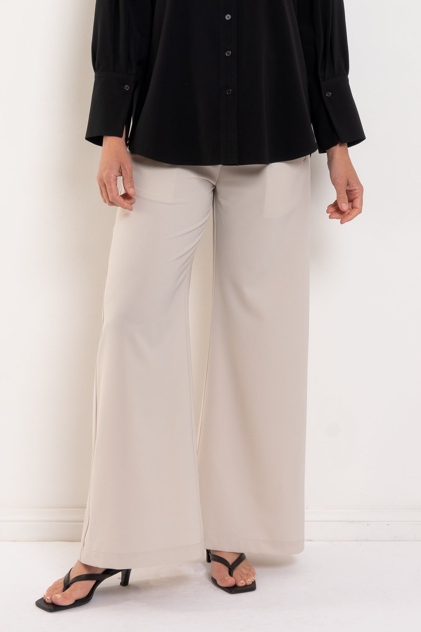 - Wide leg silhouette for modern proportion