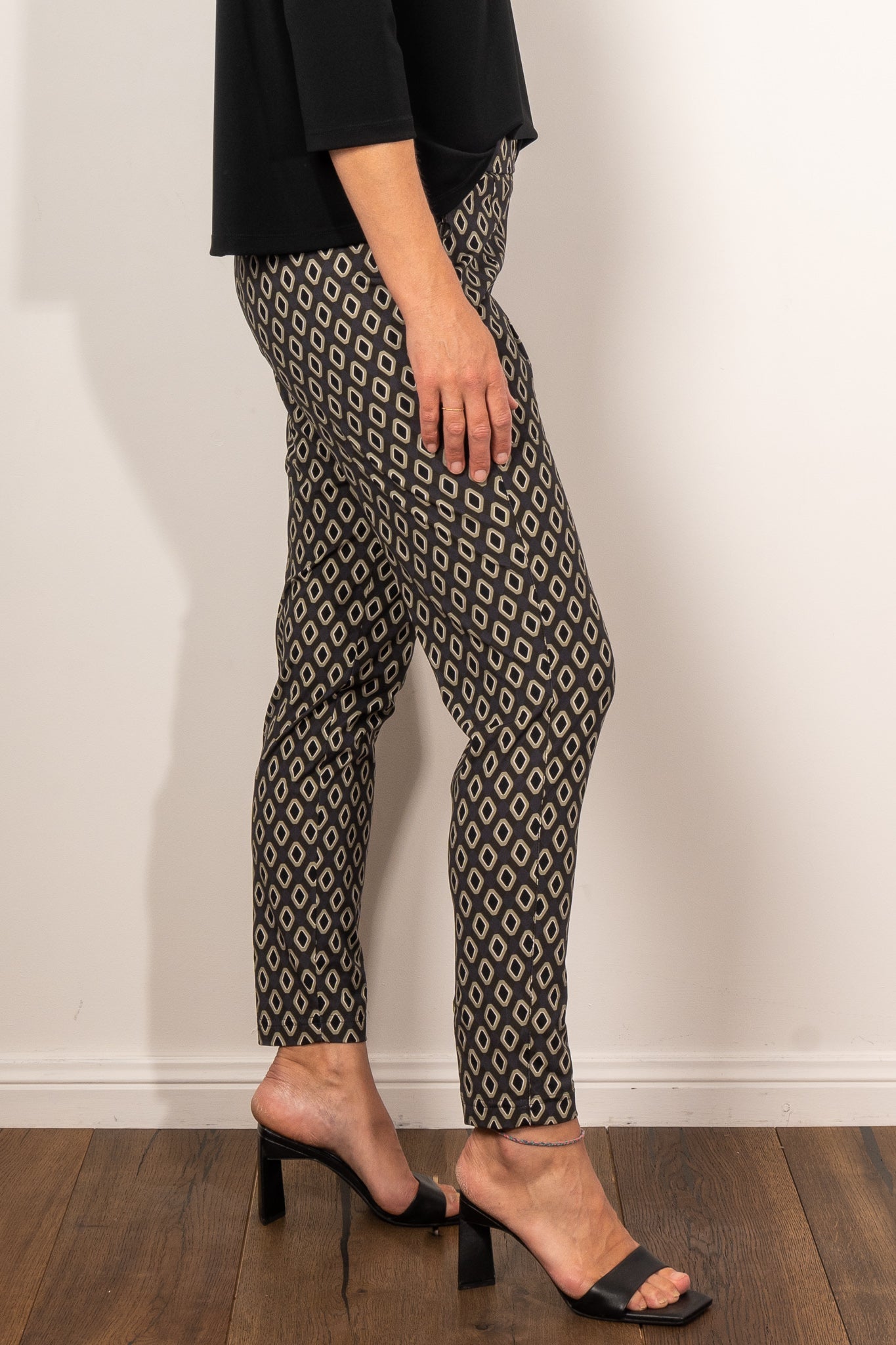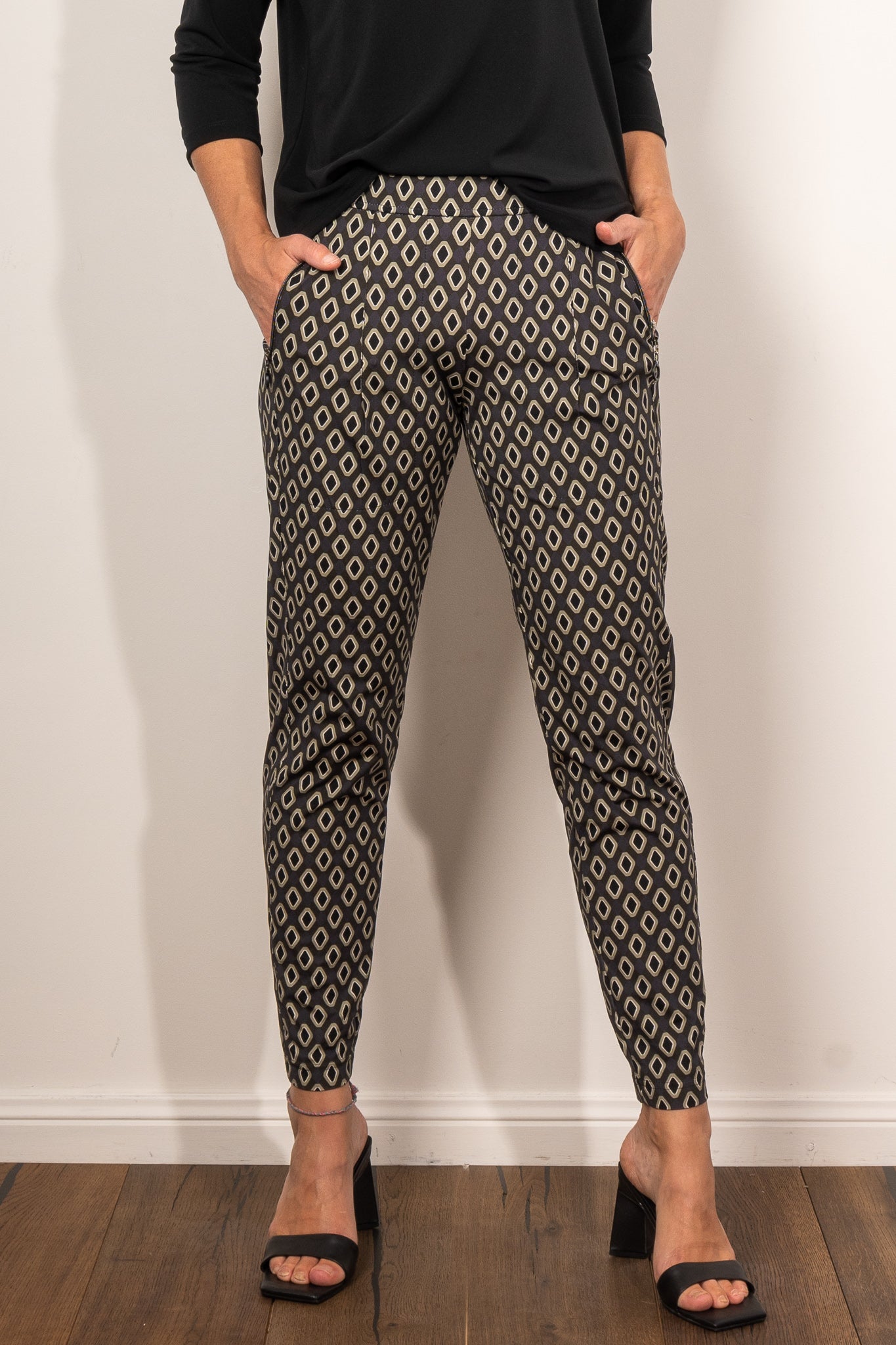 Indulge in luxury with the Raffaello Rossi Candy Graphical Rhombus Pant. Featuring a trendy geo print, zipped pockets, and a fitted ankle, this pant brings a fresh take on the best selling candy shape. Made from a stretchy viscose blend, it boasts a flat waistband and front pleat detailing for a sophisticated look.