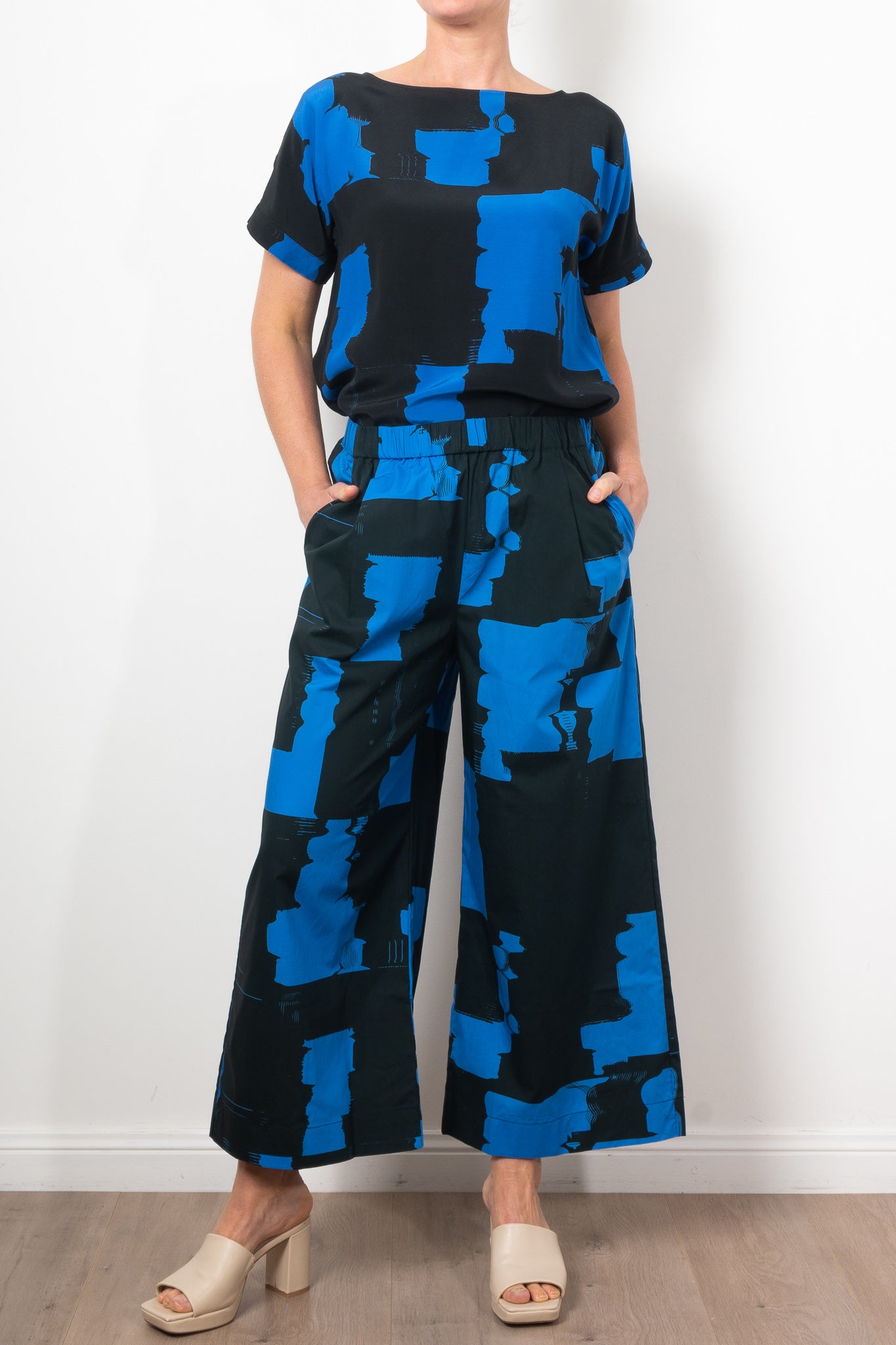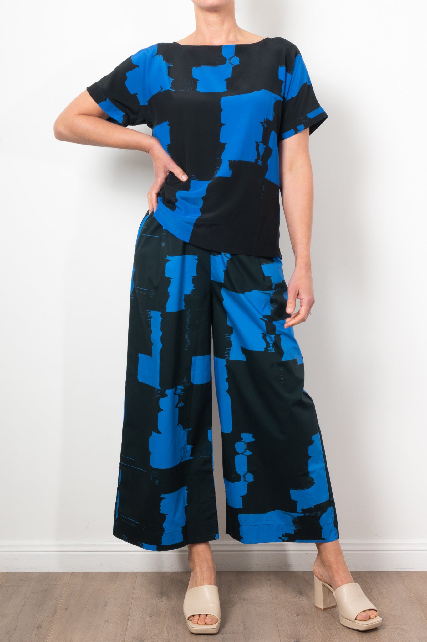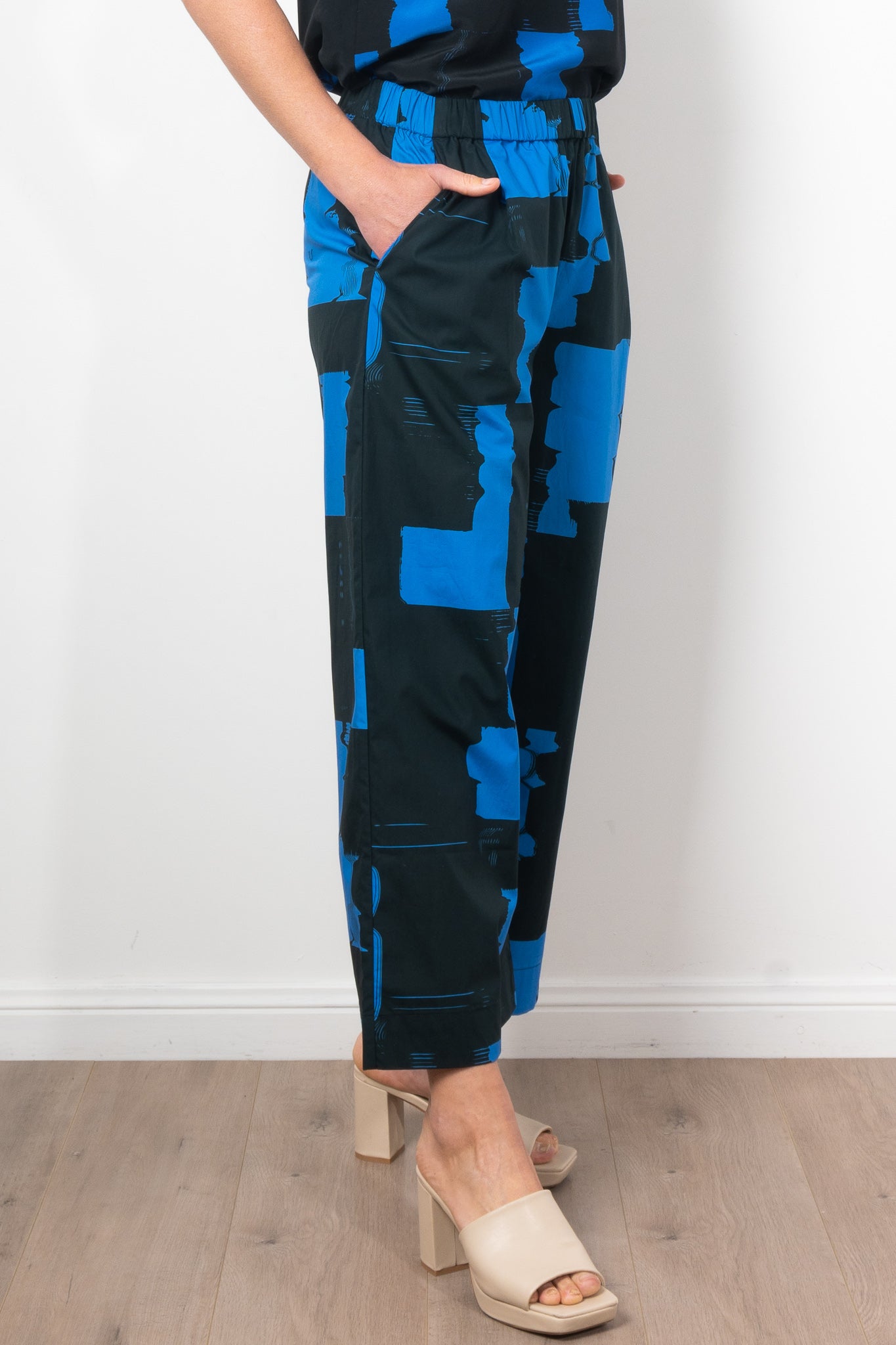 The Deze Pant is a statement, wide-leg pant featuring the limited seasonal Blue Rolla Print - an abstract gestural print in complementary shades of blue. A high-rise fully elasticated waist band sits naturally on the waist. Crafted from Australian-grown cotton. A bold piece, pair back the Deze Pant with a simple white tee and sneakers. The Blue Rolla Print is a yardage print so placement on each garment will vary.