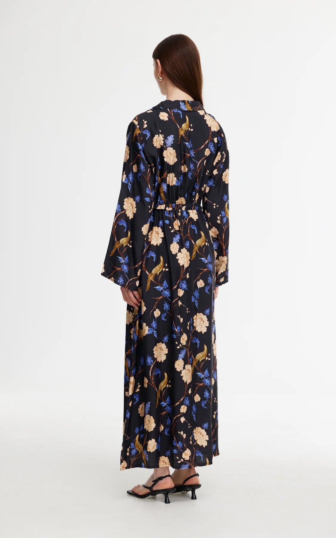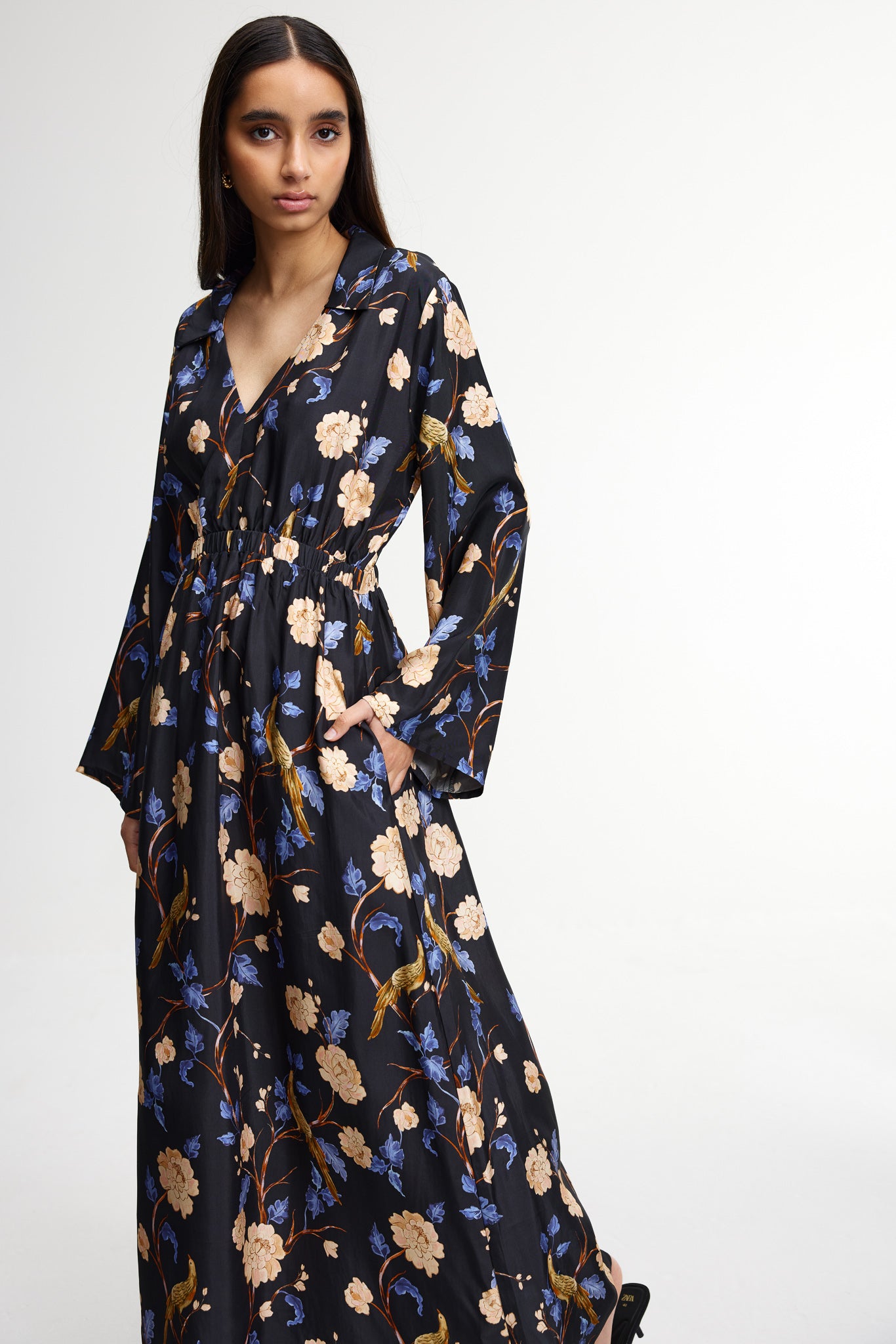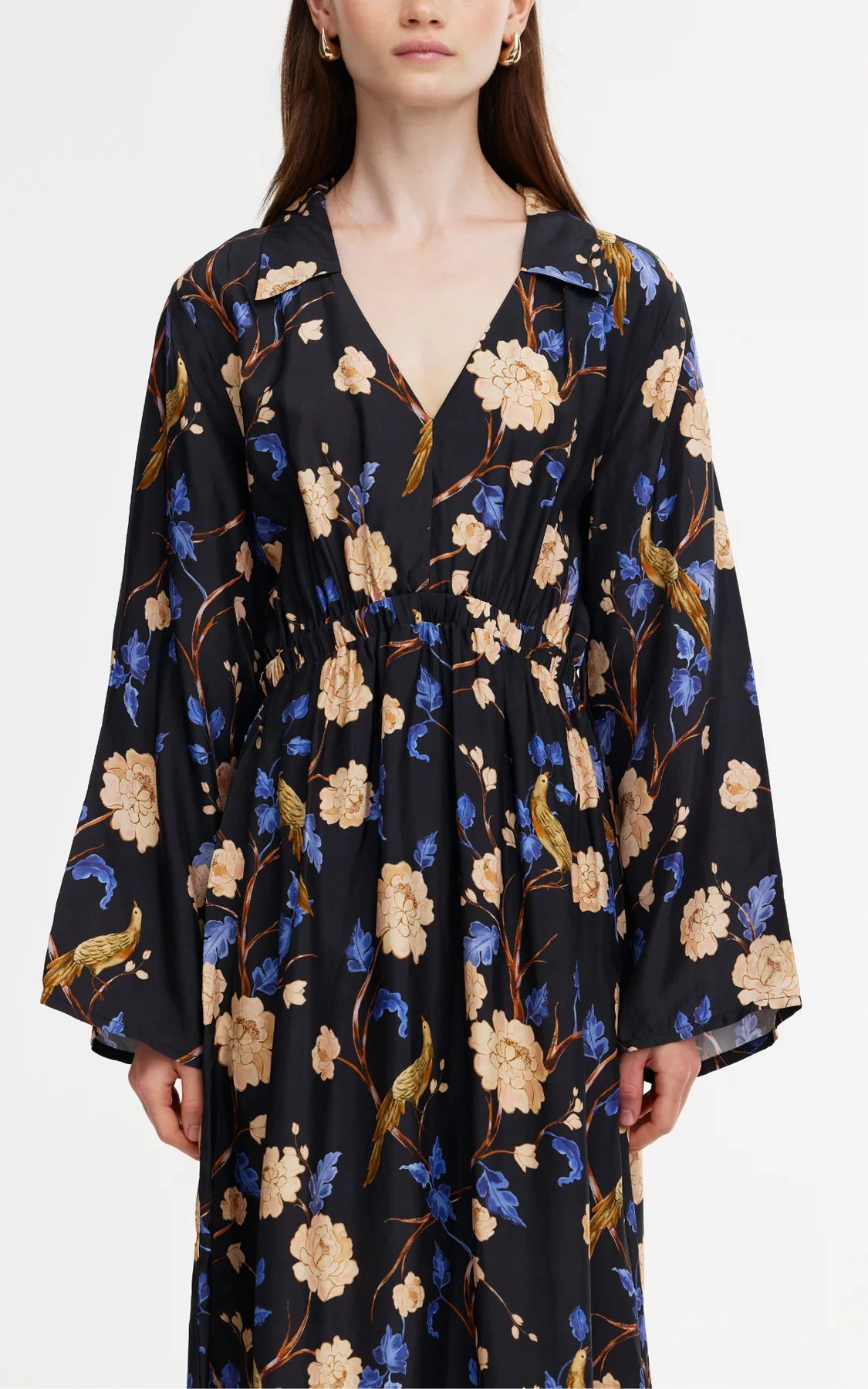 Be transported to a 70's garden paradise with the Kinney Stevie Dress. The v-neckline and one-piece collar add stylish retro flair while the waist elastic provides a flattering silhouette. Made from silky-smooth viscose satin, the exclusive Night Garden print will make you stand out in any event.