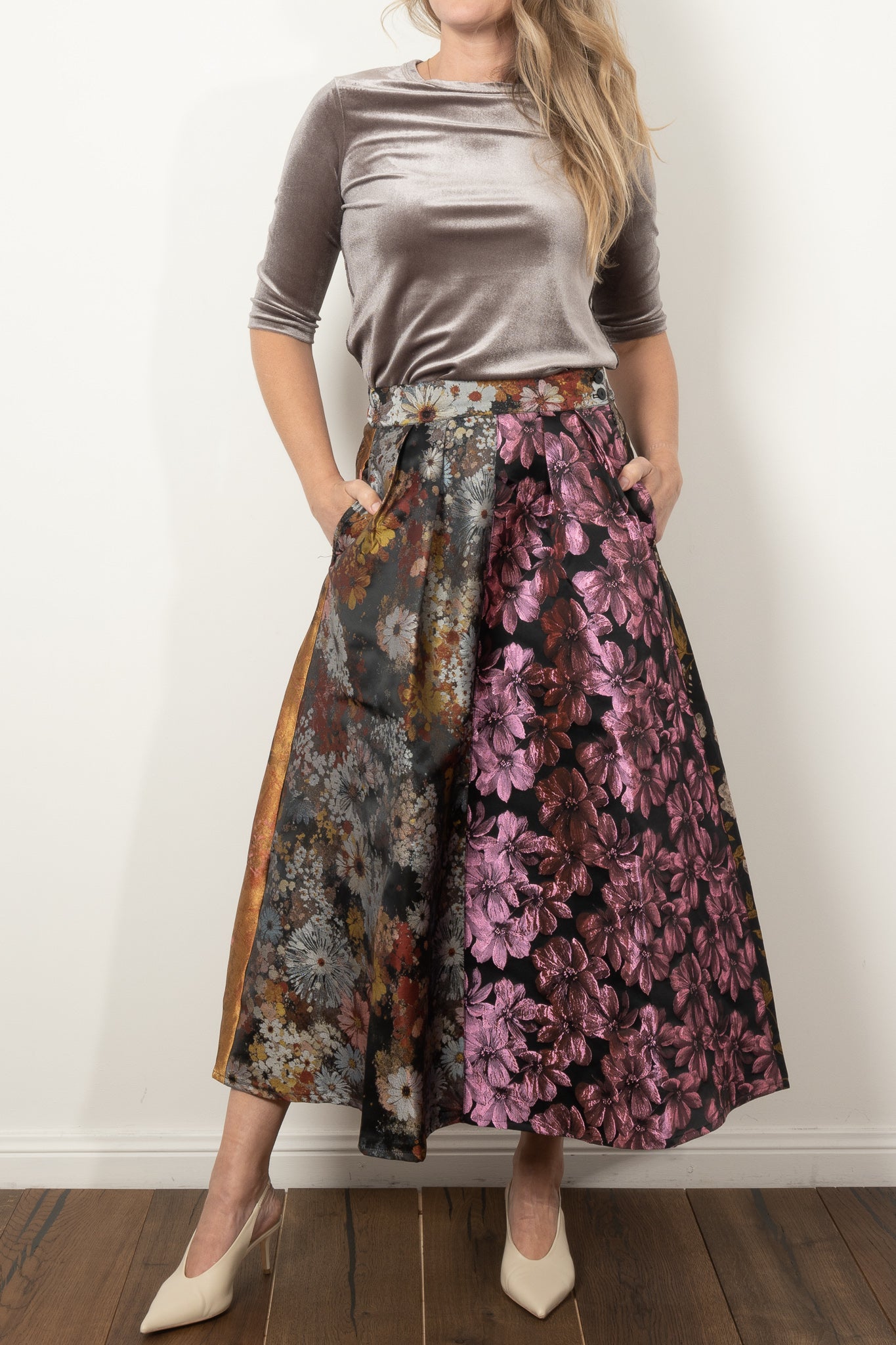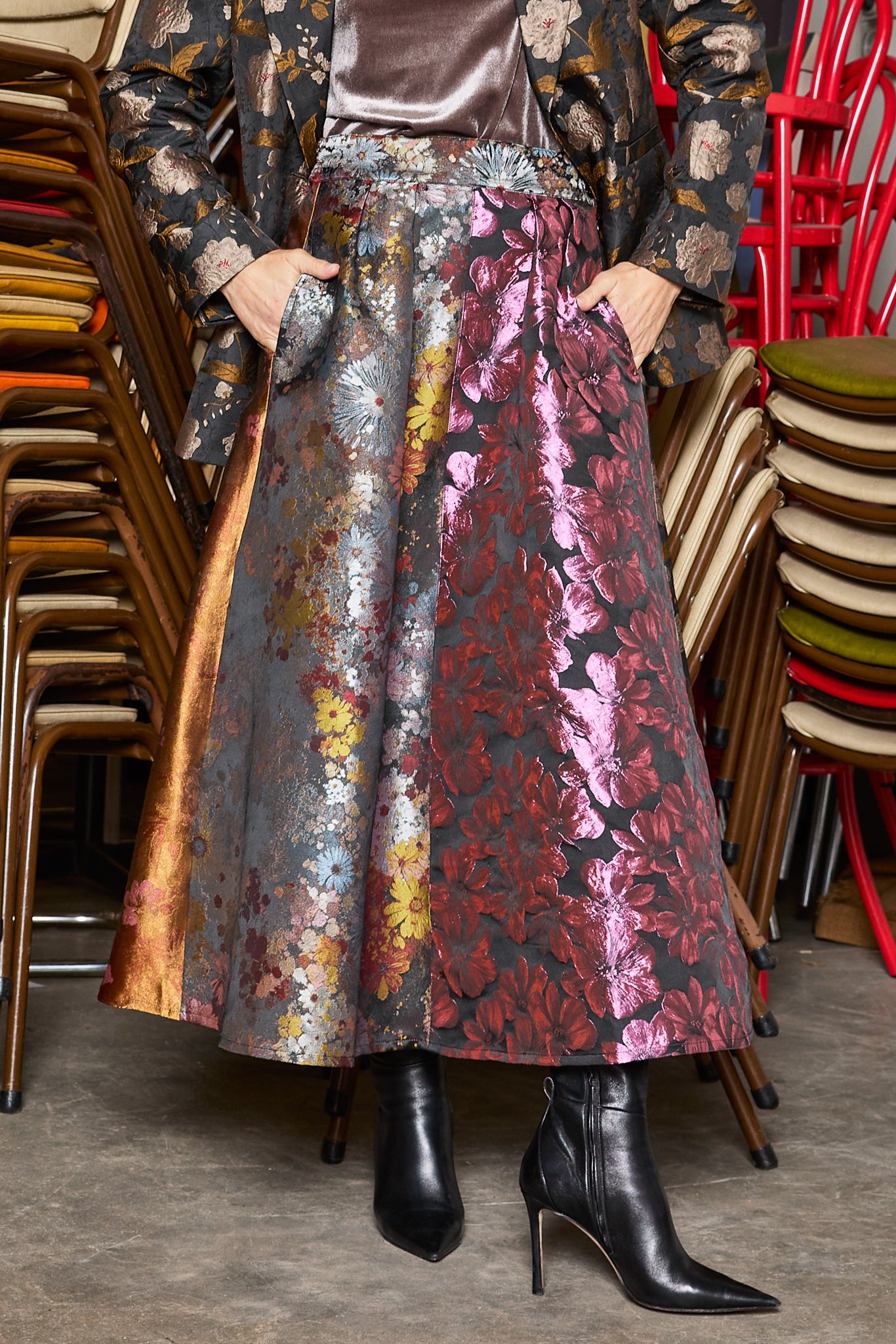 The Parted Skirt by M.A. Dainty is a standout piece that blends structure with movement and rich detail. Crafted from eye-catching brocade in a patchwork of floral prints and warm metallics, this full A-line skirt brings the drama while remaining easy to wear. It features an elastic panel at the back for comfort, a fixed waistband at the front for a flattering shape, and a discreet side zip closure. Pair it with a simple knit or the matching blazer for a bold, fashion-forward look.