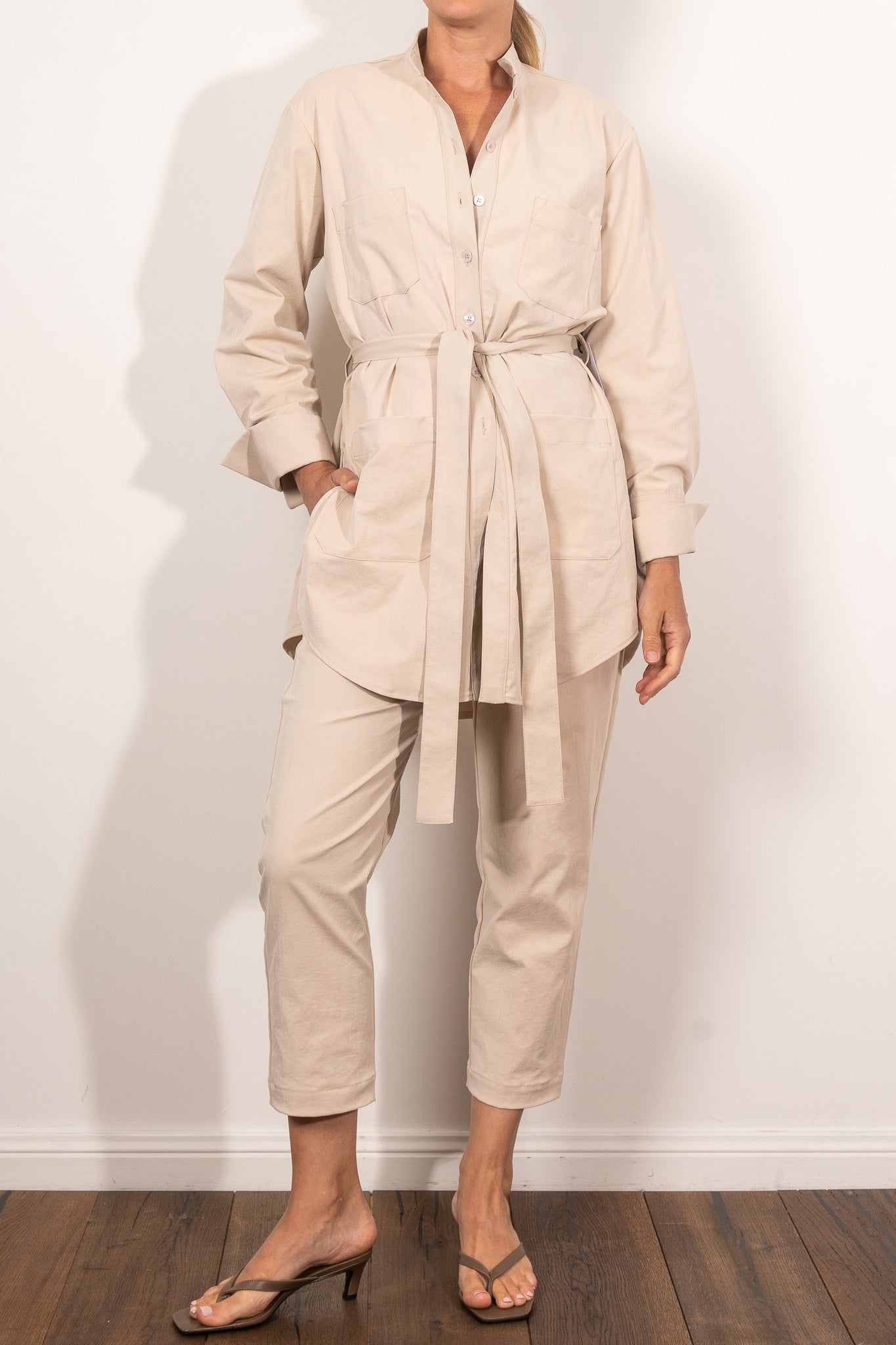 Utility meets polish in the Safari Jacket, crafted from Mela Purdie’s innovative Gravitene — a compressed Memory Stretch Micro Twill that offers subtle structure with a soft cotton-like feel. Designed for effortless layering, this modern take on the classic utility jacket features a petite stand collar, full-length sleeves, and four functional patch pockets. A curved hemline and waist tie lend a flattering shape to the relaxed silhouette.