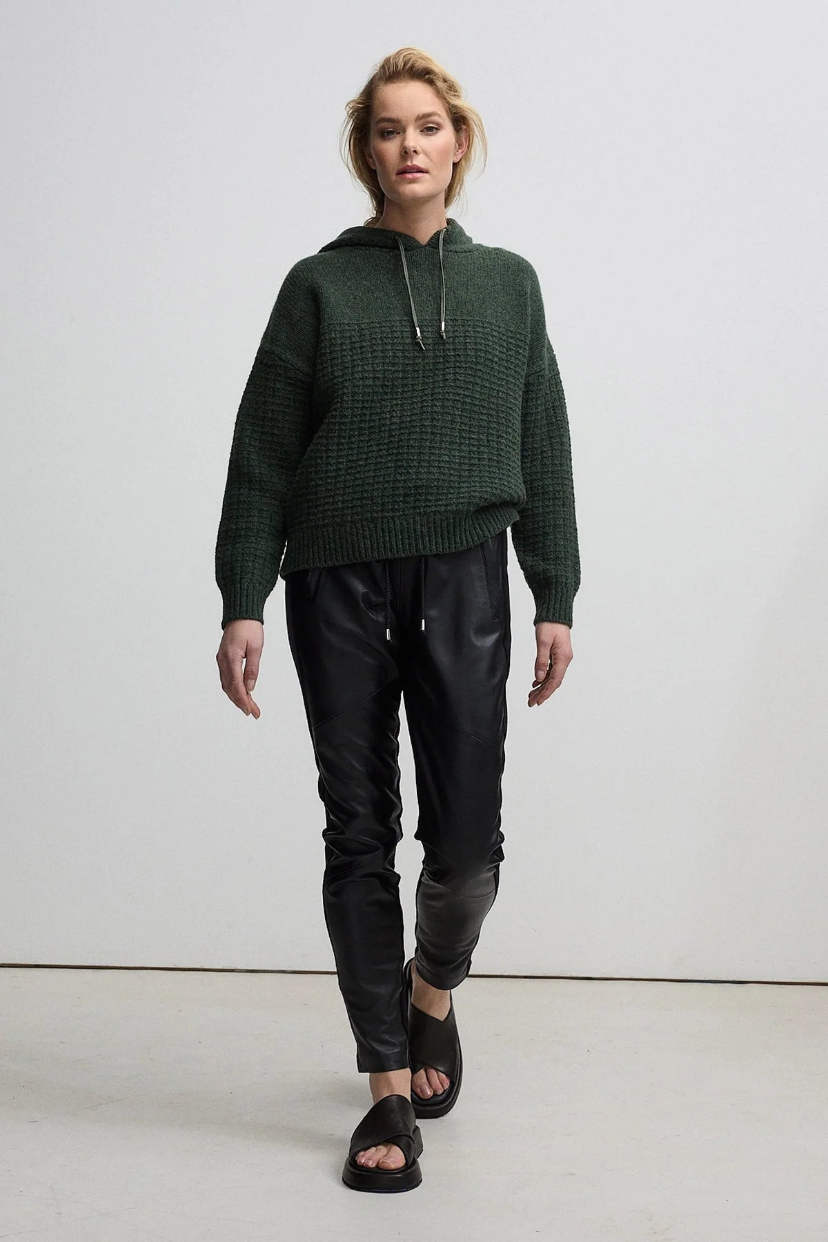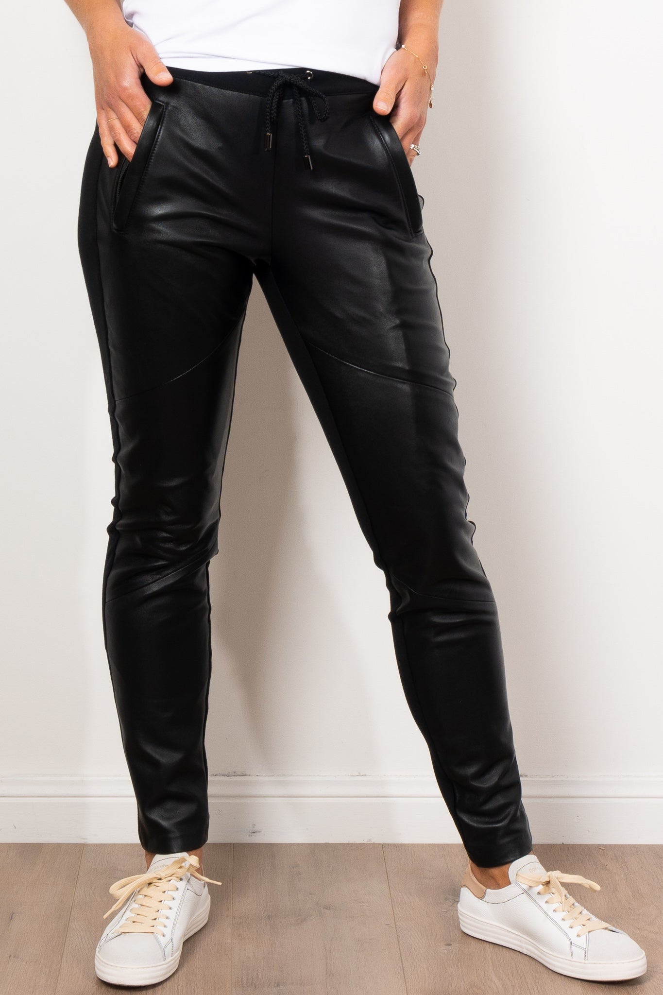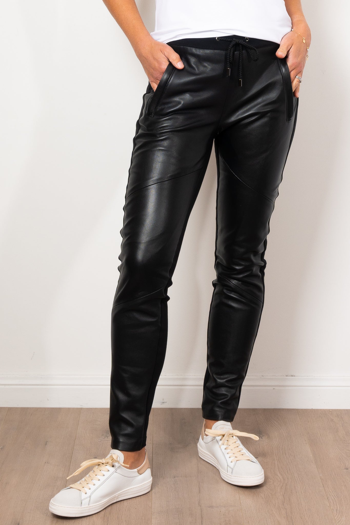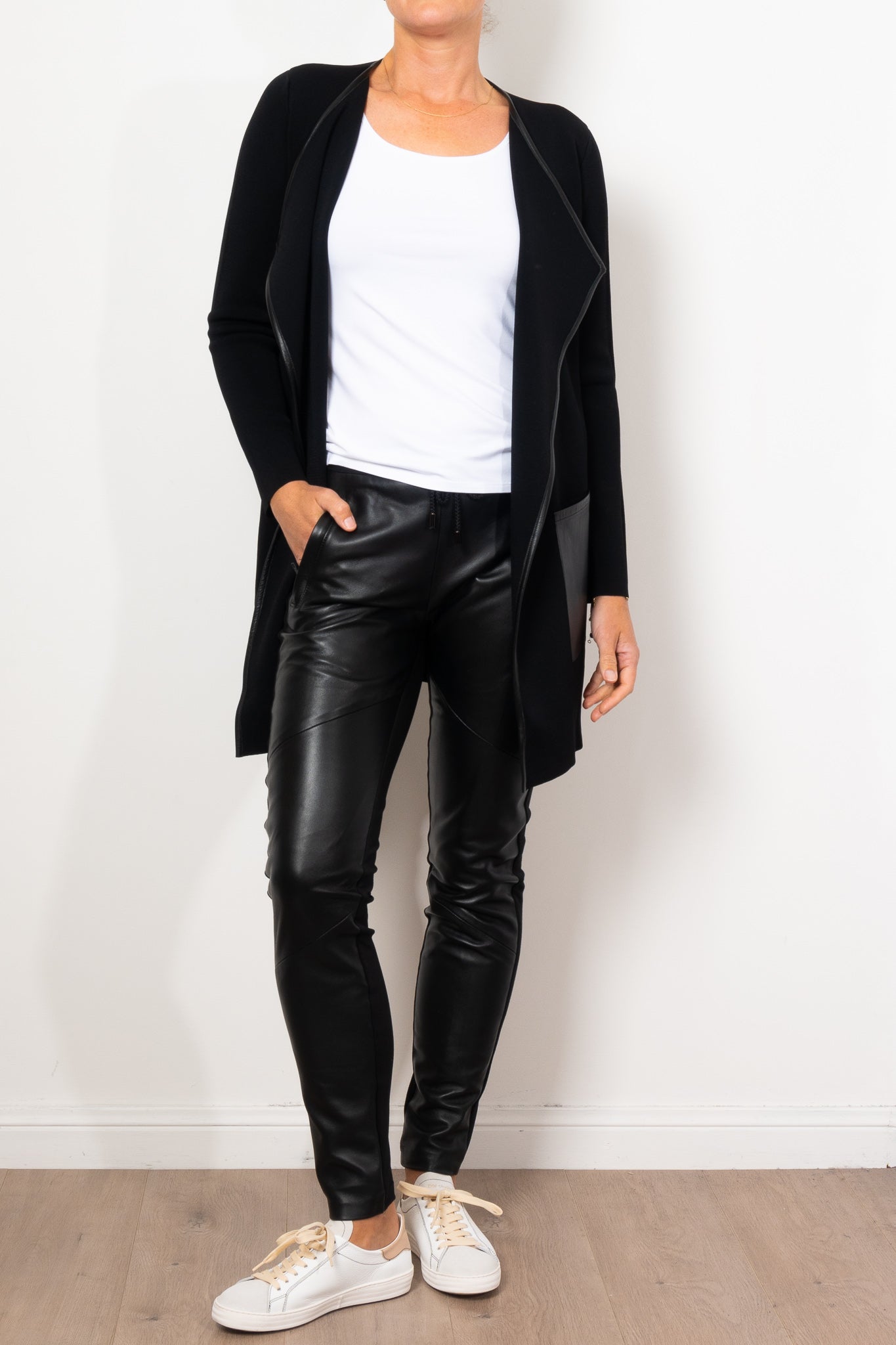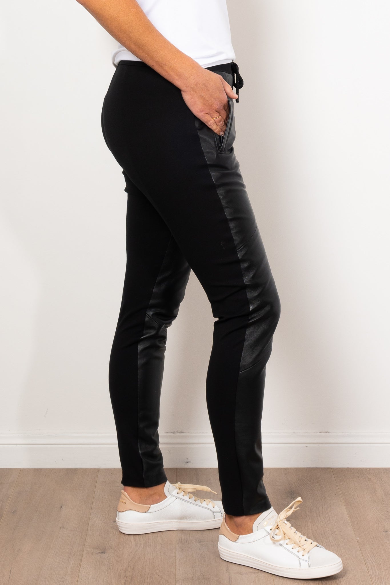 Italian genuine leather and stretch knit Ponte spliced jogger pant, with a comfortable hip-to-high rise, can be worn lower to create more of a harem pant look, or higher to look more like a straight pant appearance. The waistband is carefully positioned and made of a matching Italian stretch knitted Ponte fabric, as is the back panels - created carefully for extra comfort and movement when wearing. The front has impeccably positioned black matte zip hardware on the pocket closures and tailored with angled panelling across the soft Italian lambskin.