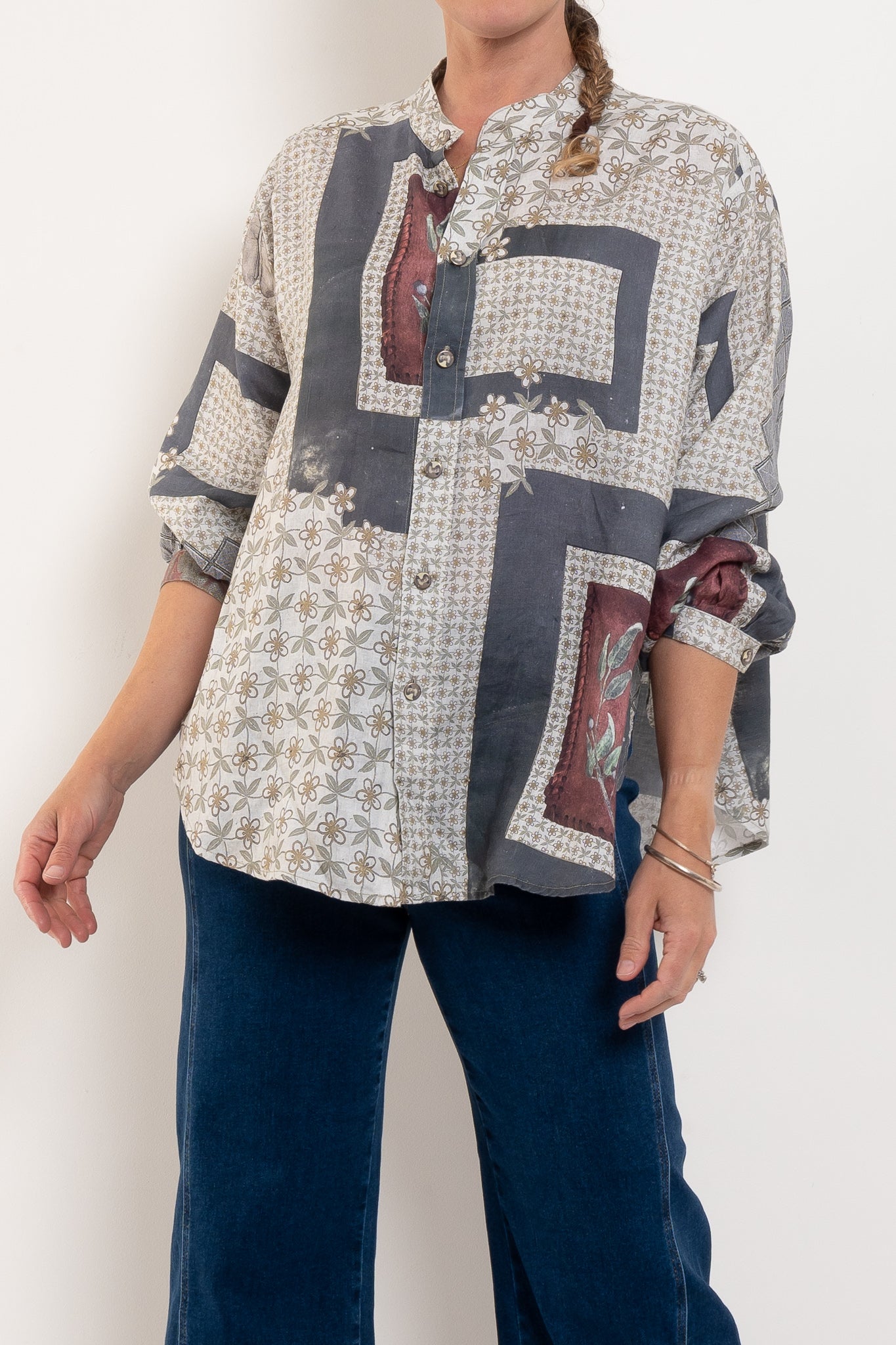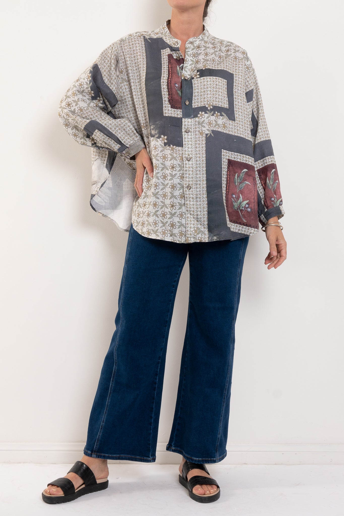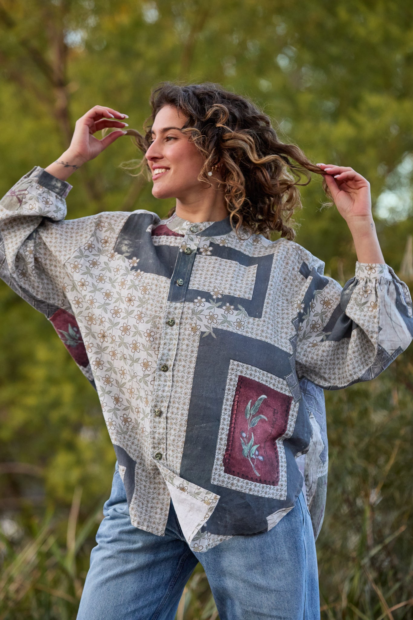 The Circular by Maud Alice Dainty Potter Shirt combines oversized comfort with artistic flair through its patchwork-inspired print in soft earthy tones. See full product description below for fabric and fit info.