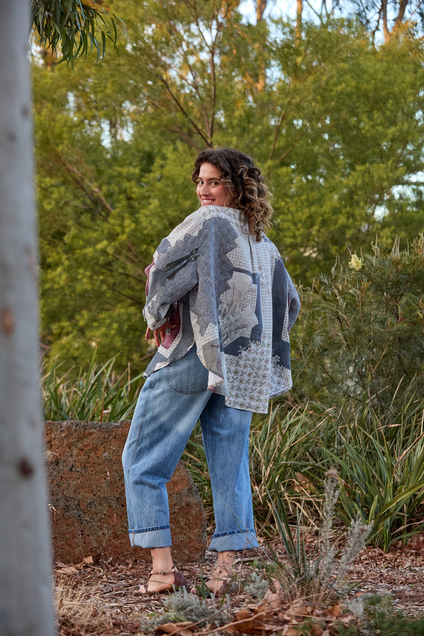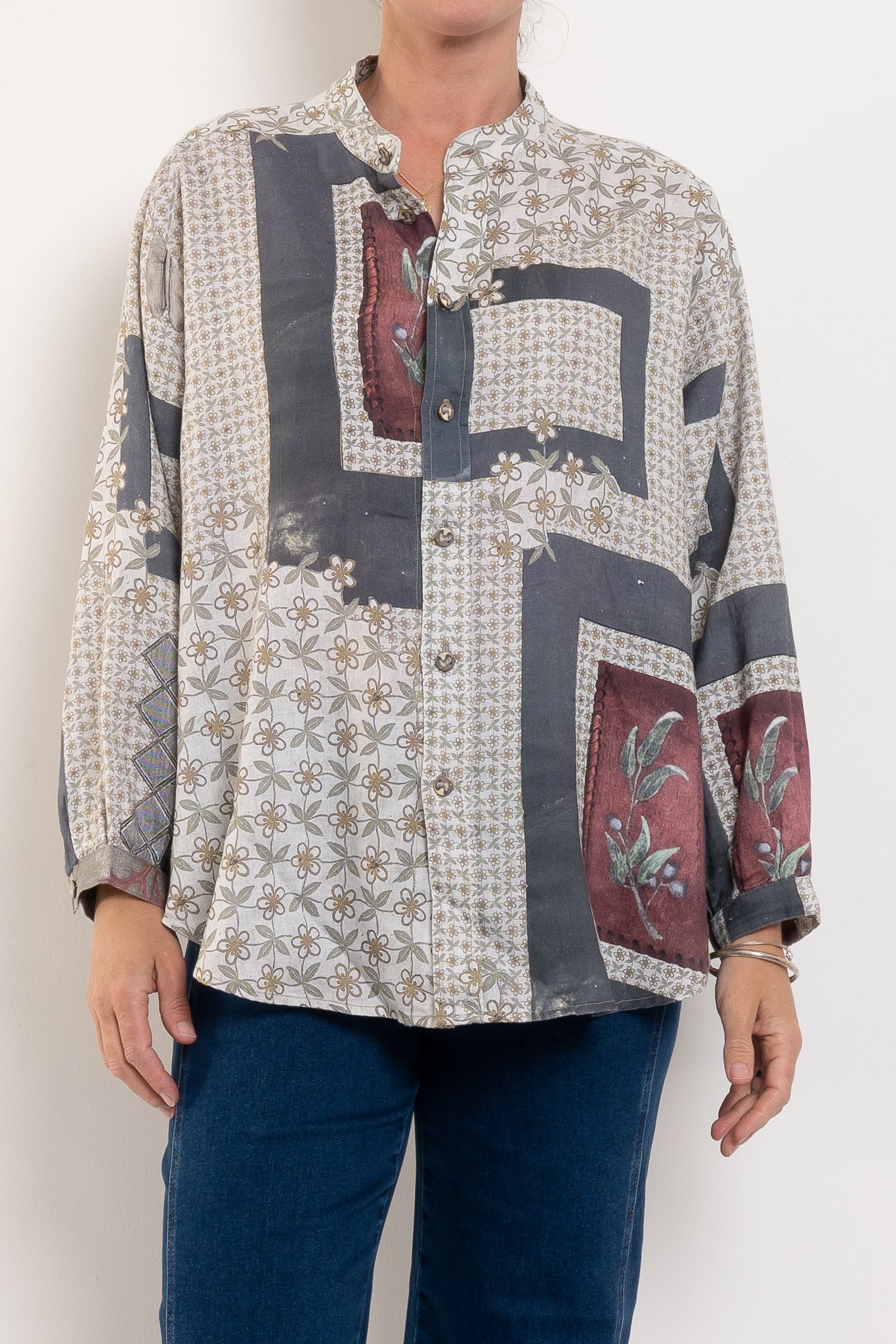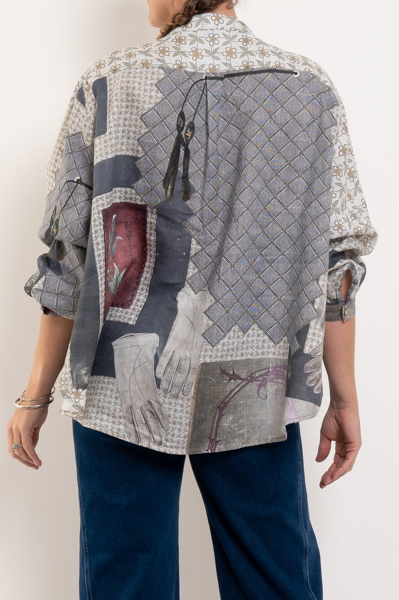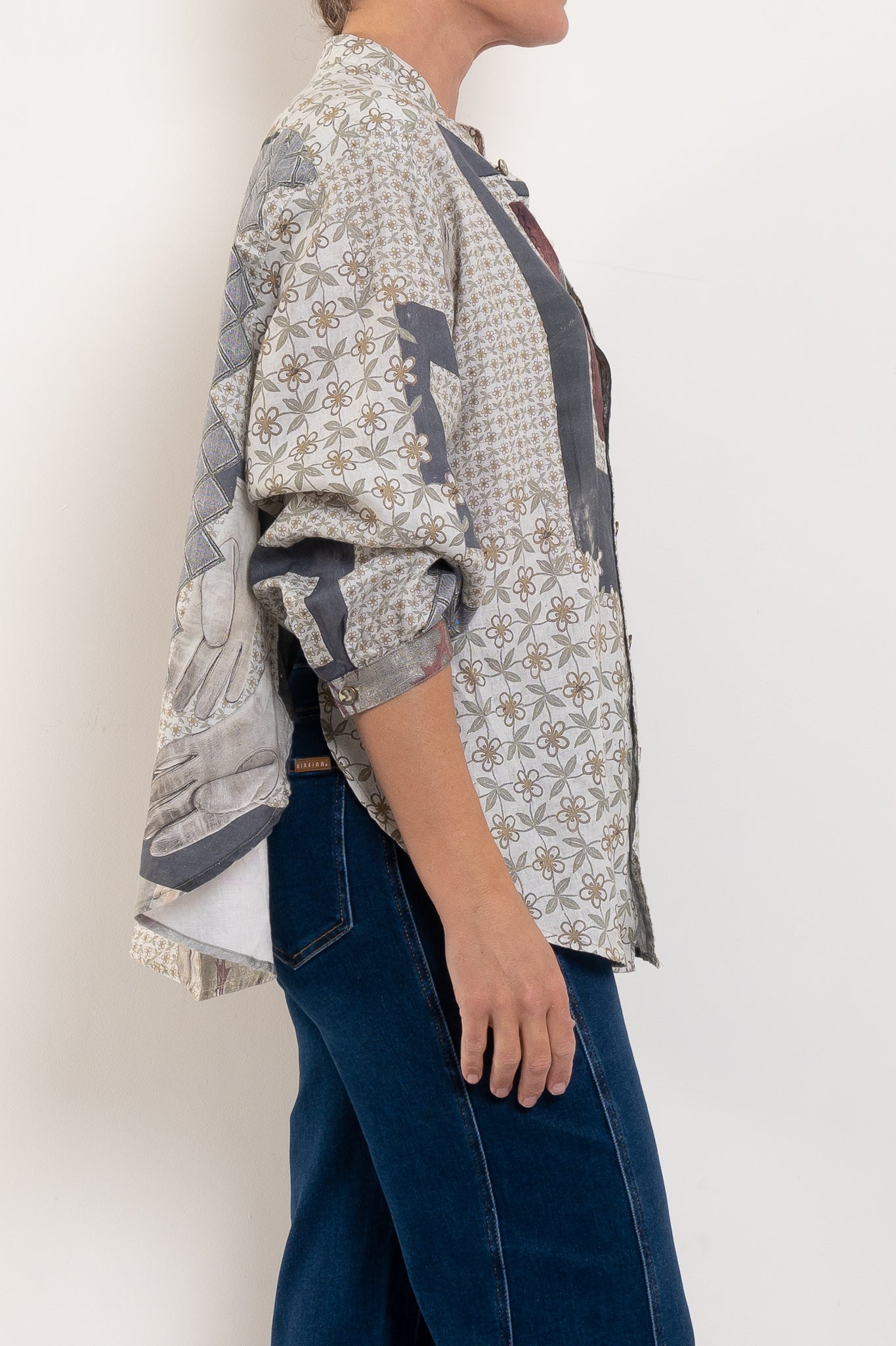 The Circular by Maud Alice Dainty Potter Shirt combines oversized comfort with artistic flair through its patchwork-inspired print in soft earthy tones. See full product description below for fabric and fit info.