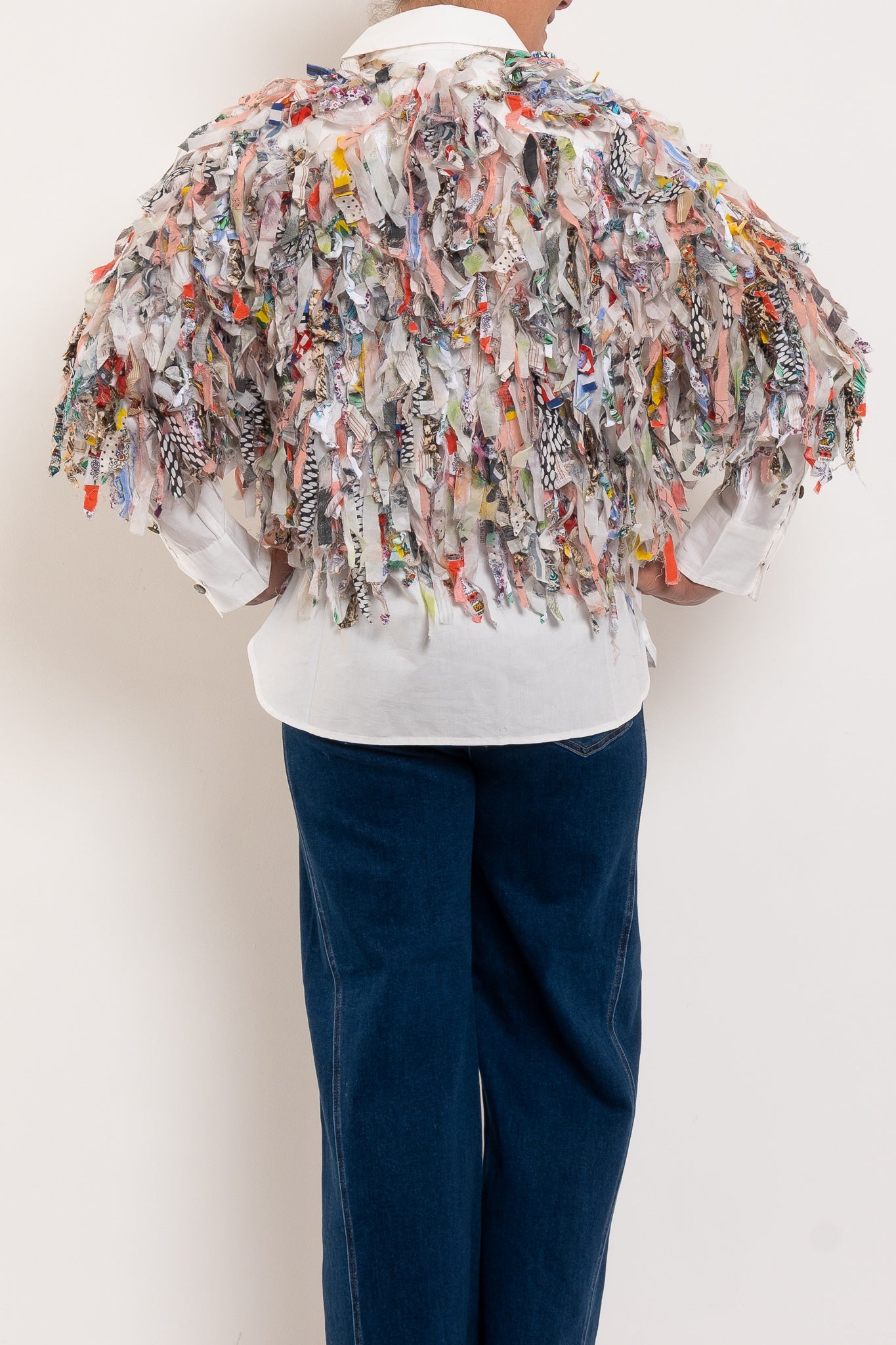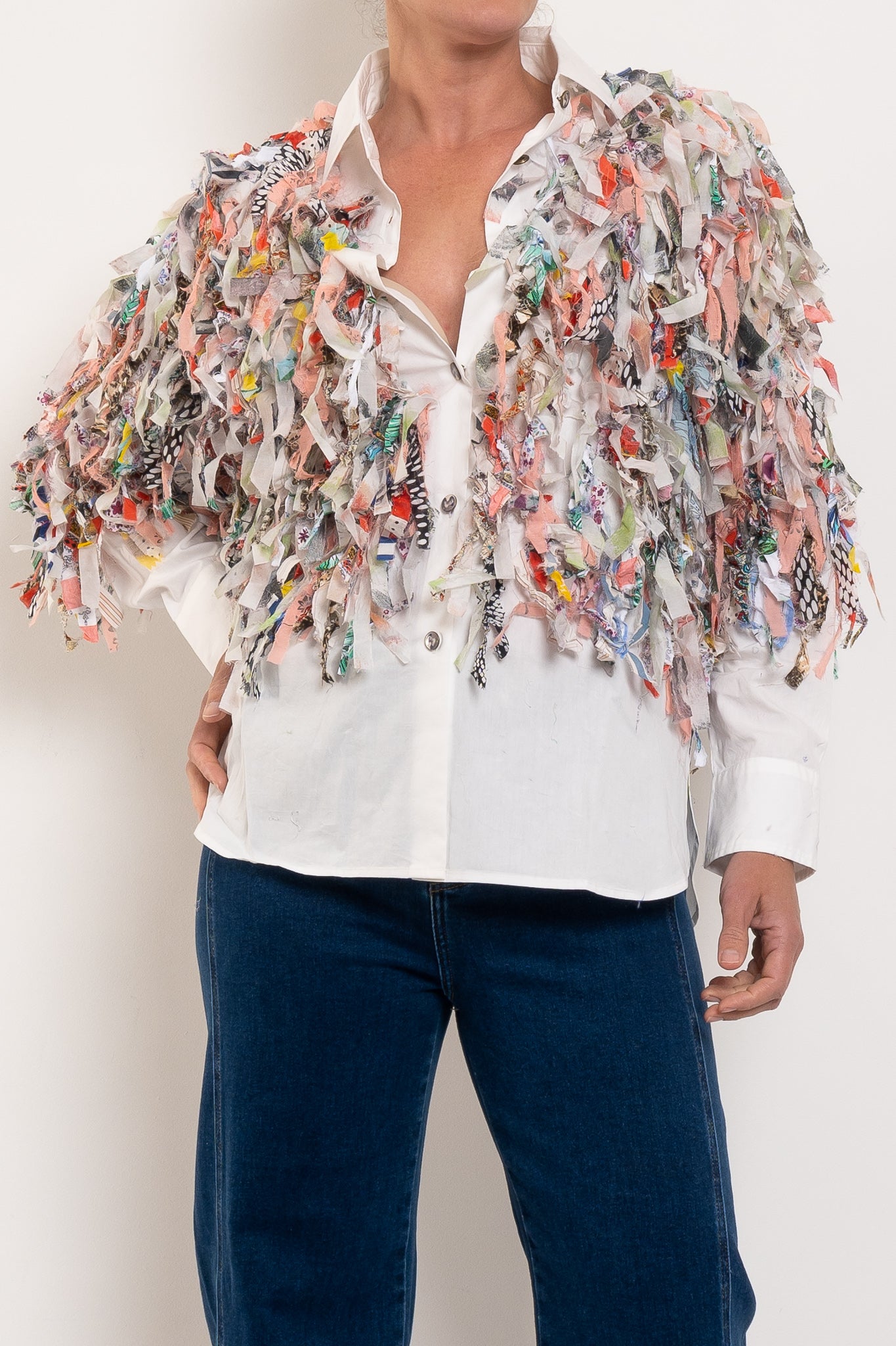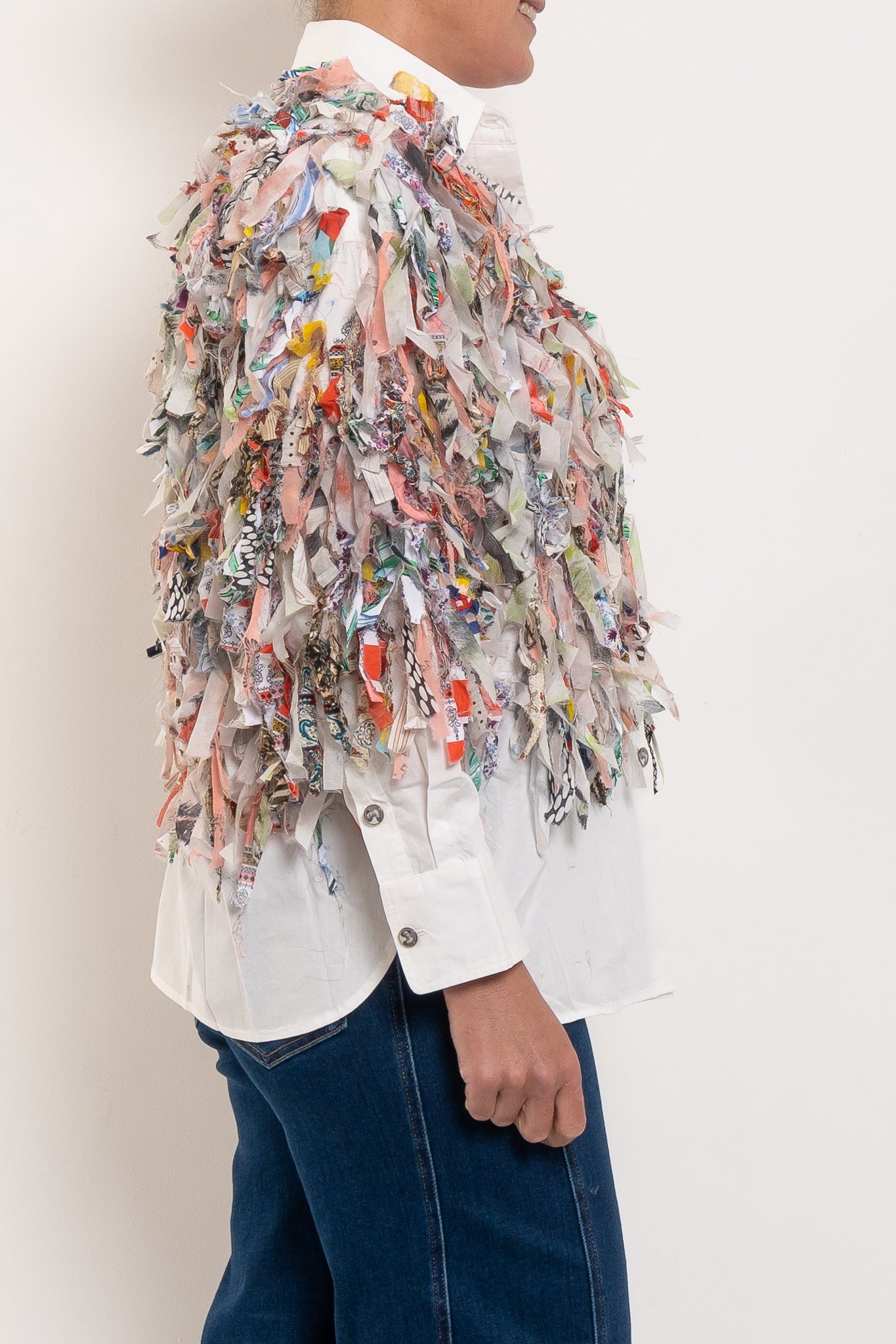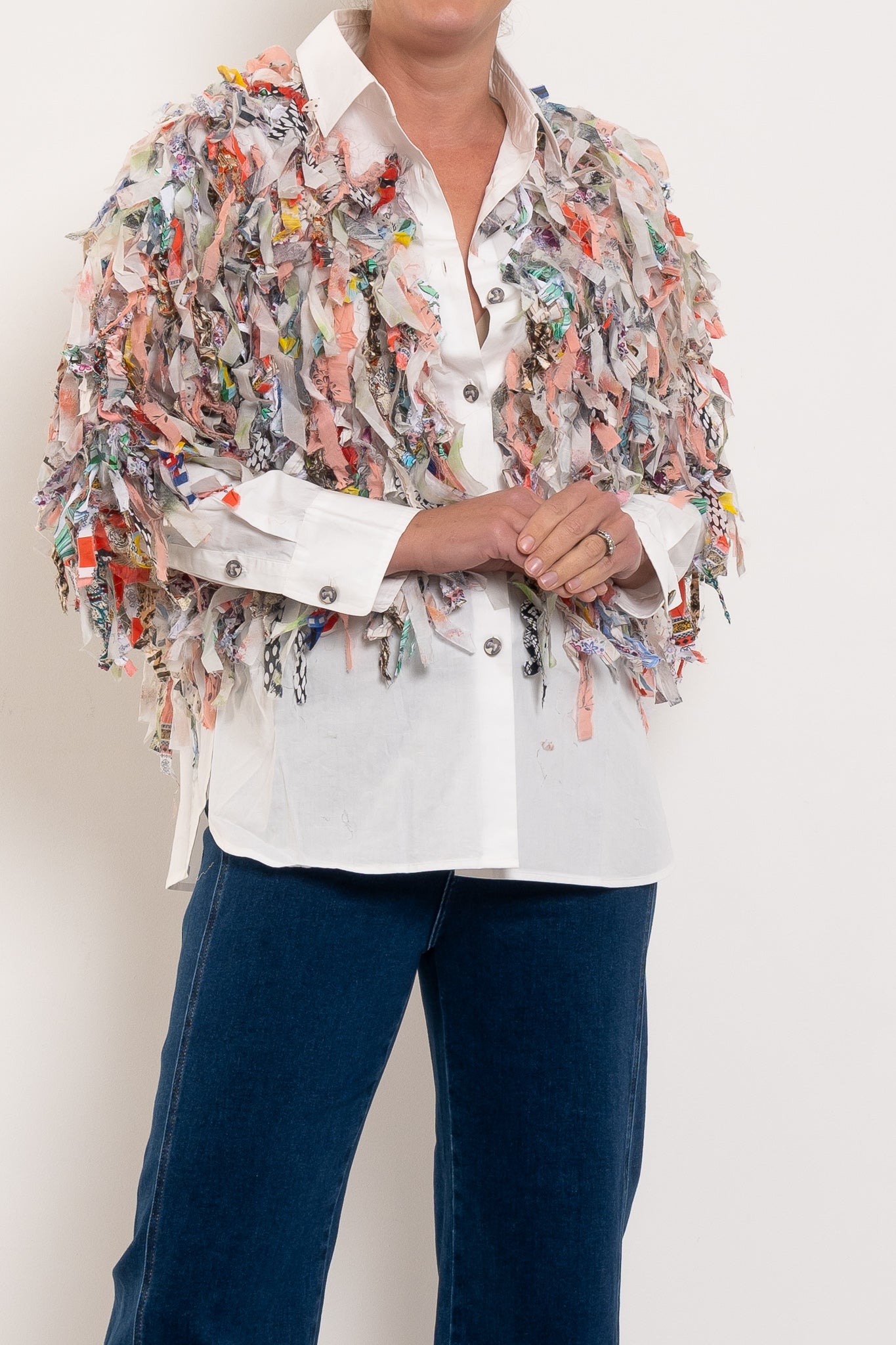 A true labour of love, the Shaggy Shirt from Circular by Maud Alice Dainty turns textile waste into wearable art. Each piece takes two full days to create, with hundreds of fabric offcuts from past collections sewn individually onto a crisp white cotton shirt base. The result is a one-of-a-kind piece brimming with colour, texture, and personality. Every raw-edged trim tells a story of mindful making—designed to naturally fray and soften with time, giving your shirt even more character as it’s worn.