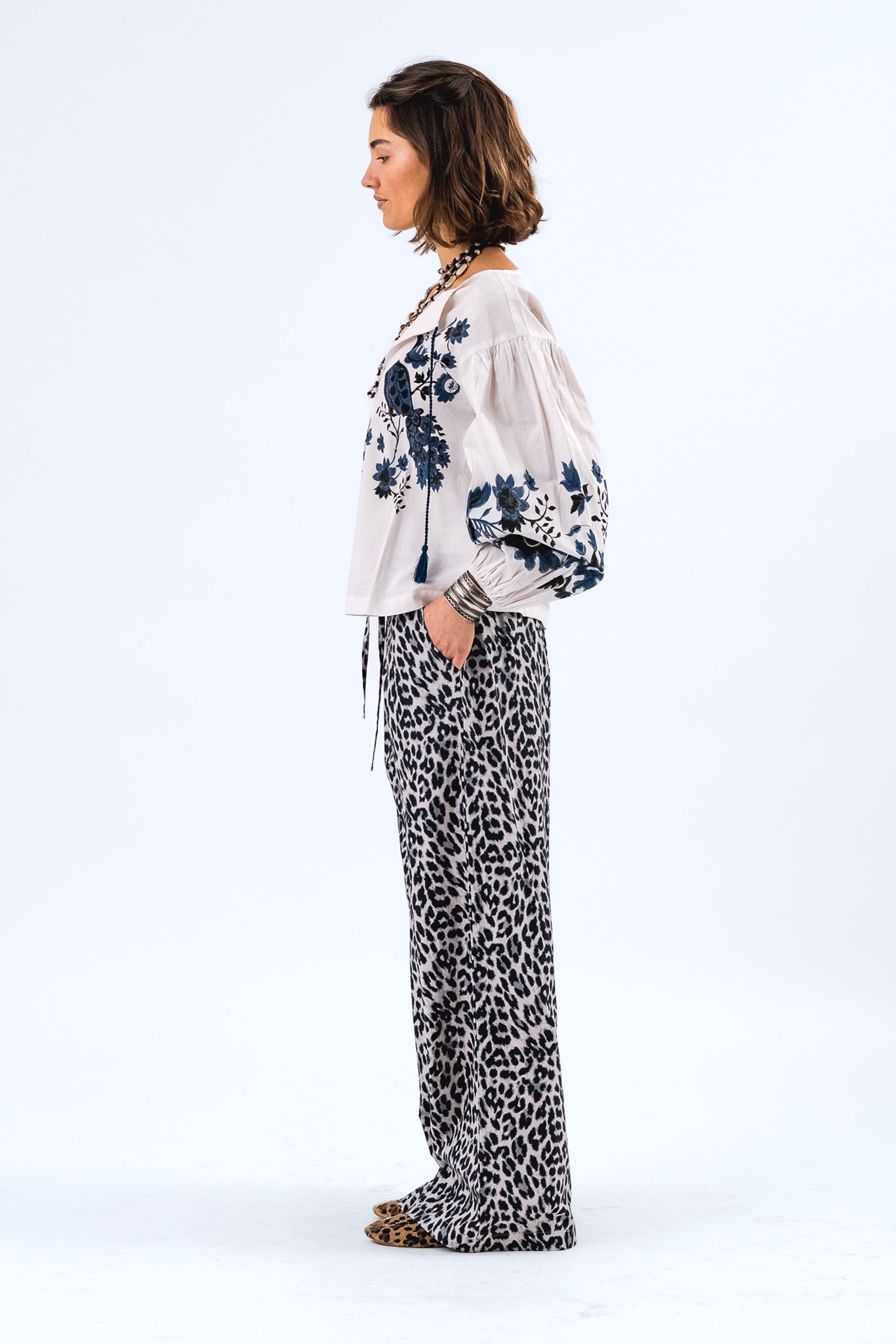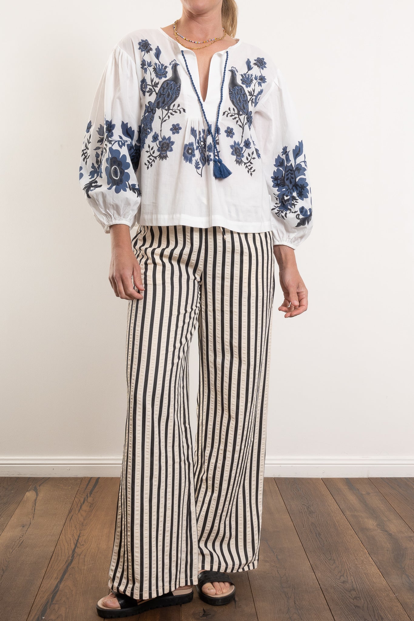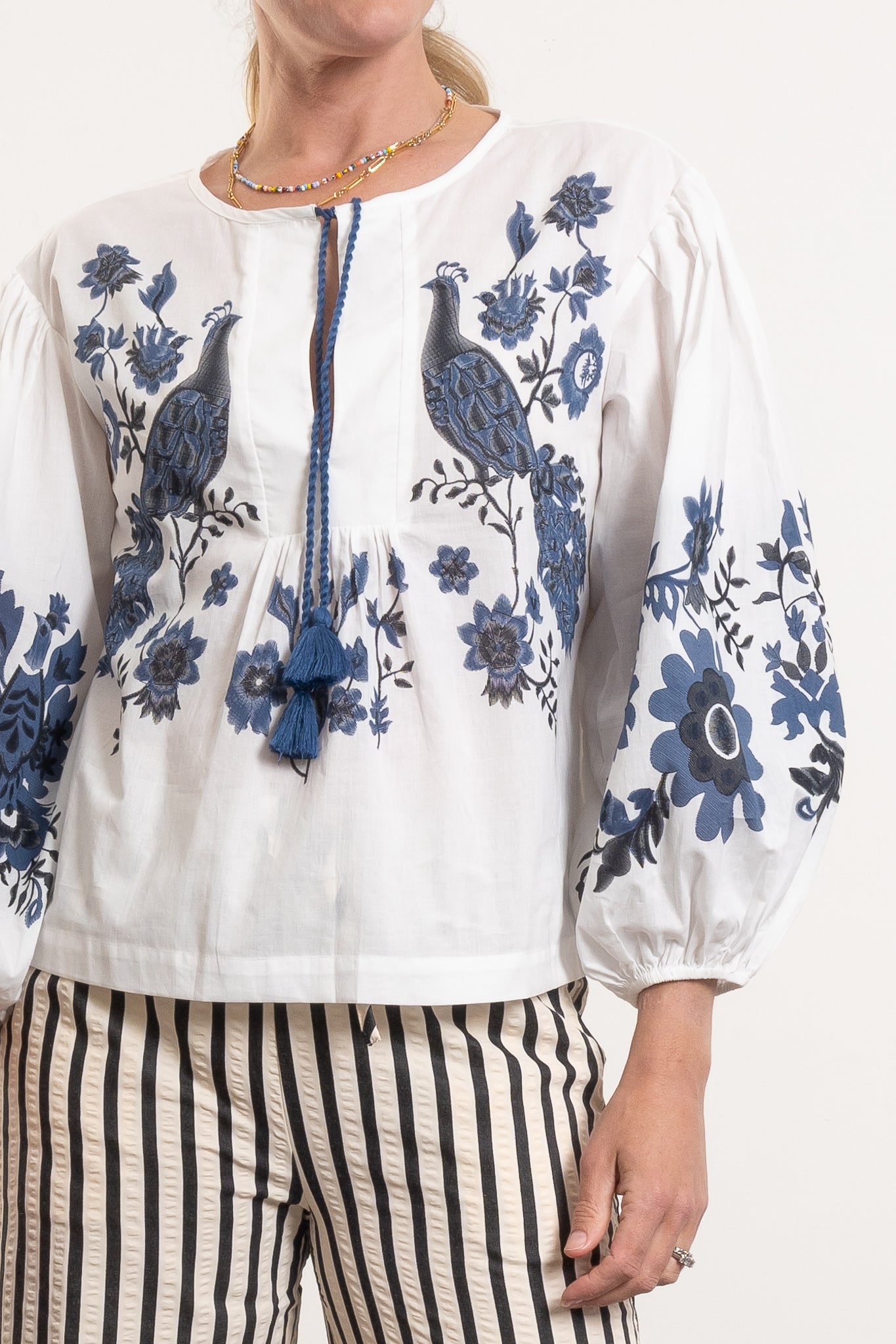 The Askar Blouse blends bohemian charm with bold, artistic embroidery. Crafted from lightweight cotton, this relaxed peasant-style top features voluminous sleeves and intricate navy embroidery with twin peacocks at the chest—a true statement piece with folk-luxe appeal. The neckline is finished with a soft V-split and tasseled ties for a touch of movement.
