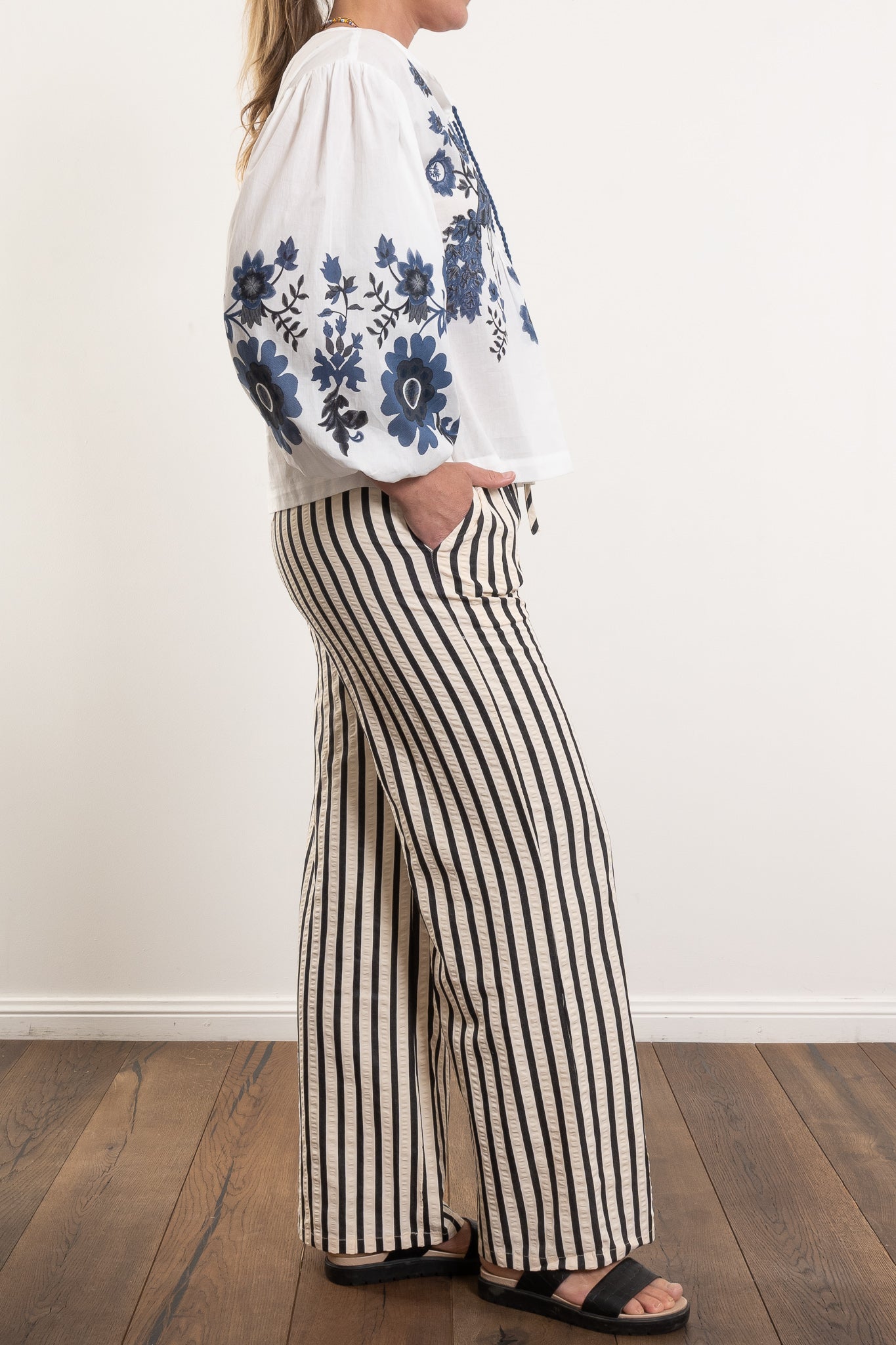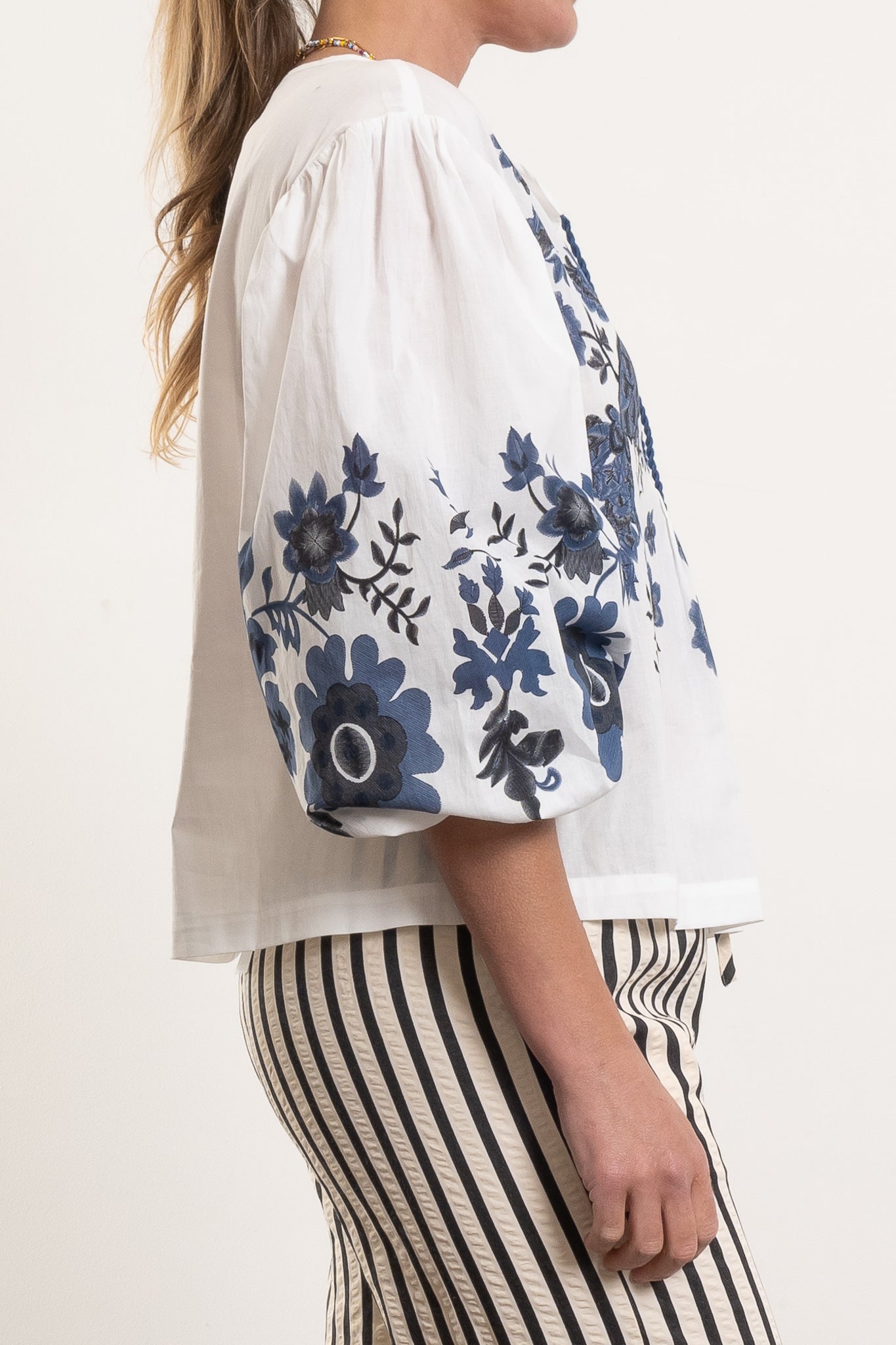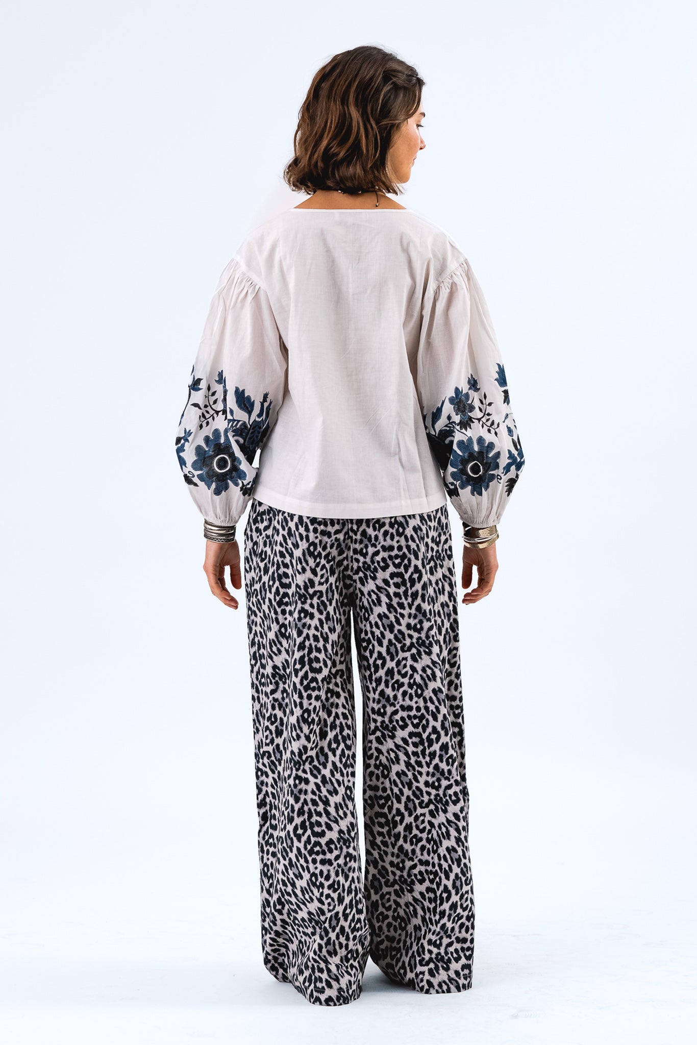 The Askar Blouse blends bohemian charm with bold, artistic embroidery. Crafted from lightweight cotton, this relaxed peasant-style top features voluminous sleeves and intricate navy embroidery with twin peacocks at the chest—a true statement piece with folk-luxe appeal. The neckline is finished with a soft V-split and tasseled ties for a touch of movement.