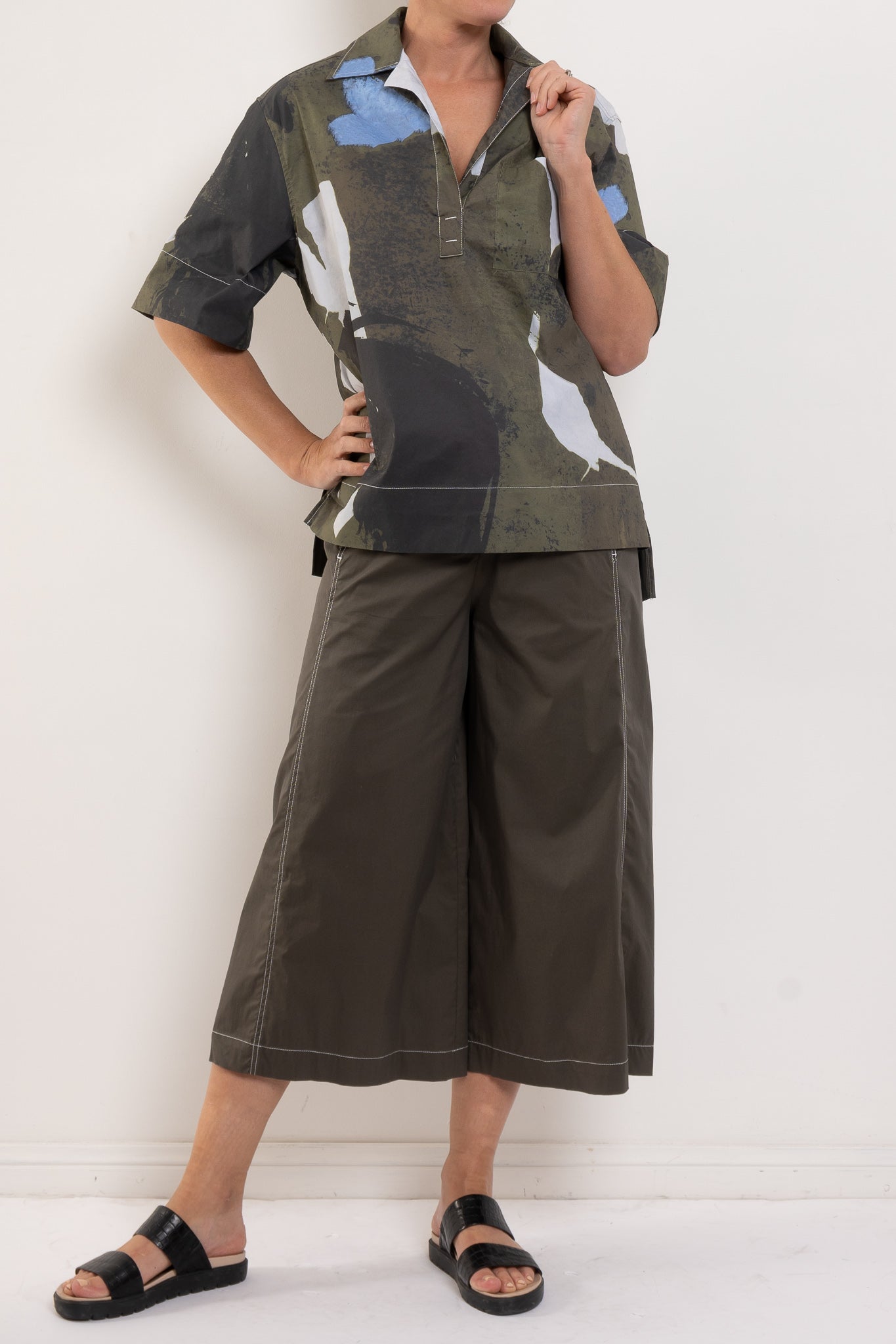 Designed with a classic collar, elbow-length wide sleeves, and contrast topstitch detailing, this shirt delivers contemporary refinement. Falling over the hips with side splits at the hem, it offers freedom of movement and effortless layering potential.