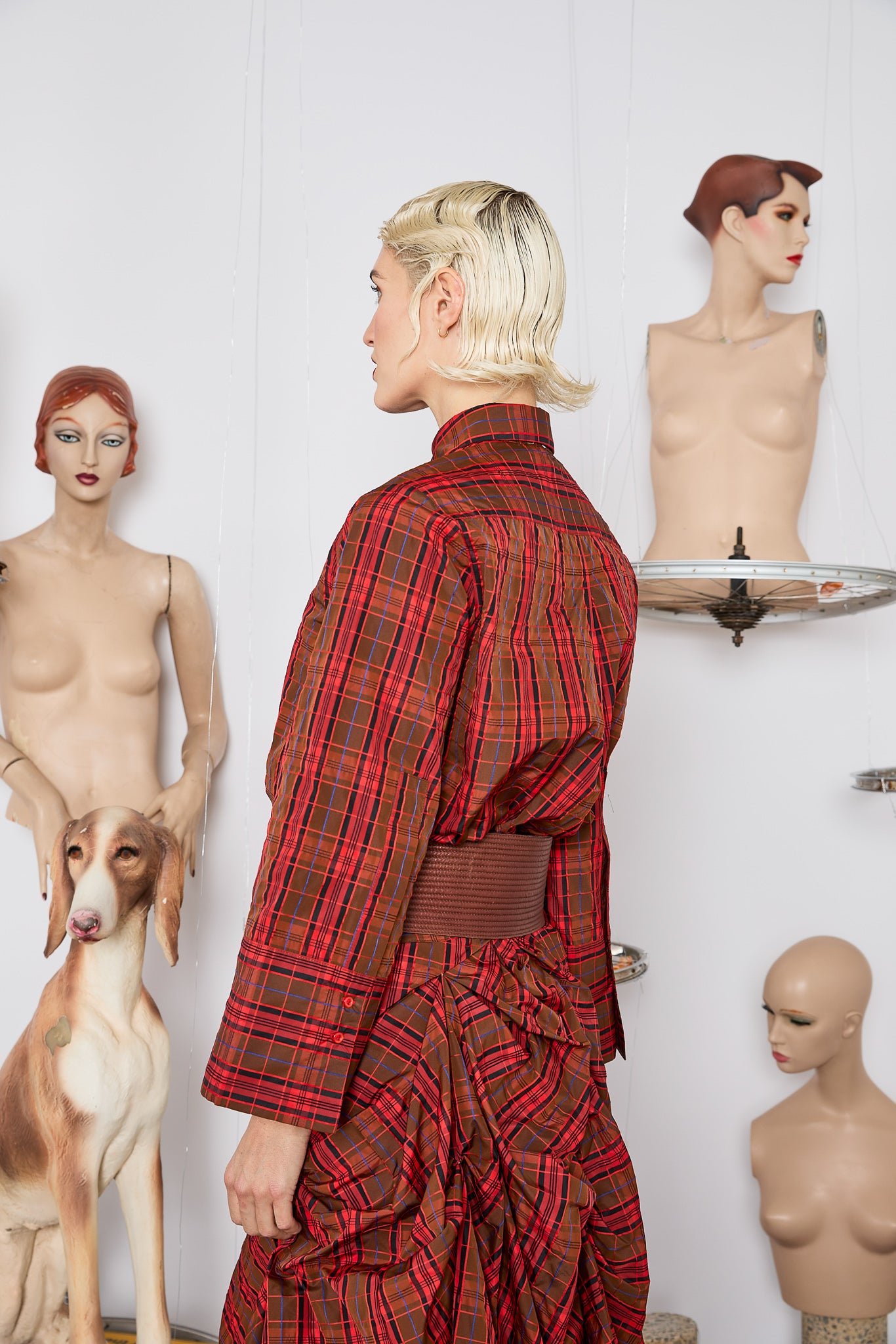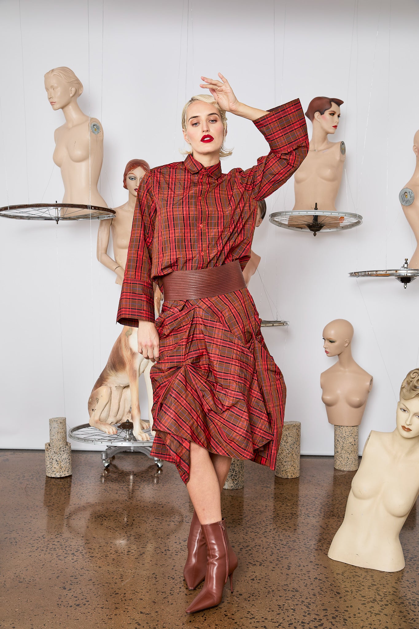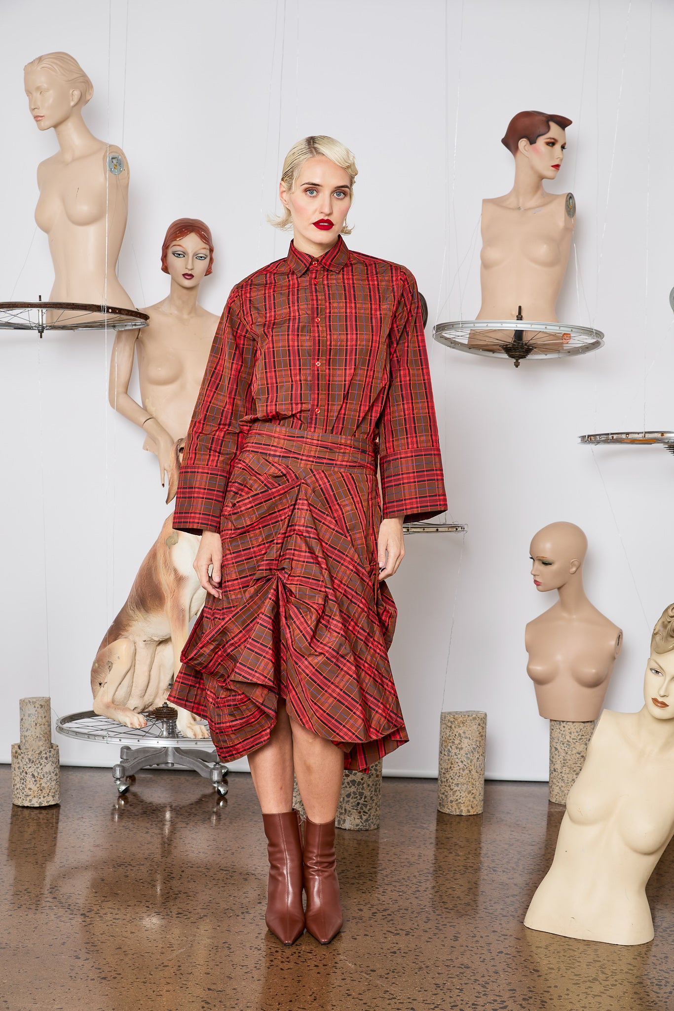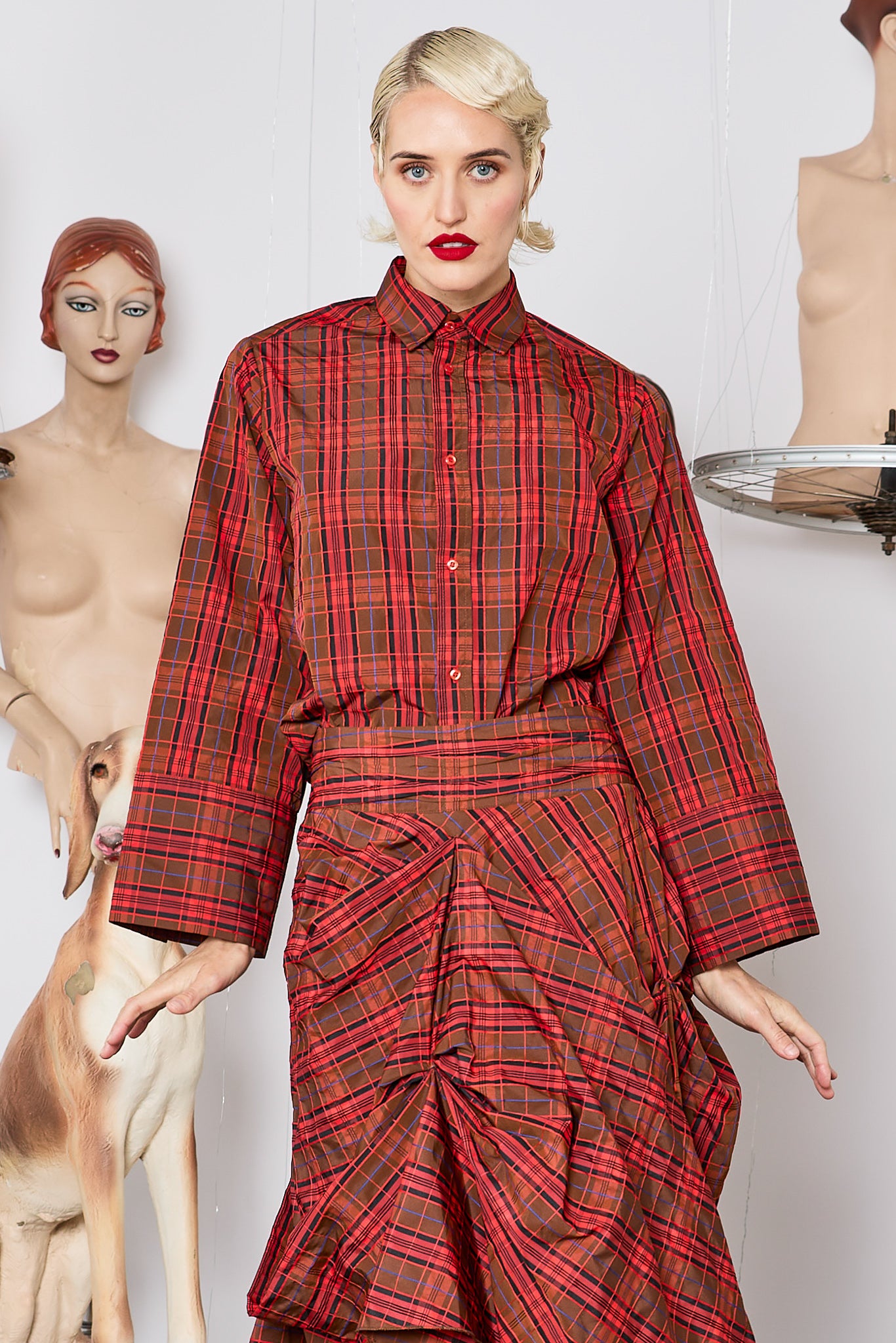 The Para Shirt by M.A. Dainty delivers statement shirting with a twist. Cut in a structured, lightweight fabrication, this button-down features an exaggerated cuff, classic collar and boxy fit through the body. The rich red check pattern nods to heritage tartan, reimagined with a modern edge. Style it tucked into the matching skirt for a standout set, or pair with denim to dial it down.