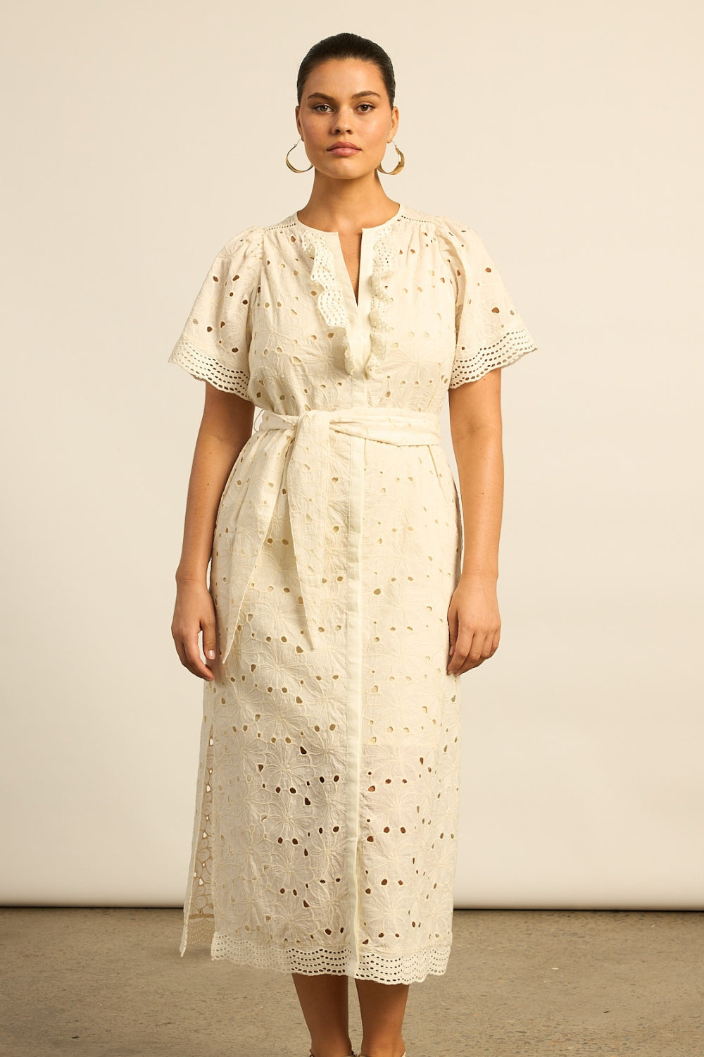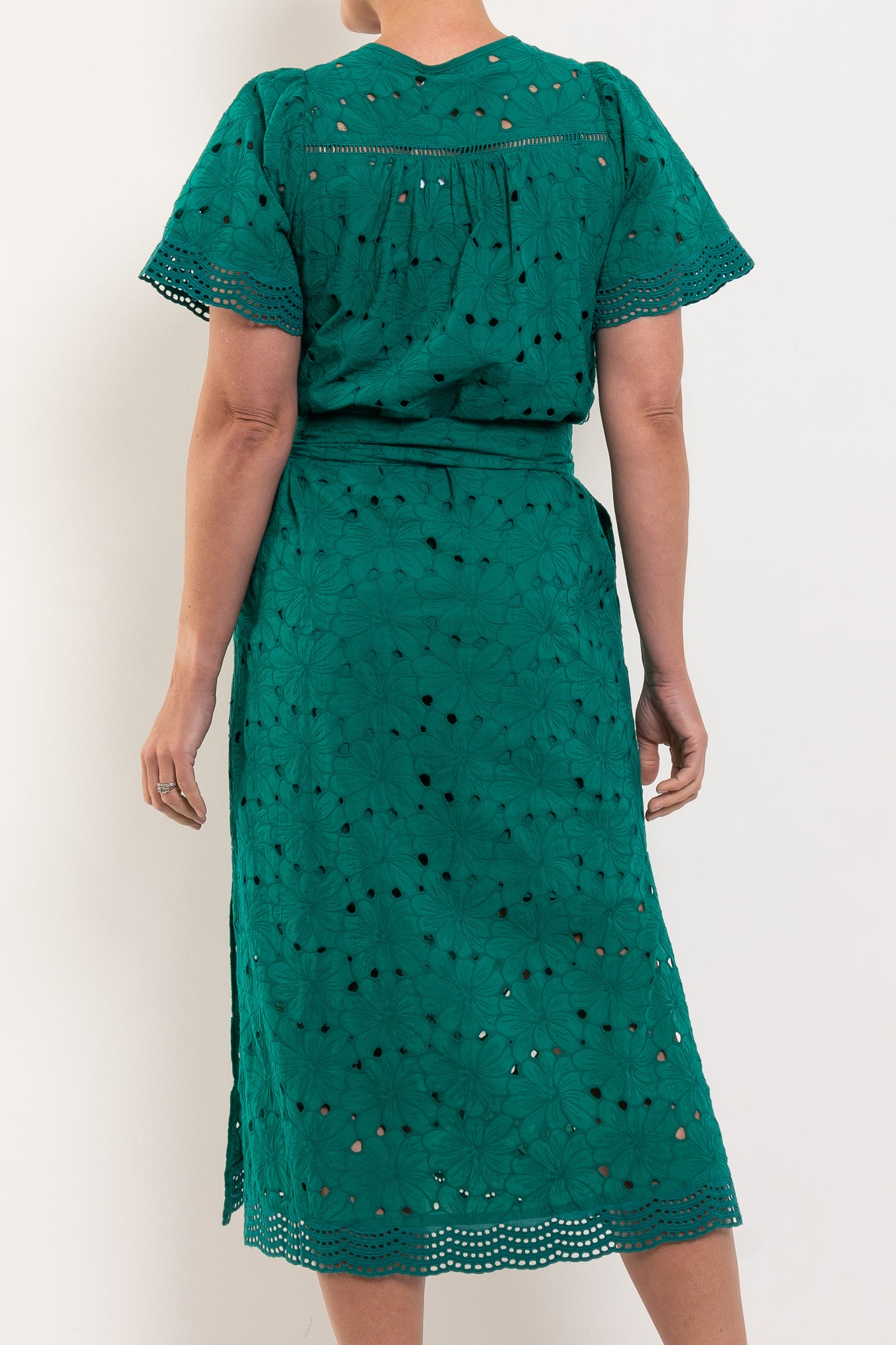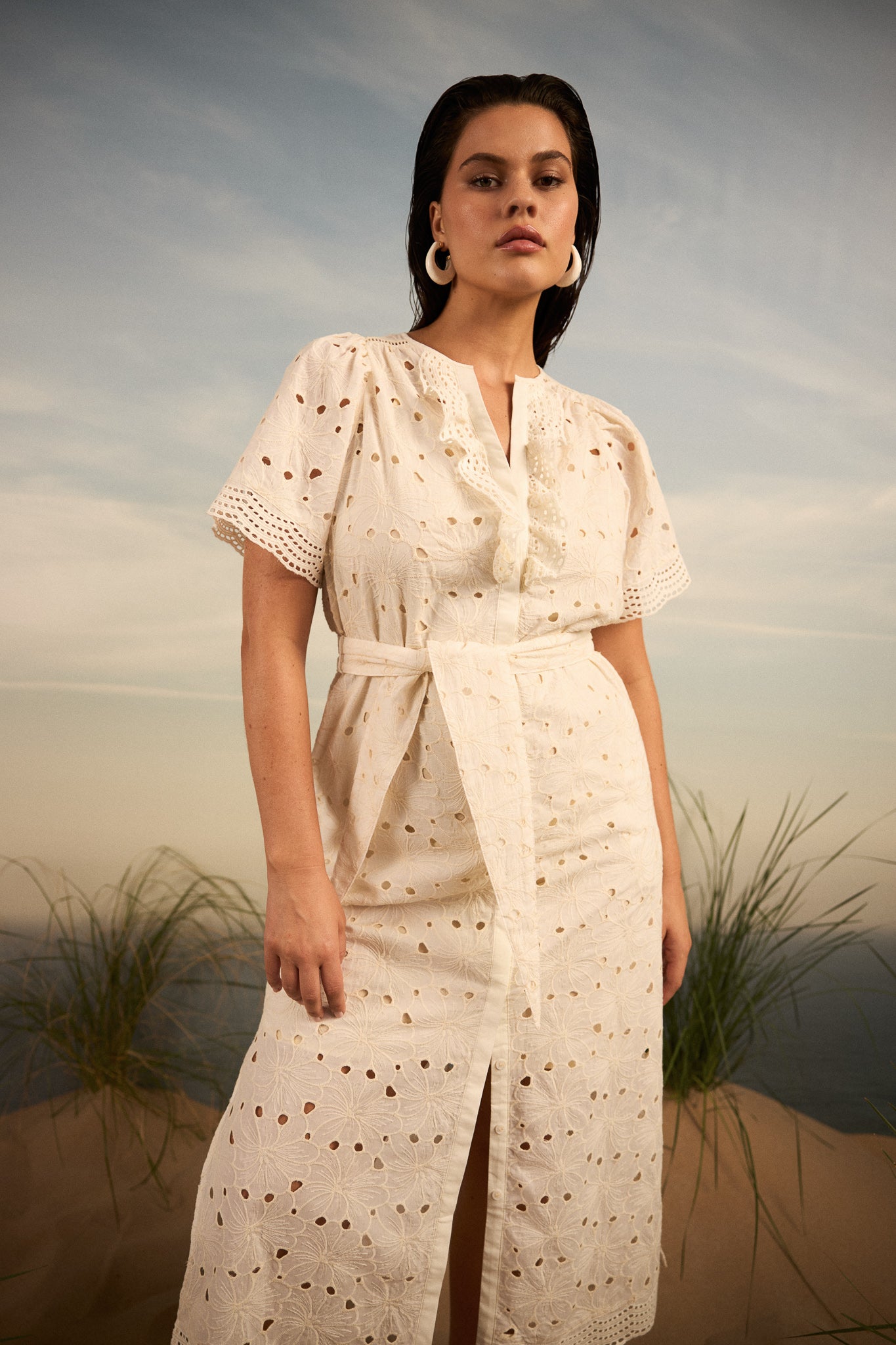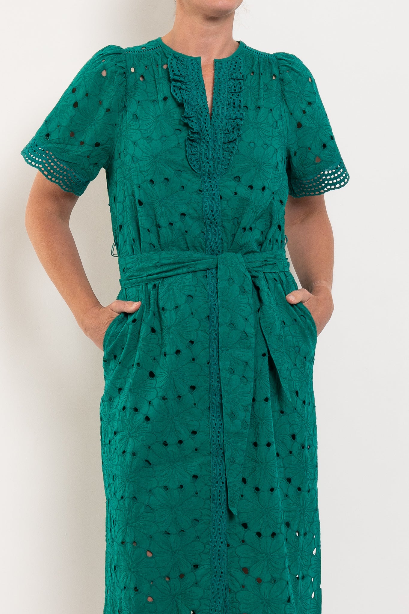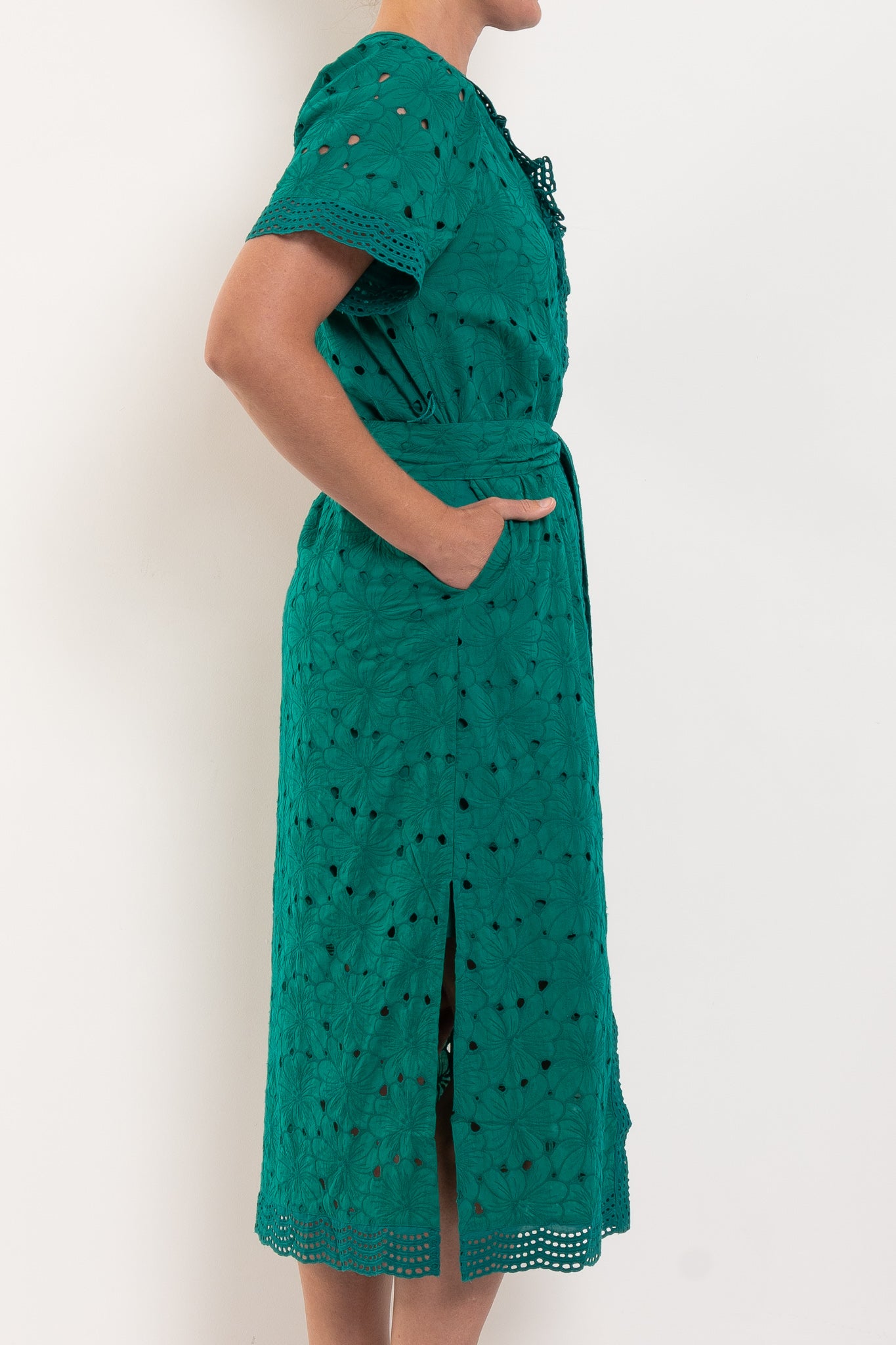 Crafted in intricate embroidered cotton with a softly structured drape, the Voyage Dress features delicate lace trim, short sleeves, and a refined split neckline framed with frill detailing. The optional self-tie belt lets you choose between a cinched waist or relaxed silhouette, while side splits at the hem keep it breezy and wearable. Offered in a striking emerald or fresh cream, it’s the perfect blend of polish and nonchalance — the kind of dress that feels at home everywhere from brunch to barefoot evenings by the sea.